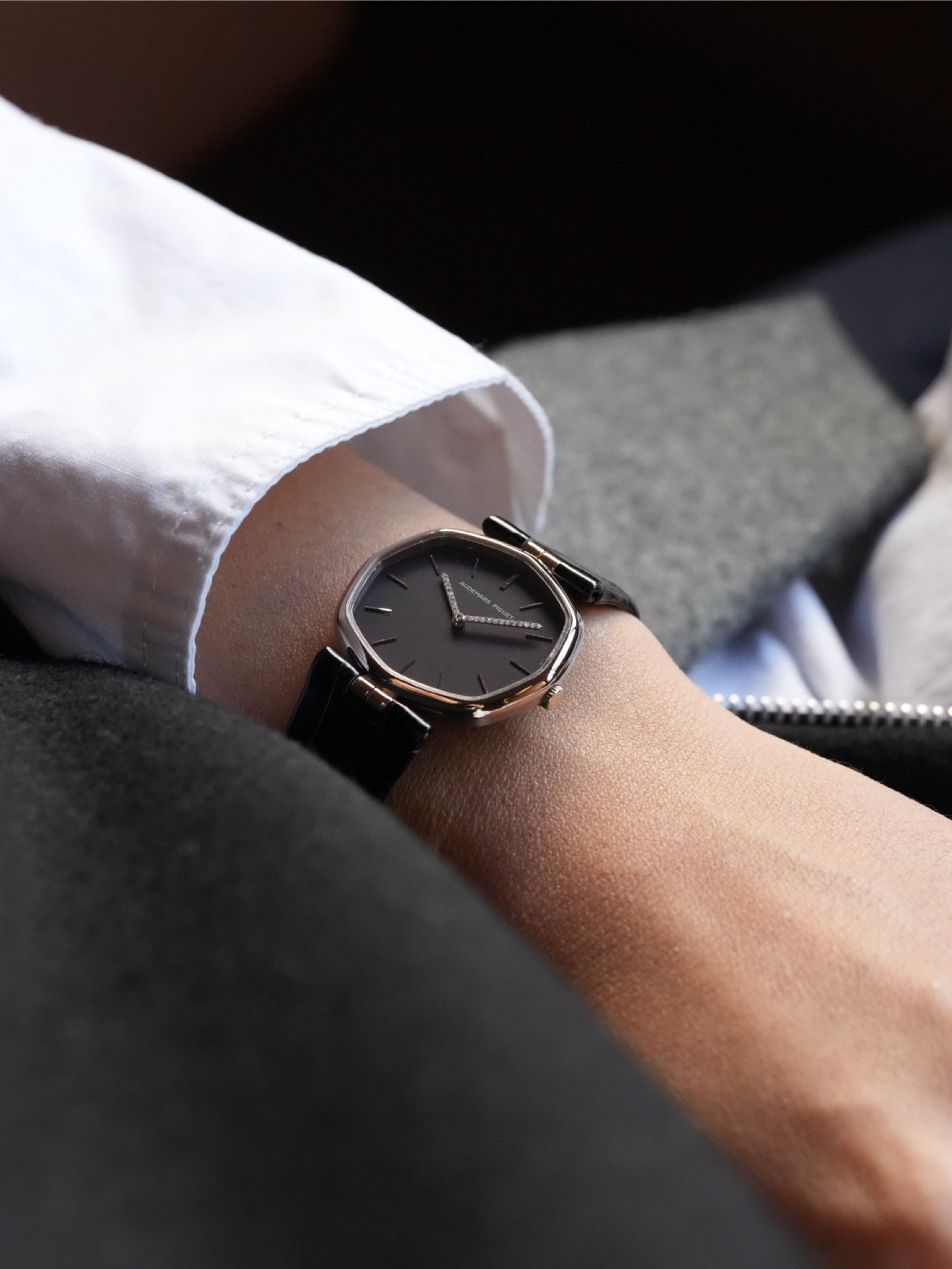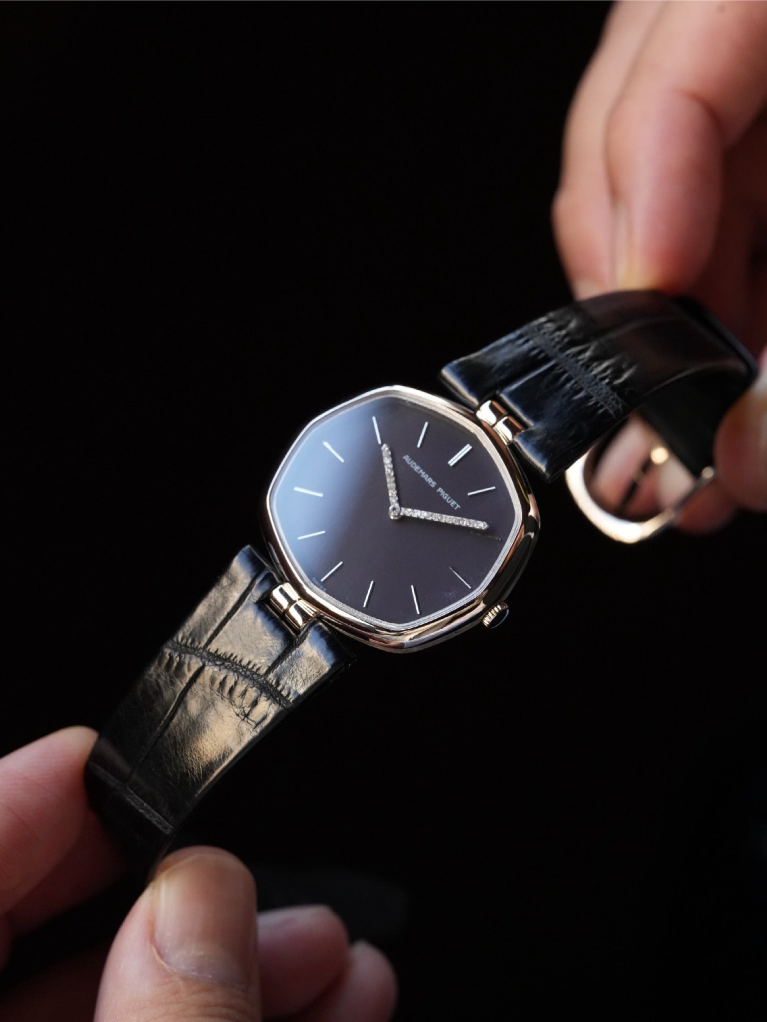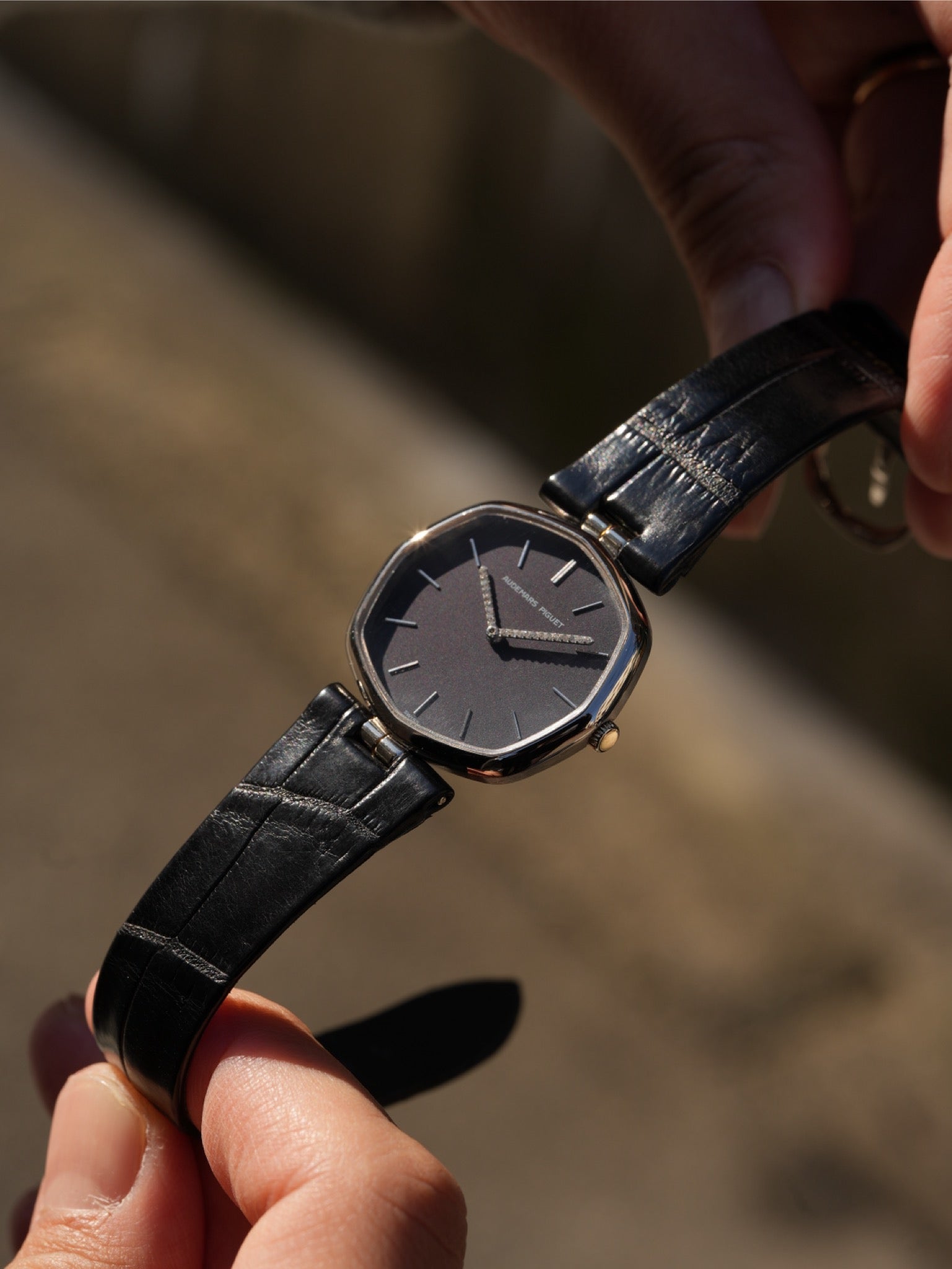 | A refined vintage Audemars Piguet ultra-thin dress watch from the 1970s, featuring an elegant soft octagonal case design. This model represents Audemars Piguet's discreet and sophisticated design language prior to the Royal Oak era. While clearly octagonal in structure, the gently rounded bezel and slim profile give the watch a refined appearance, almost floating often associated with the Disco Volante aesthetic of the period. The minimalist dark dial is accented by baton hour markers and an exceptional detail: a diamond-set minute hand, a subtle expression of luxury typical of high-end Audemars Piguet dress watches from this era. Powered by an ultra-thin hand-wound movement (likely Cal. 2003), renowned for its elegance and shared heritage among the finest Swiss manufactures. An understated yet highly collectible piece, ideal for collectors seeking Audemars Piguet's pure dress-watch identity before the rise of luxury sports watches. ⸻ Details • Brand: Audemars Piguet • Era: 1970s • Case: Soft octagonal case • Movement: Hand-wound ultra-thin • Dial: Dark dial with diamond-set minute hand • Strap: Leather (replacement) |