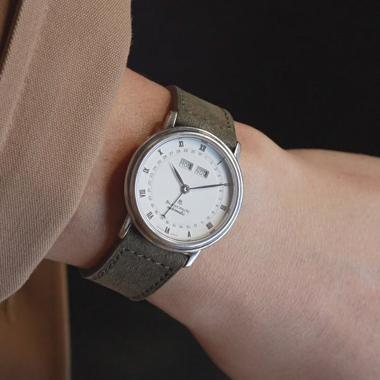 | Blancpain Villeret Triple Calendar – Platinum 950 This Blancpain Villeret Triple Calendar is a refined example of the brand's dedication to classical watchmaking and understated luxury. Crafted in 950 platinum, the case offers a discreet yet unmistakable sense of weight and exclusivity that only platinum can provide. The watch features a beautifully balanced triple calendar display, showing the day, date, and month, a complication deeply rooted in traditional haute horlogerie. The clean white dial, elegant hands, and timeless proportions reflect the pure aesthetic philosophy of the Villeret collection—named after Blancpain's birthplace. Powered by a Blancpain in-house movement, this timepiece embodies the manufacture's long-standing automatic commitment to mechanical watchmaking, proudly maintaining its tradition of producing only mechanical watches since 1735. With its classical case size and noble material, this model is particularly appealing to discerning collectors who value quiet sophistication over overt statements. The platinum Villeret Triple Calendar is not a watch for everyone—but for those who understand, it speaks volumes. Details Brand: Blancpain Collection: Villeret Case Material: Platinum 950 Movement: Automatic (in-house) Functions: Day, Date, Month (Triple Calendar) Case Diameter: approx. 33.5 mm Dial: White Gender: Men's A timeless dress watch that represents Blancpain's heritage, precision, and restrained elegance. |