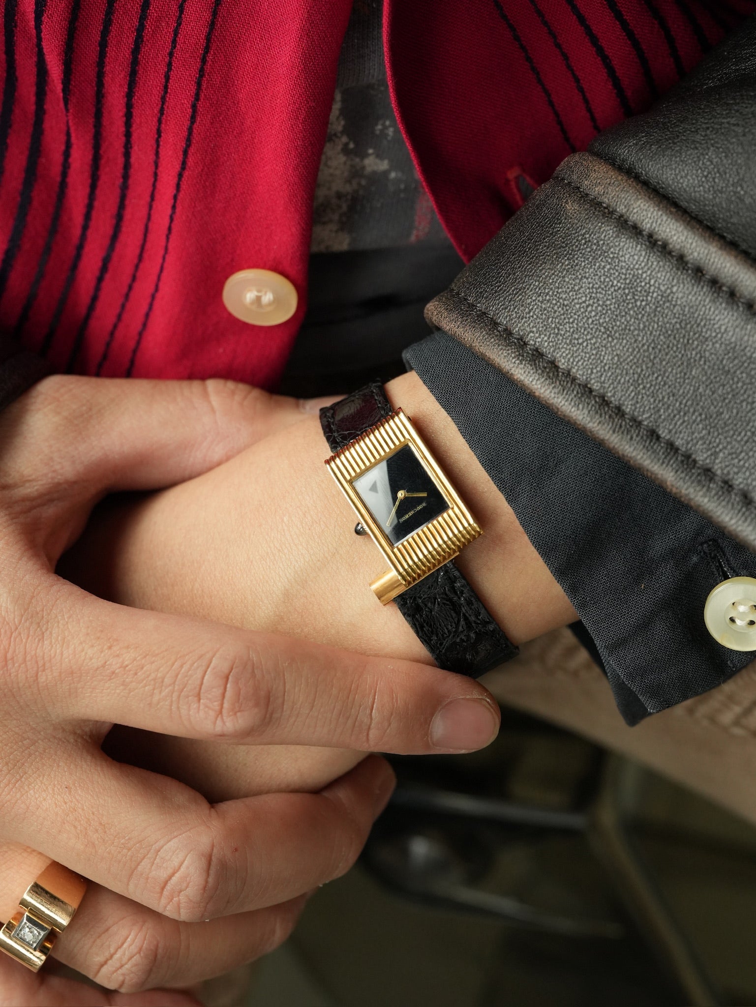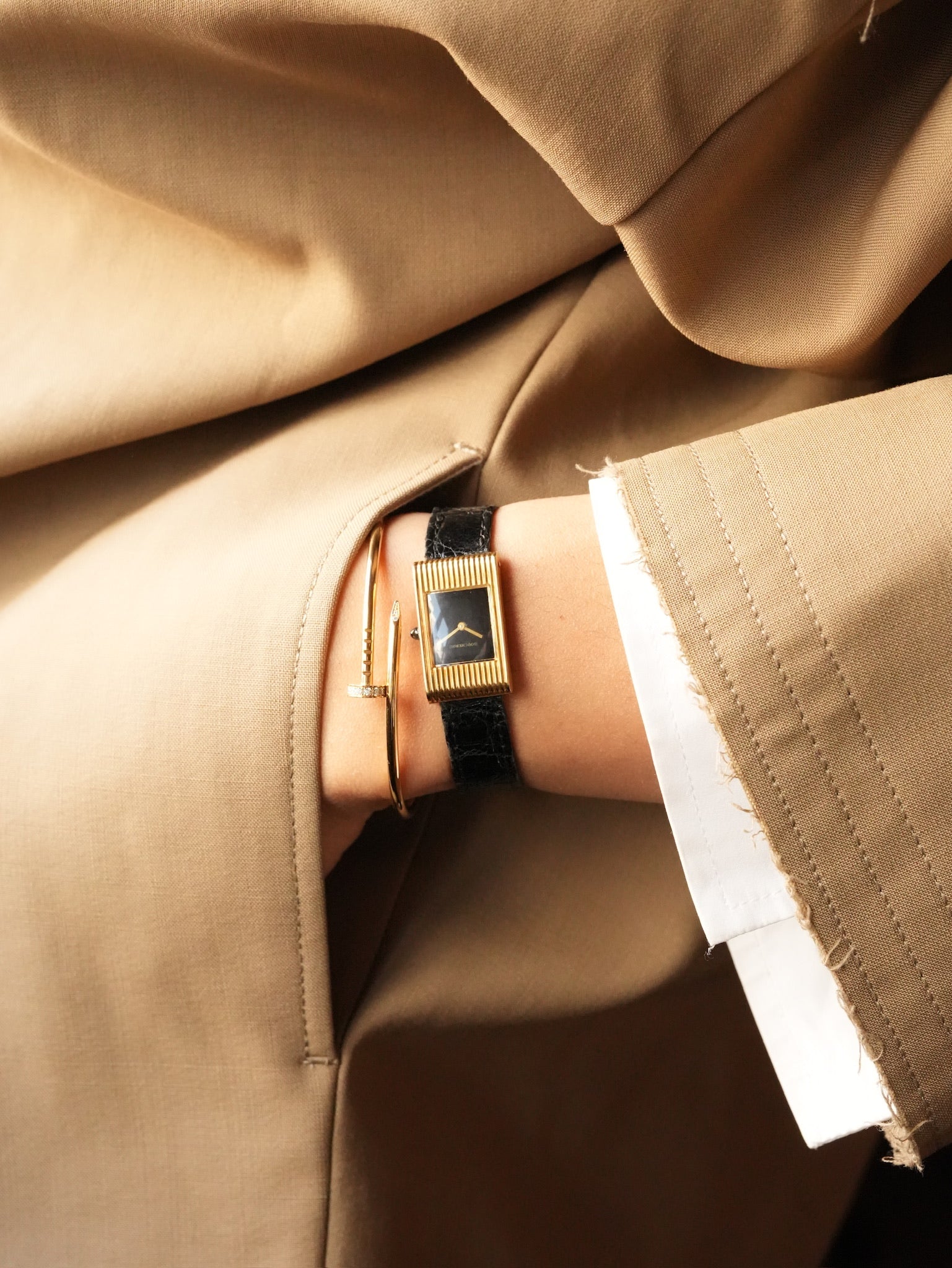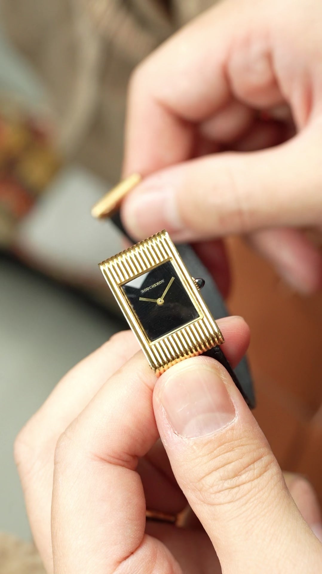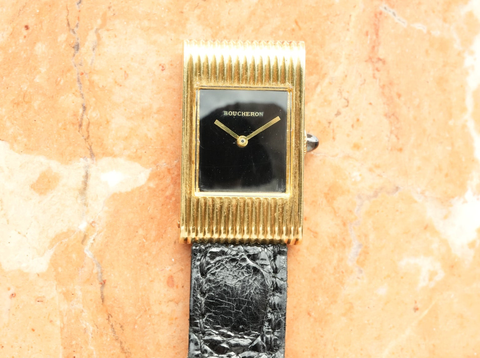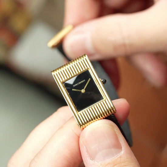 | Boucheron Vintage Watch – 1970s Manual Wind with Black Lacquer Dial A beautiful vintage watch by Boucheron, dating to the 1970s, representing the era when French high-jewelry houses were producing some of the most distinctive and elegant dress watches. The case features a strongly sculpted ribbed gold design, a style often seen in high-end jewelry watches of the period, alongside creations from Cartier, Piaget, and Chaumet. The vertical fluted finishing gives the watch a bold yet refined presence, characteristic of 1970s French jewelry watch design. Inside, the watch is powered by a manual wind Swiss movement with 17 jewels, signed for Boucheron. Unlike later quartz models, this mechanical movement reflects the higher-grade production typical of earlier jewelry watches. The dial is finished in a deep black lacquer, creating a rich glossy surface that contrasts beautifully with the warm gold case. This type of lacquer dial was frequently used in the 1970s for high-jewelry watches, offering a sleek and sophisticated look without the heaviness of stone dials. Vintage Boucheron watches from this period were produced in relatively small numbers, and examples combining • 1970s production • Manual wind movement • Ribbed gold case • Black lacquer dial are rarely seen on the market today. This piece perfectly captures the spirit of the time, when Parisian jewelry houses approached watchmaking as an extension of haute joailerie, focusing on design, materials, and elegance rather than mass production. A true vintage jewelry watch, and a very collectible example from one of the great French maisons. |