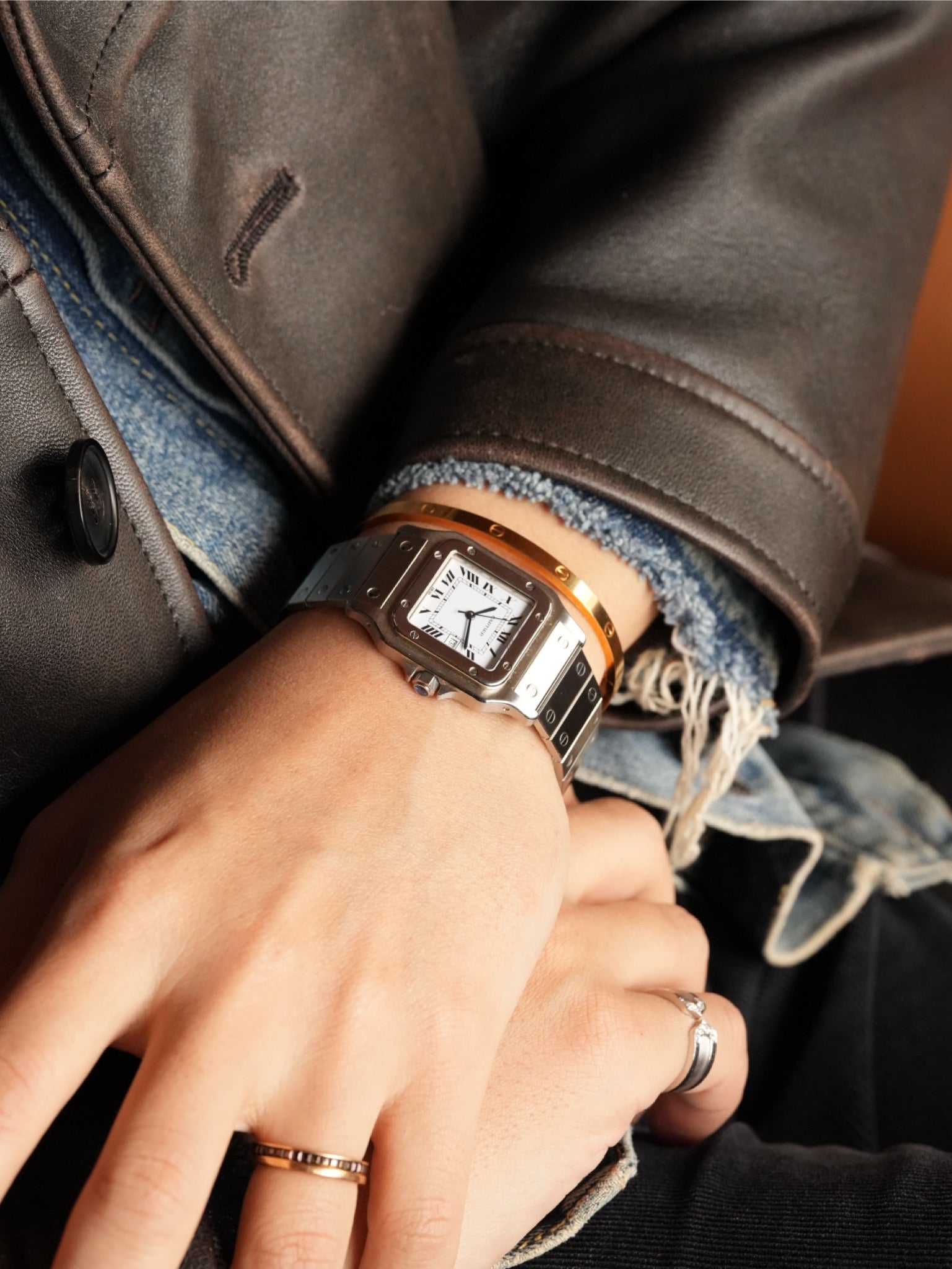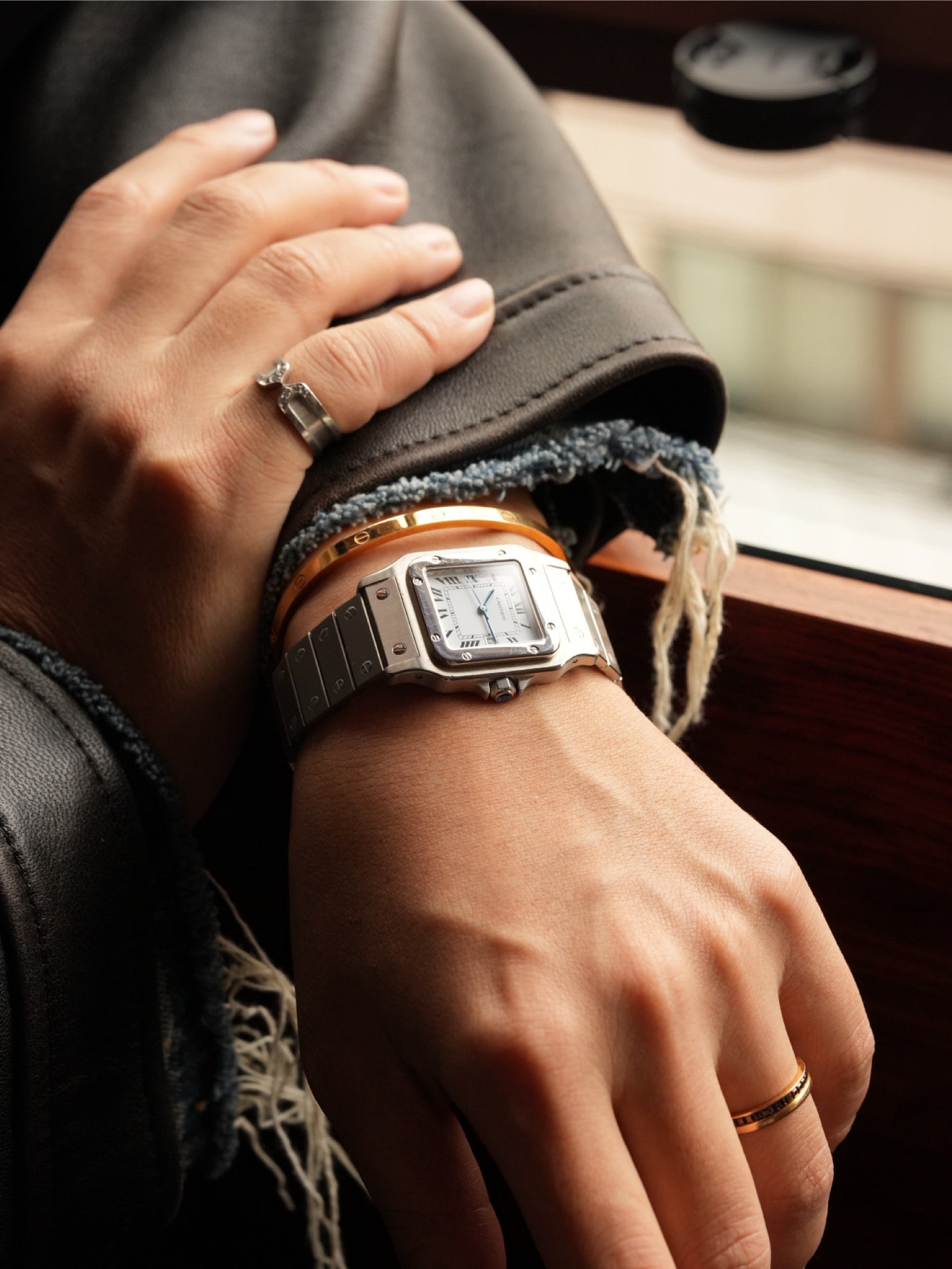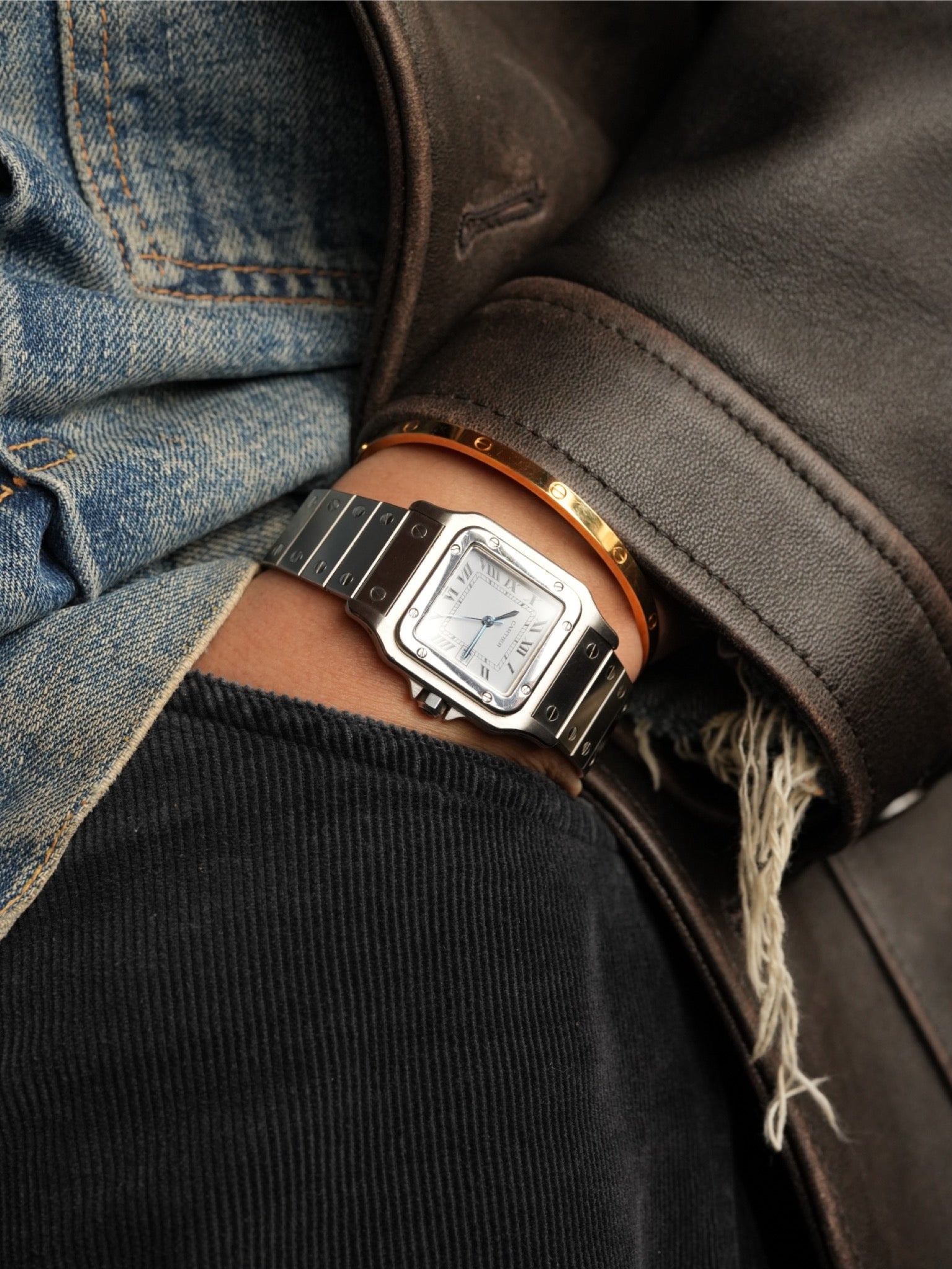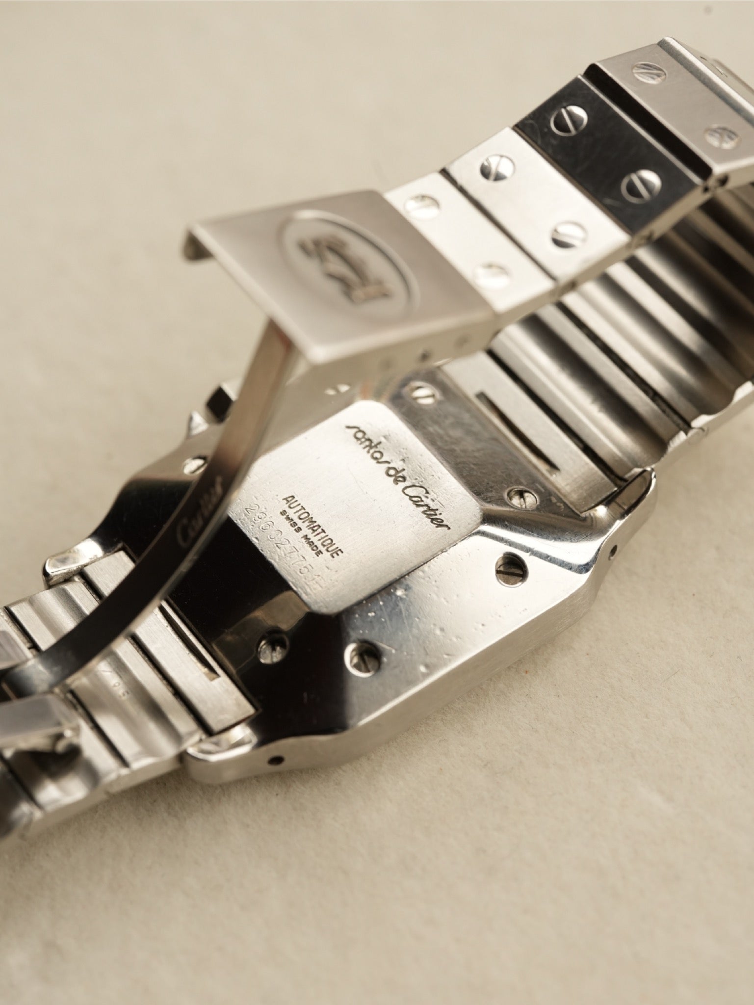 | Cartier Santos Carrée Ref. 2960 Offered here is a beautiful example of the iconic Cartier Santos Carrée, reference 2960, dating from the 1980s. This is the desirable LM (Large Model) with a 29mm case, featuring the classic integrated bracelet design that defines the Santos line. The watch is powered by an automatic movement and remains in unpolished condition, preserving the original factory and lines sharp edges of the case and bracelet. The overall condition is very good, showing only light, honest signs of wear consistent with age. The bracelet fits a 16cm wrist and includes two additional links for easy adjustment. This piece is offered as a full set, including original box and papers—an increasingly rare and collectible configuration for this reference. A timeless Cartier sports icon, ideal for both daily wear and long-term collection. |