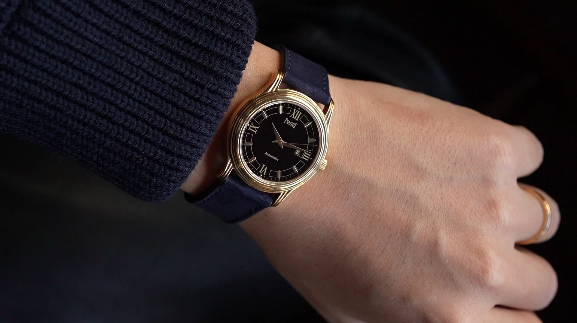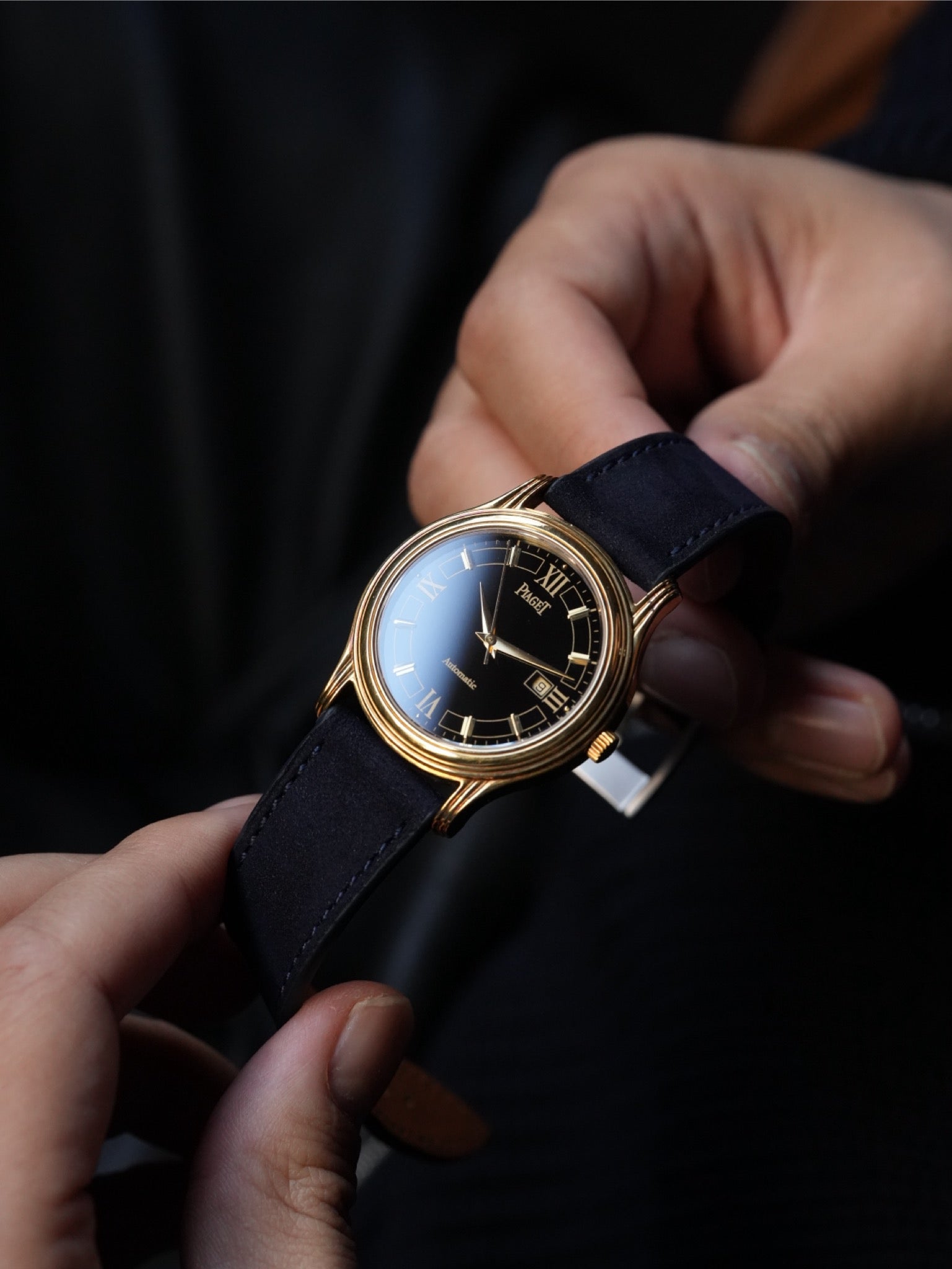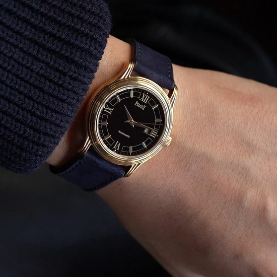 | Inside beats an in-house ultra-thin automatic caliber—a rarity, since most lapis models from this era were hand-wound. This movement allows for daily use without sacrificing elegance. The case back bears clean “Automatic” and serial engravings that confirm authenticity. We've paired this watch with a Bordeaux saffiano leather strap by Molequin. The deep red tone and textured finish add a contemporary touch, while the subtle stitching brings out the dial's vibrant blue. Together, they create a refined contrast that feels distinctive and modern. Another highlight is its excellent condition. Onyx dials are prone to cracking, but this one is beautifully preserved without fractures or chips. The gold-tone indices and hands remain vivid, and the case edges are crisp, underscoring its originality. 【Details】 80s 18YG AT 34mm Watch only Excellent condition |