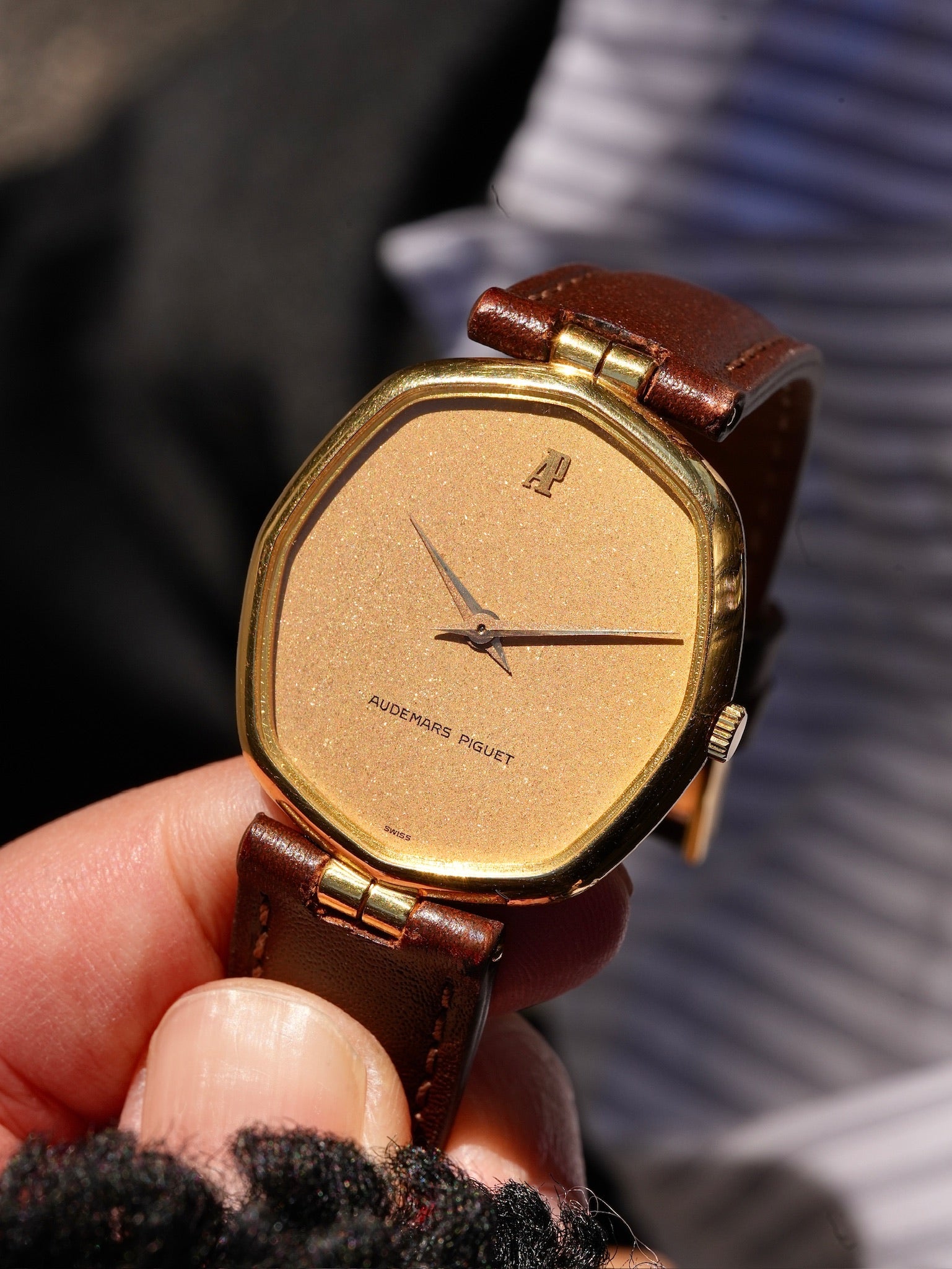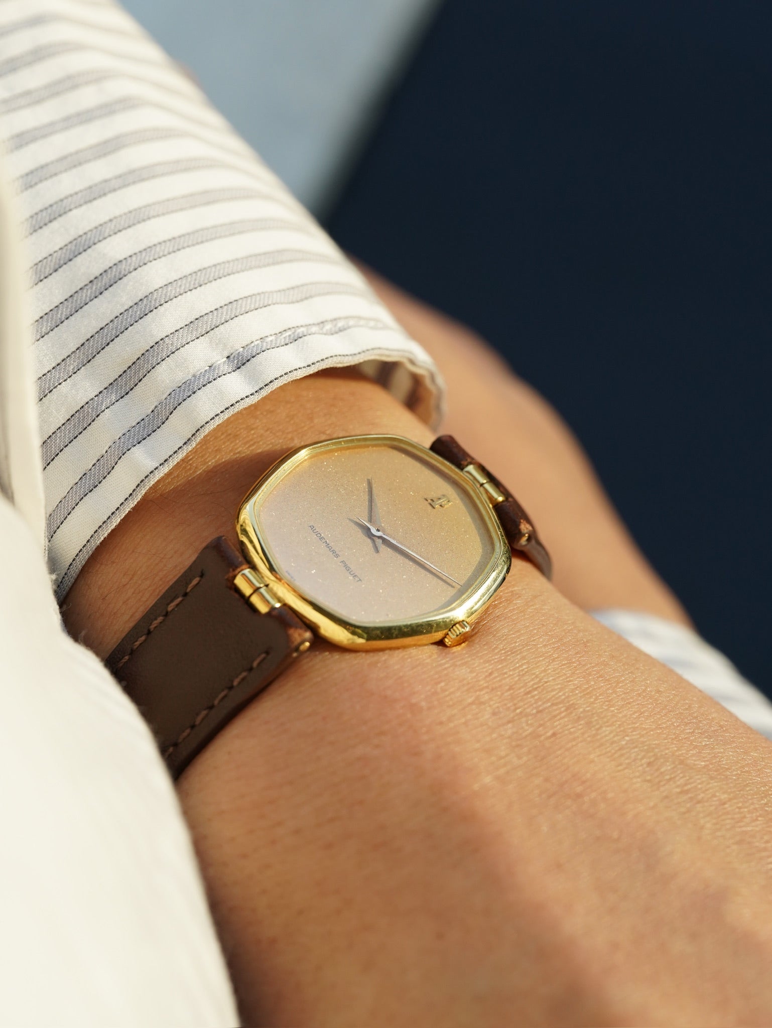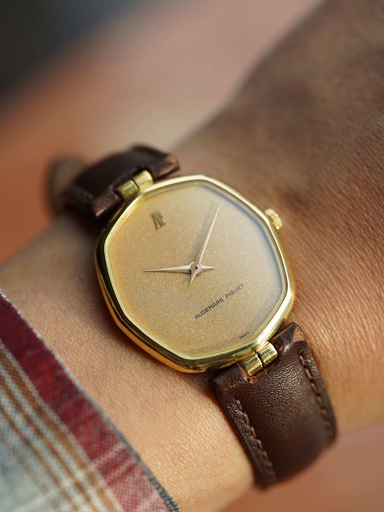 | Audemars Piguet Octagonal Watch – Pre-Royal Oak Era with Aventurine-Style Dial A rare 1970s Audemars Piguet octagonal case watch, representing the important design period just before the introduction of the Royal Oak. Pieces like this belong to what collectors often refer to as the pre-Royal Oak era, when Audemars Piguet was already experimenting with geometric case shapes that would later define the brand's modern identity. Before the Royal Oak was in 1972, Audemars Piguet produced a number of elegant dress watches with multi-faceted and octagonal cases, and this model clearly released that transitional design language. Rather than the sporty construction of the Royal Oak, the watch retains the refined proportions of a classic ultra-thin dress watch, while still showing the brand's early interest in architectural forms. The softly rounded octagonal case gives the watch a distinctive presence without being overly aggressive, a characteristic typical of high-end Swiss dress watches from the early 1970s. The dial features a shimmering aventurine-style textured finish, creating a sparkling surface that changes depending on the light. This type of decorative dial was occasionally used by Audemars Piguet during the 1970s, reflecting the strong influence of jewelry watch design during that period. Vintage Audemars Piguet watches from this era were produced in very small numbers, and examples combining • Pre-Royal Oak production • Octagonal case • Gold case • textured aventurine-like dial are rarely encountered today. More than just a dress watch, this piece represents an important moment in Audemars Piguet's design history, showing the aesthetic direction that ultimately led to the creation of the Royal Oak. A highly collectible vintage AP from the transitional period of the early 1970s. |