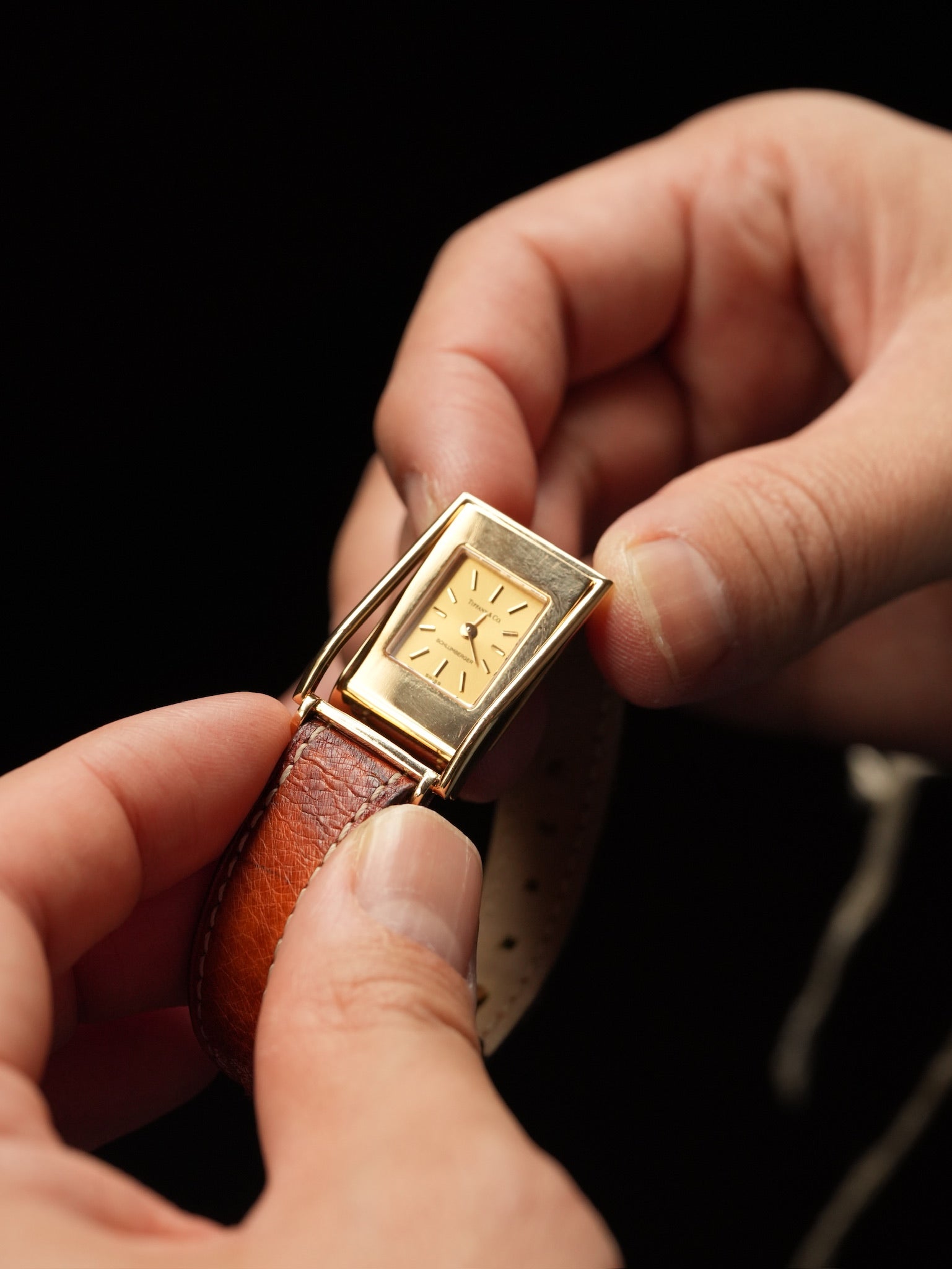 | Tiffany & Co. Schlumberger Watch with Movable Frame – Full Set A highly unusual vintage Tiffany & Co. Schlumberger watch, dating to the 1970s, representing one of the rarest lines ever produced by the maison. Unlike standard Tiffany watches, this model belongs to the special collection associated with Jean Schlumberger, the legendary designer responsible for some of Tiffany & Co.'s most iconic high jewelry creations. Watches bearing the Schlumberger name were produced in very limited numbers, and examples rarely appear on the market today. The most distinctive feature of this piece is its movable outer frame construction, a unique case design not seen on conventional dress watches. This sculptural structure reflects Schlumberger's jewelry-oriented approach, combining mechanical function with decorative form, and giving the watch a presence closer to haute joaillerie than traditional watchmaking. The dial is signed TIFFANY & CO / SCHLUMBERGER, a double signature that is rarely found and highly sought after by collectors of vintage Tiffany timepieces. In addition, this example is offered as a full set, which is exceptionally rare for Schlumberger watches from this period. Complete sets for vintage Tiffany pieces rarely survive, making this an especially desirable example. With the combination of • Schlumberger signature • movable frame case construction • Gold case • Vintage original dial • full set this watch represents one of the most collectible Tiffany & Co. vintage watches available today. A true collector's piece, and a rare example of Tiffany's high-jewelry design translated into a wristwatch. |