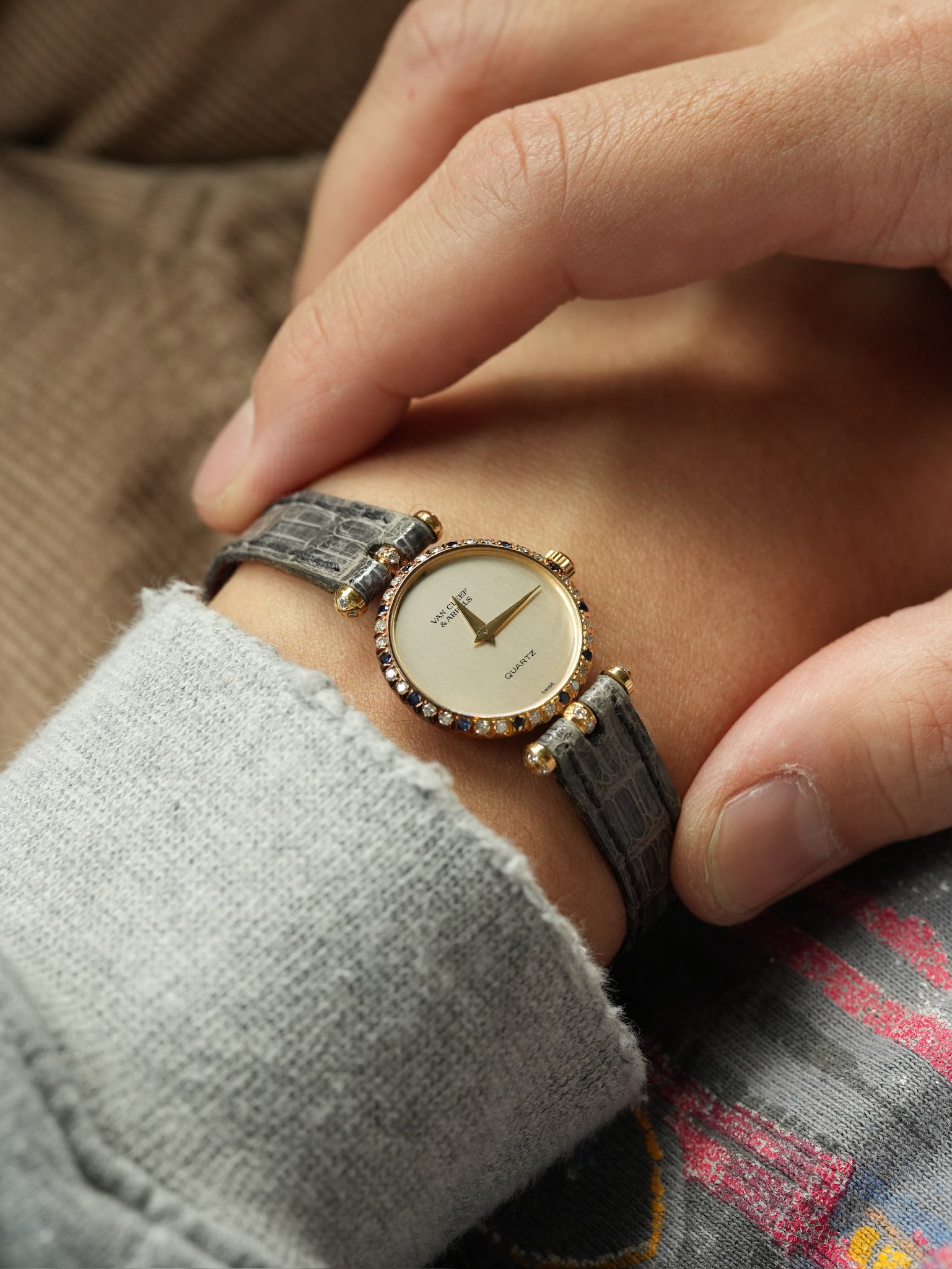 | The Van Cleef & Arpels diamond and sapphire bezel watch is a beautiful example of the maison's approach to watchmaking, where timepieces are treated as fine jewelry rather than simple instruments. Crafted in yellow gold, the watch features a delicate round case surrounded by a bezel set with alternating diamonds and blue sapphires, creating a subtle yet luxurious contrast that reflects the refined aesthetic of Van Cleef & Arpels during the late 20th century. Unlike sport-oriented watches, this piece was designed with elegance in mind. The clean dial, minimal hands, and small proportions emphasize the jewelry-like character, making it closer to a bracelet or ring than a traditional wristwatch. The use of a quartz movement was typical for high-end jewelry watches of this era, allowing for a slimmer case and more freedom in design, which was essential for maisons such as Van Cleef & Arpels, Cartier, and Boucheron when creating sophisticated ladies' models. Details such as the gem-set lugs, refined gold case, and balanced stone setting show the level of craftsmanship expected from a high jewelry house. Today, vintage Van Cleef & Arpels watches like this are appreciated not for complications, but for their design, rarity, and the fact that they represent a time when luxury watchmaking and haute joaillerie were deeply connected. A true vintage jewelry watch — elegant, discreet, and unmistakably Parisian. |