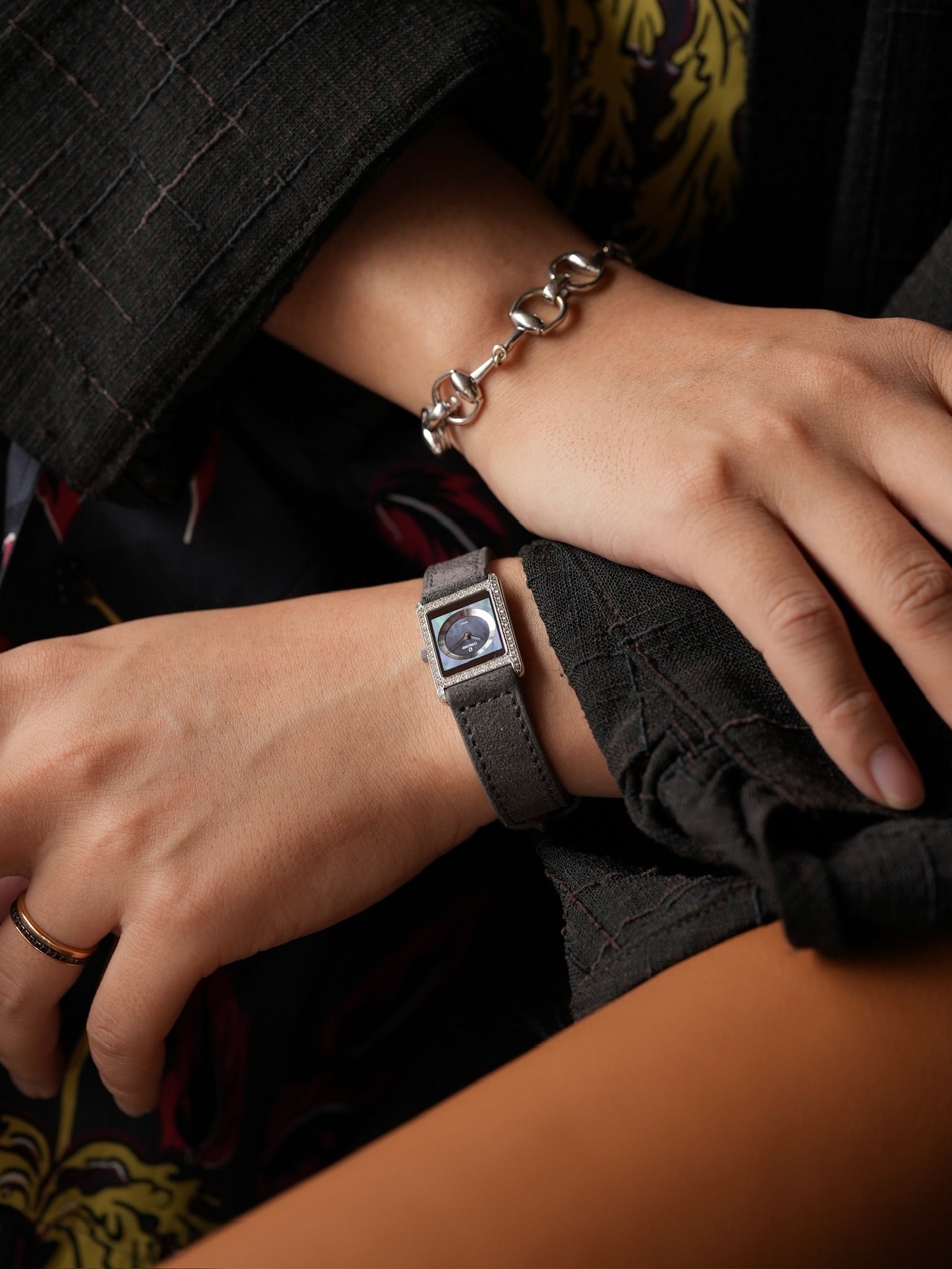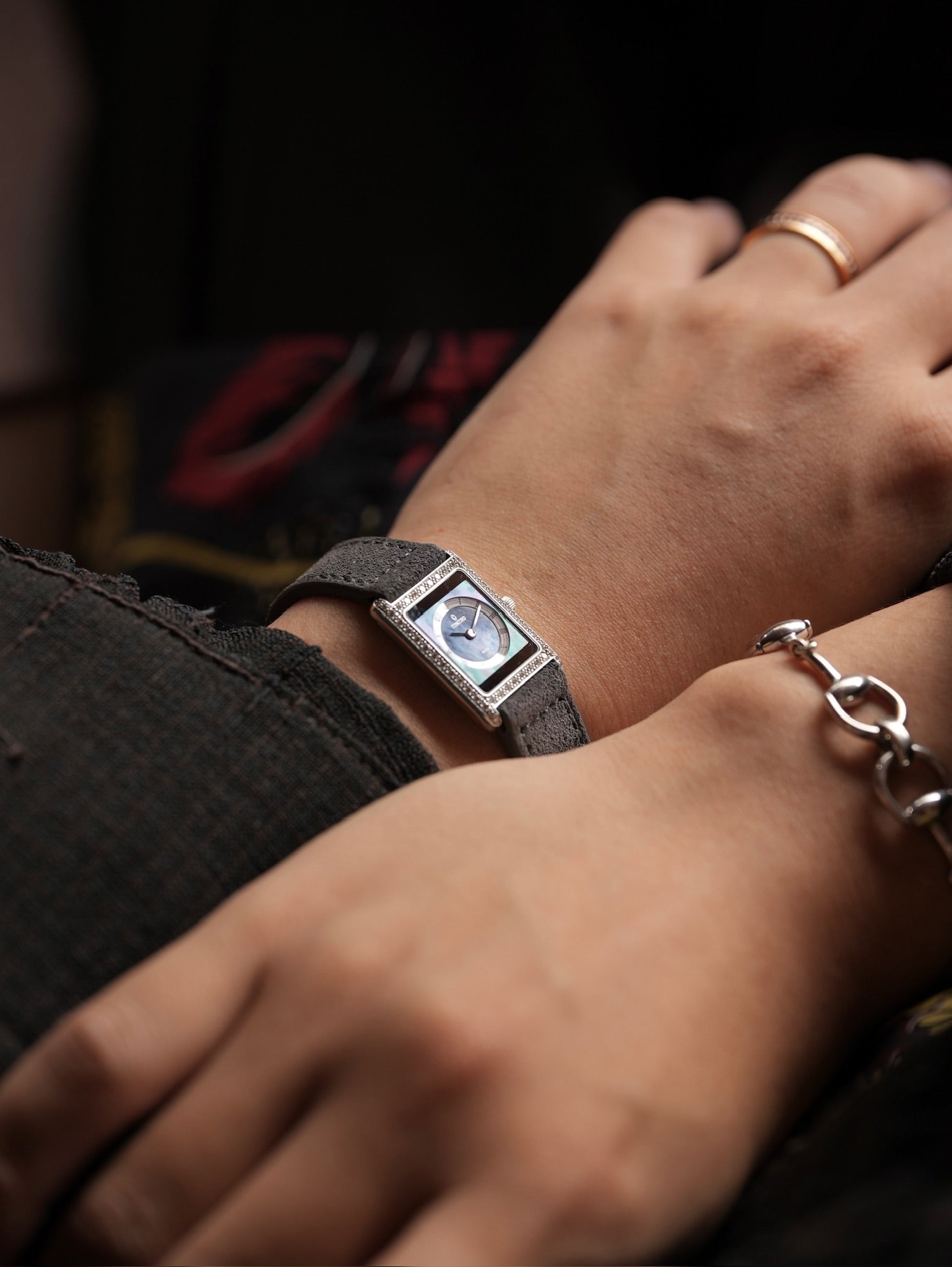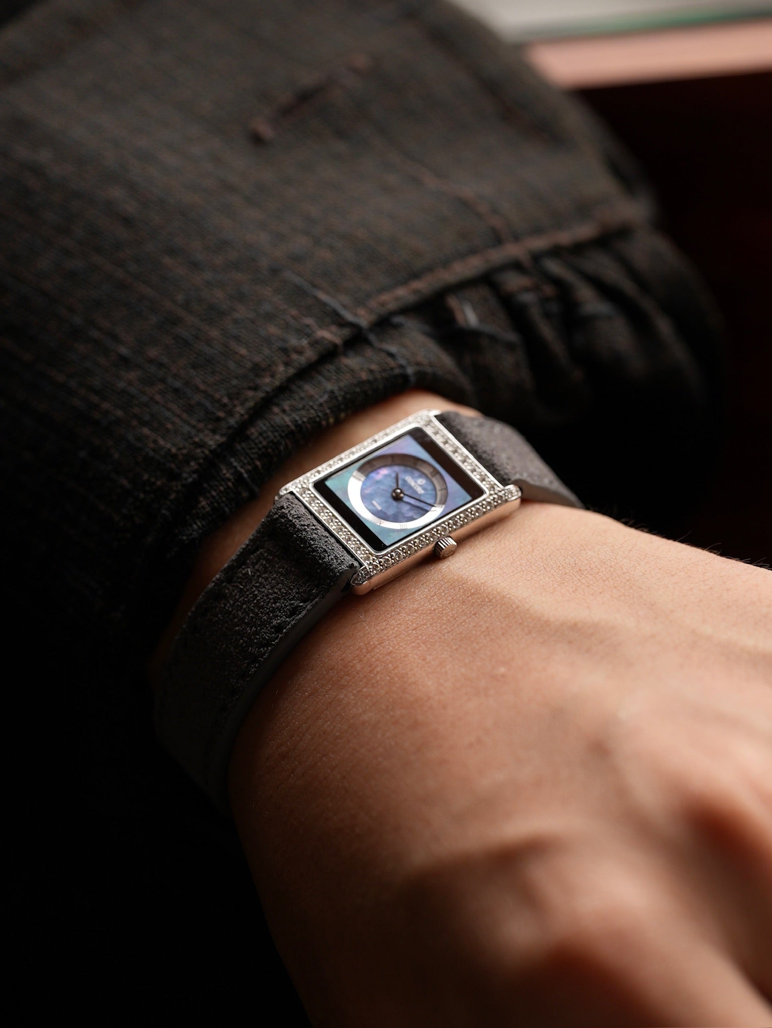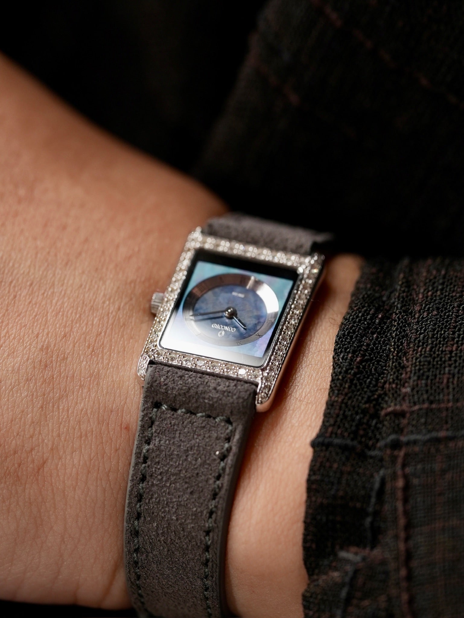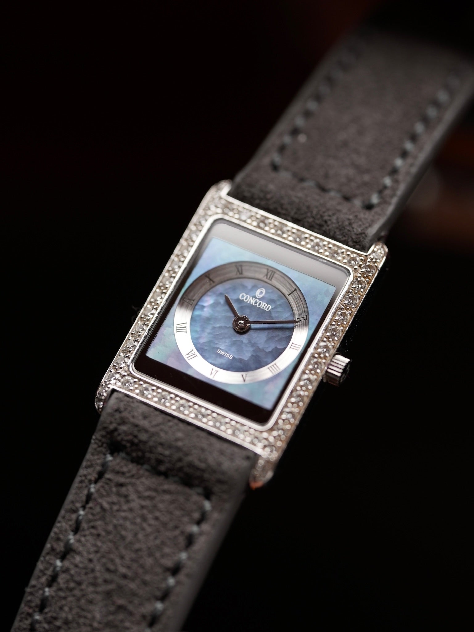 | This is a Concord Delirium, a watch that perfectly embodies the refined elegance and understated luxury of the 1990s. The dial is an exquisite combination of shimmering mother of pearl and deep black onyx, creating a beautiful contrast that instantly catches the eye. Framing this dial is a bezel meticulously set with genuine diamonds that sparkle with every movement, adding a layer of sophistication and brilliance to the piece. Measuring 20 x 25 mm, its proportions are very similar to the Cartier Tank SM, offering a timeless silhouette that feels equally appropriate on both men’s and women’s wrists. This unisex size allows it to be styled in countless ways, whether worn alone for a subtle statement or layered with other jewelry for a more contemporary look. One of the most distinctive details of this watch is the stepped construction of the dial. The raised circular chapter ring creates a subtle sense of three-dimensional depth, lending richness and visual intrigue to the minimalist design. It’s a detail that speaks to the meticulous craftsmanship and thoughtful design language that defined Concord’s approach to watchmaking at the time. In the 1990s, models like the Delirium were among the most coveted jewellery watches, blending Swiss precision with modern flair. Today, there is a growing appreciation for this era’s jeweled timepieces, as collectors and enthusiasts rediscover their quiet glamour and effortless versatility. We believe the Delirium’s harmonious fusion of precious materials, restrained proportions, and distinctive character makes it an underappreciated gem in vintage watch collecting. For those who seek refinement beyond mainstream icons, it offers a unique expression of style that feels as relevant today as it did when it first captivated the world. |