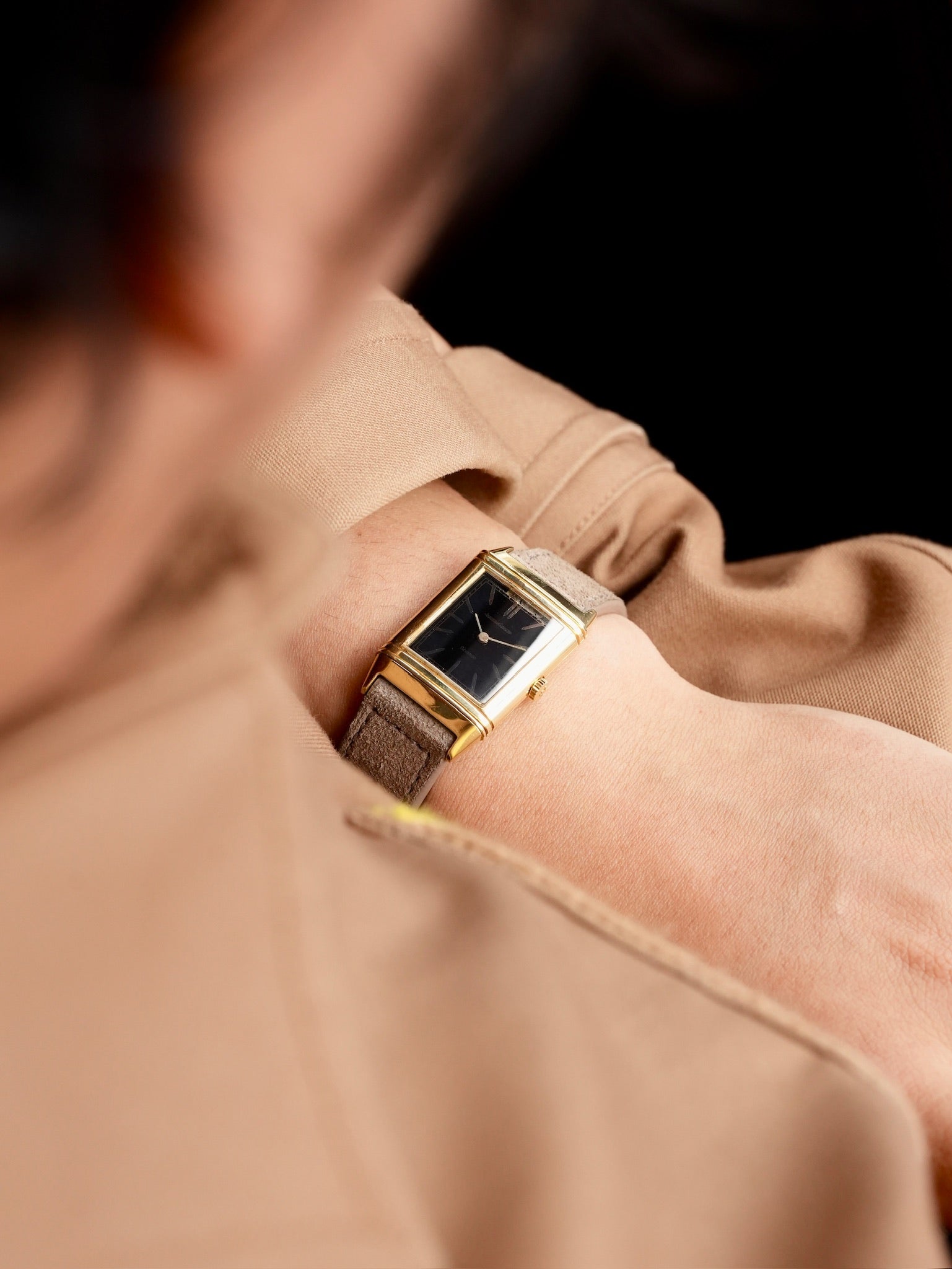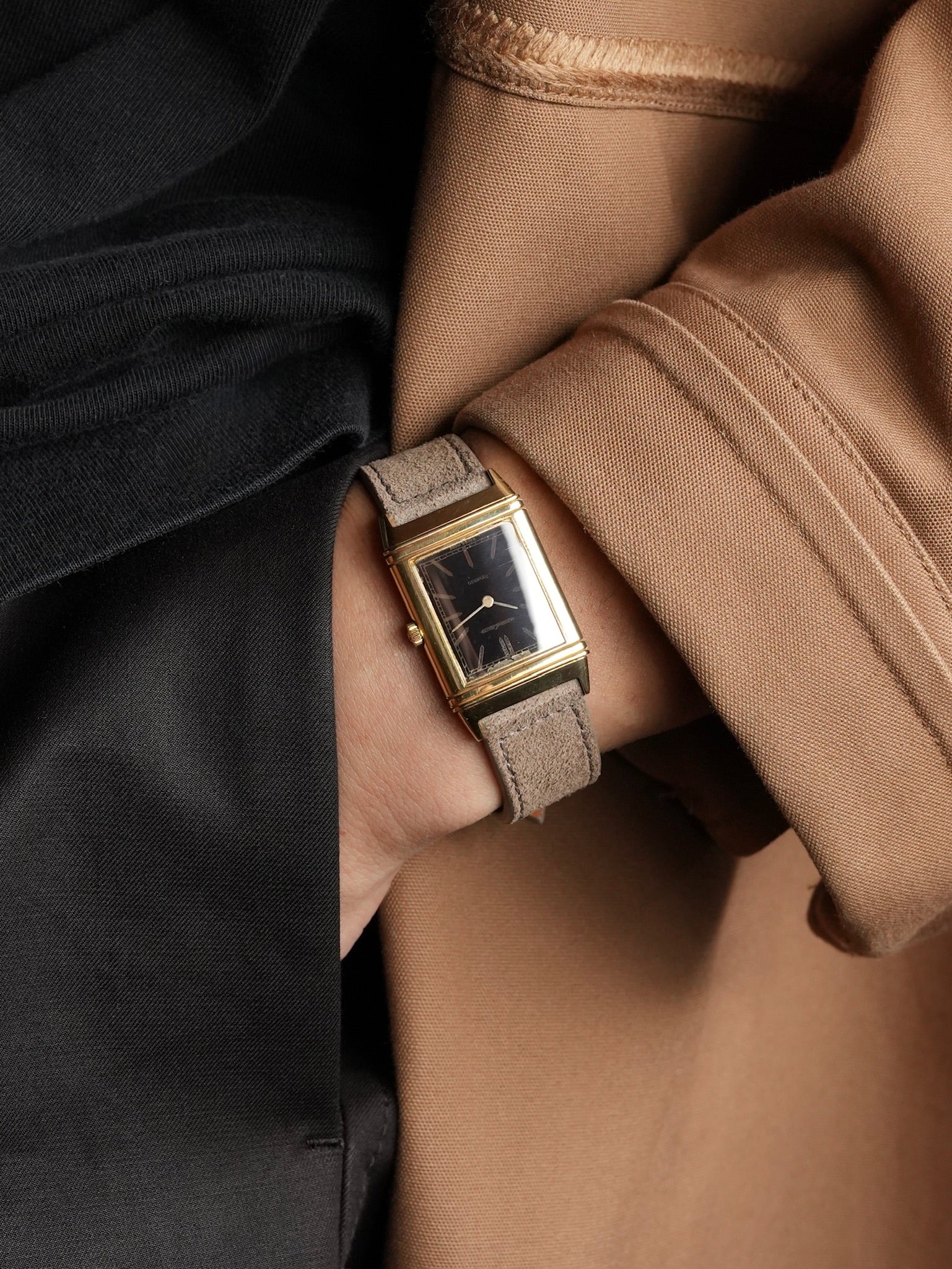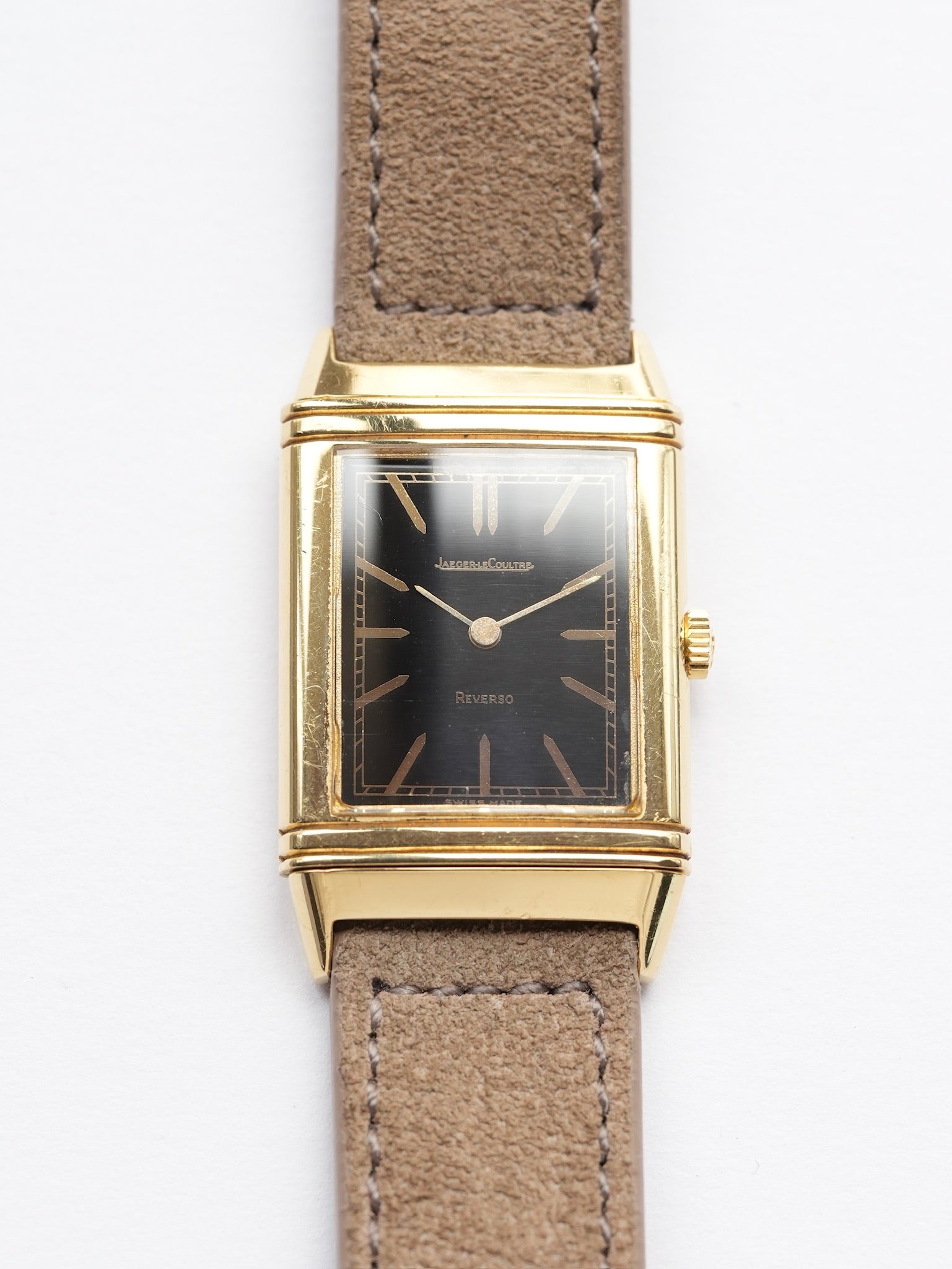 | As time passes, its character only grows deeper. This Jaeger-LeCoultre Reverso, crafted in the 1970s, carries the quiet dignity of a bygone era. Its 23×35mm case is smaller than today’s models, giving it refined proportions and vintage charm. On the wrist, the compact size offers presence without excess. Like a finely made piece of jewelry, it rests naturally against the skin, peeking subtly from beneath a cuff to lend understated elegance. It’s a scale that modern, larger watches can’t replicate. The black dial has gained depth through decades of gentle aging, with subtle tonal shifts and softened luster. Gold-tone hands and indices stand out beautifully against the aged surface, catching light in a restrained yet captivating way. The 18K yellow gold case radiates warmth and richness the moment it touches your hand. Paired with black, the color combination is timeless—softened by age into a mellow glow. Solid gold brings not just weight and luxury, but a patina that tells its own story, something steel cannot match. Introduced in 1931 to protect the dial during polo matches, the Reverso’s reversible case remains its hallmark. This 1970s example stays true to that spirit, with craftsmanship and design language unique to its era. Small gold Reversos from this period are rare, highly sought by collectors. A change of strap transforms its character: suede offers modern ease, while crocodile or calf elevates it to formal elegance. Its size works equally well for men and women, making it truly versatile. A vintage watch is never just a timekeeper. It’s a vessel for stories—of moments lived and eras gone. The quiet sophistication and patina of this Reverso carry those stories forward, inviting a new custodian to continue its journey. 【Detail】 70's 18YG 23×35 Manual winding Watch only |