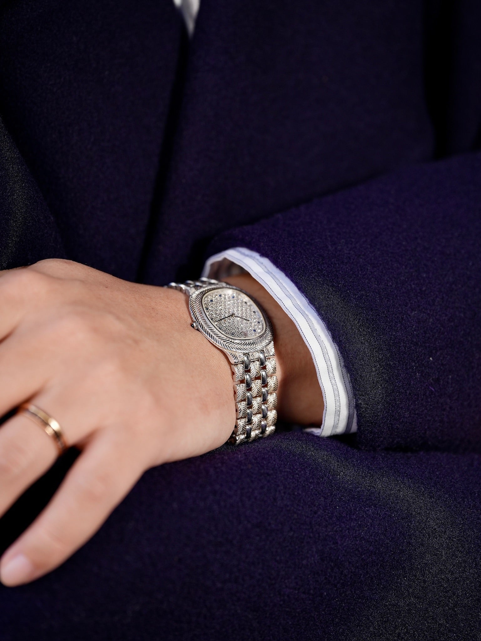 The Audemars Piguet Ref. 56455, crafted in the 1990s, is a full-gold model that had long gone under the radar but has recently regained popularity. This resurgence can be attributed to factors such as the rising prices of models like the “Cobra,” increasing gold values, and the waning trend of luxury sports watches. This model features a white gold case paired with a bracelet intricately textured on its surface, exuding an elegant atmosphere complemented by the substantial weight unique to solid gold. Additionally, the original factory-set diamonds and sapphire indexes enhance its refined design. The feather-like motif extending from the bezel to the bracelet is particularly striking, offering both artistic flair and a distinctive classic look. The case measures 31×33mm, a more compact size compared to contemporary standards, making it an ideal choice for those who appreciate understated elegance. With its ultra-thin case and quartz movement, it combines practicality with aesthetic appeal. The meticulous details reflect Audemars Piguet’s dedication to craftsmanship, making this timepiece not only a functional watch but also a piece of jewelry and a work of art. Its timeless charm and artistic value are likely to be further recognized in the future. |