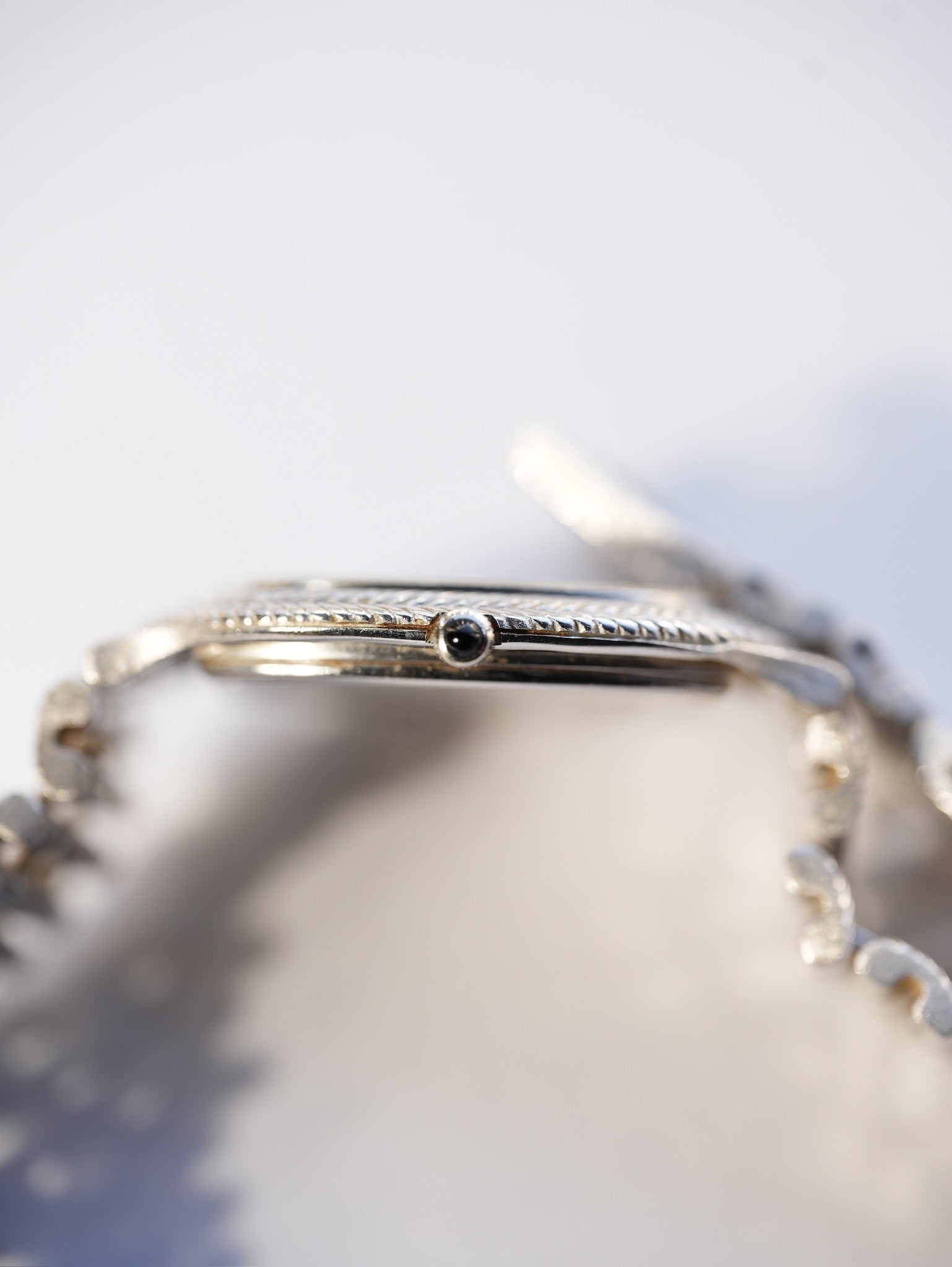 **オーデマ・ピゲ Ref. 56455** 1990年代に製造された**オーデマ・ピゲ Ref. 56455**は、長らく注目を浴びることのなかったフルゴールドモデルですが、近年再び人気を集めています。その復興の背景には、「コブラ」などのモデルの価格高騰、金の価値の上昇、そしてラグジュアリースポーツウォッチのトレンドが落ち着きを見せていることなどが挙げられます。 本モデルは**ホワイトゴールドケース**に、繊細なテクスチャーが施されたブレスレットを組み合わせており、**ソリッドゴールドならではの重厚感**がエレガントな雰囲気を演出します。さらに、**オリジナルのファクトリーセッティングによるダイヤモンドとサファイアインデックス**が、その洗練されたデザインを一層引き立てています。特に、**ベゼルからブレスレットへと流れるように広がるフェザー(羽)モチーフ**は、芸術的な美しさとクラシックな魅力を兼ね備えた、ひと際目を引くディテールです。 ケースサイズは**31×33mm**と、現代の基準と比較するとコンパクトなサイズ感であり、控えめで上品なスタイルを好む方に最適です。また、**超薄型ケース**と**クォーツムーブメント**を採用することで、実用性と美しさを兼ね備えたデザインに仕上がっています。 このタイムピースには、**オーデマ・ピゲの卓越したクラフツマンシップが細部にまで反映**されており、単なる時計としてだけでなく、ジュエリーとして、さらには芸術作品としての価値も備えています。その**時代を超えた魅力と芸術的価値**は、今後さらに高く評価されることでしょう。 |