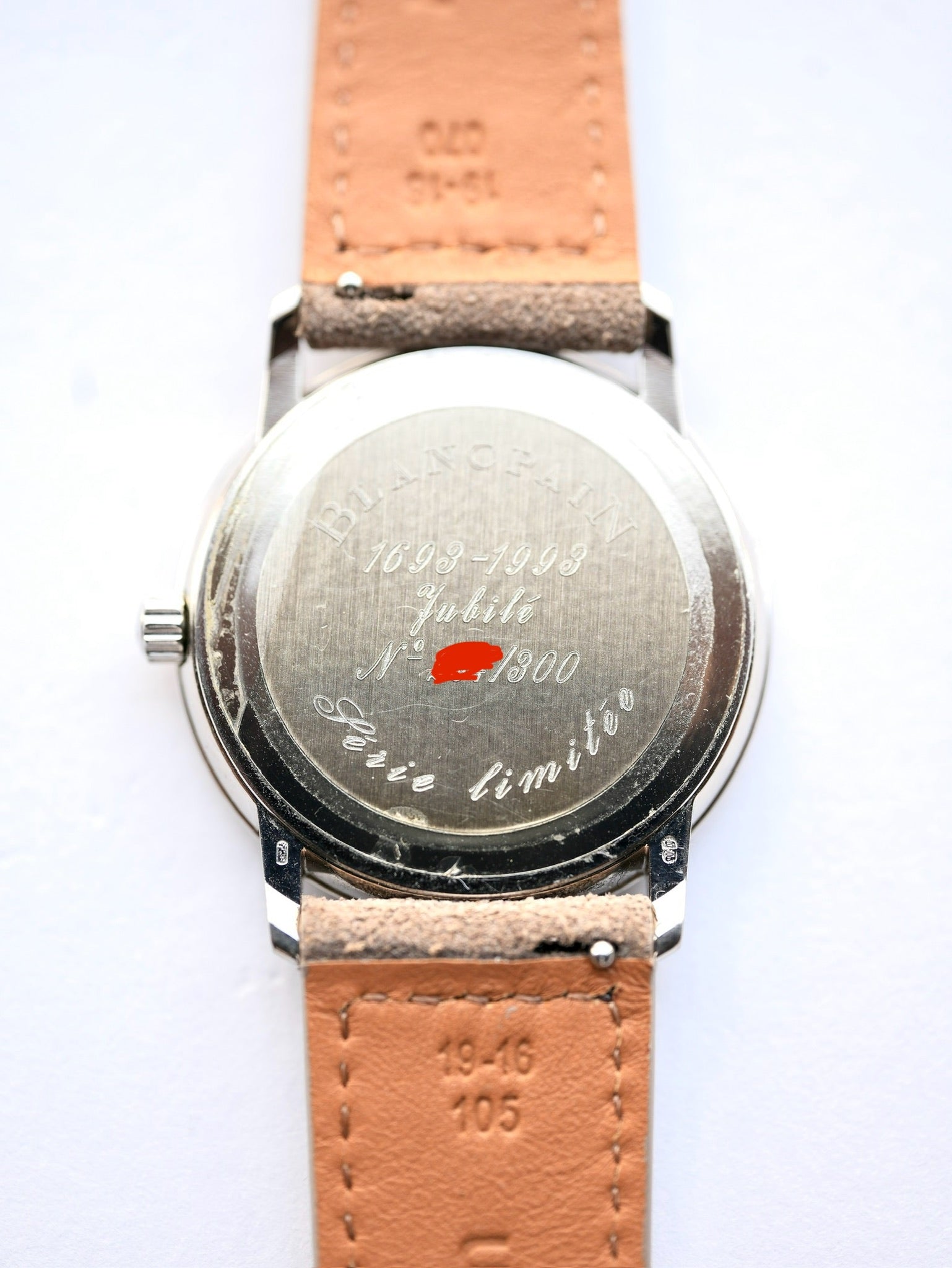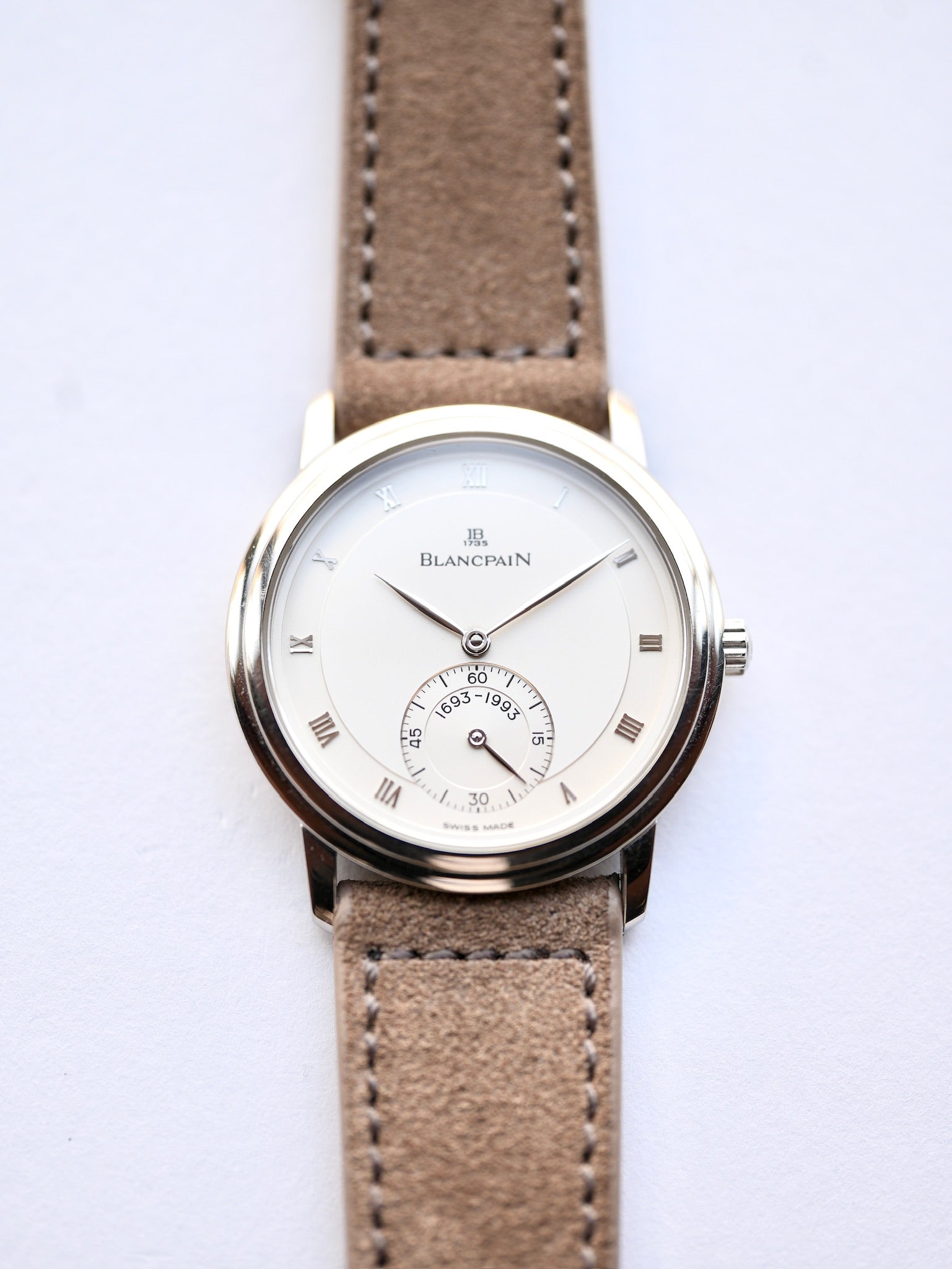 | Released in 1993, this Blancpain is a highly limited anniversary model commemorating the 300th birthday of founder Jacques Blancpain (1693–1993). Crafted in white gold with a classic 34mm case, it embodies both elegance and substance. The dial features applied Roman numeral indexes that offer refined depth and play beautifully with the light. A small seconds sub-dial at 6 o’clock maintains symmetry and adds a subtle layer of functionality. The caseback is engraved with “1693–1993” and “à l’un de 300,” quietly signaling its exclusivity as one of only 300 pieces produced worldwide. At the time, Blancpain—under the direction of Jean-Claude Biver—was deeply committed to reviving traditional mechanical watchmaking, producing timepieces in small numbers with an emphasis on craftsmanship and heritage. This model reflects that philosophy in every detail; it is far more than just a commemorative release. With its classical proportions, rare white gold case, applied markers, and historical significance, this watch is more than a timekeeper—it is a statement. For collectors and connoisseurs alike, it offers not only rarity but also a quiet sense of purpose and pride. A piece that speaks not loudly, but meaningfully. If the watch contains materials restricted by the Washington Convention, such as crocodile leather straps, we will remove those materials before sending the watch overseas. |