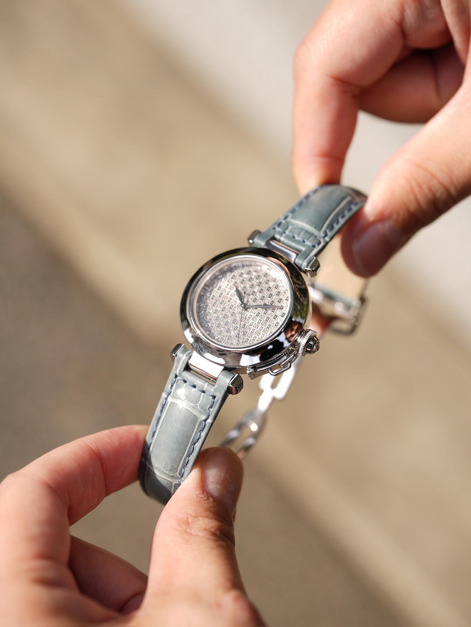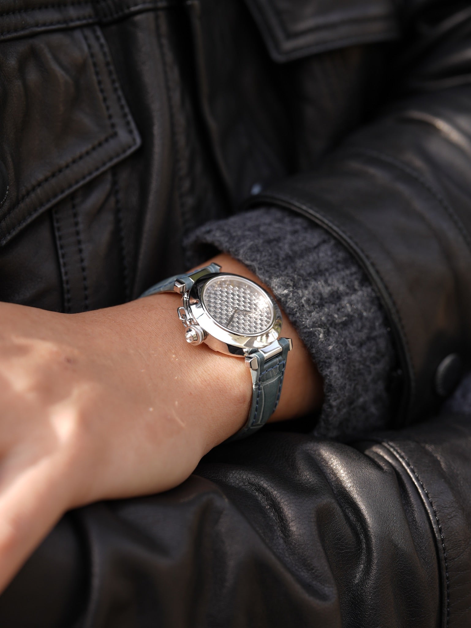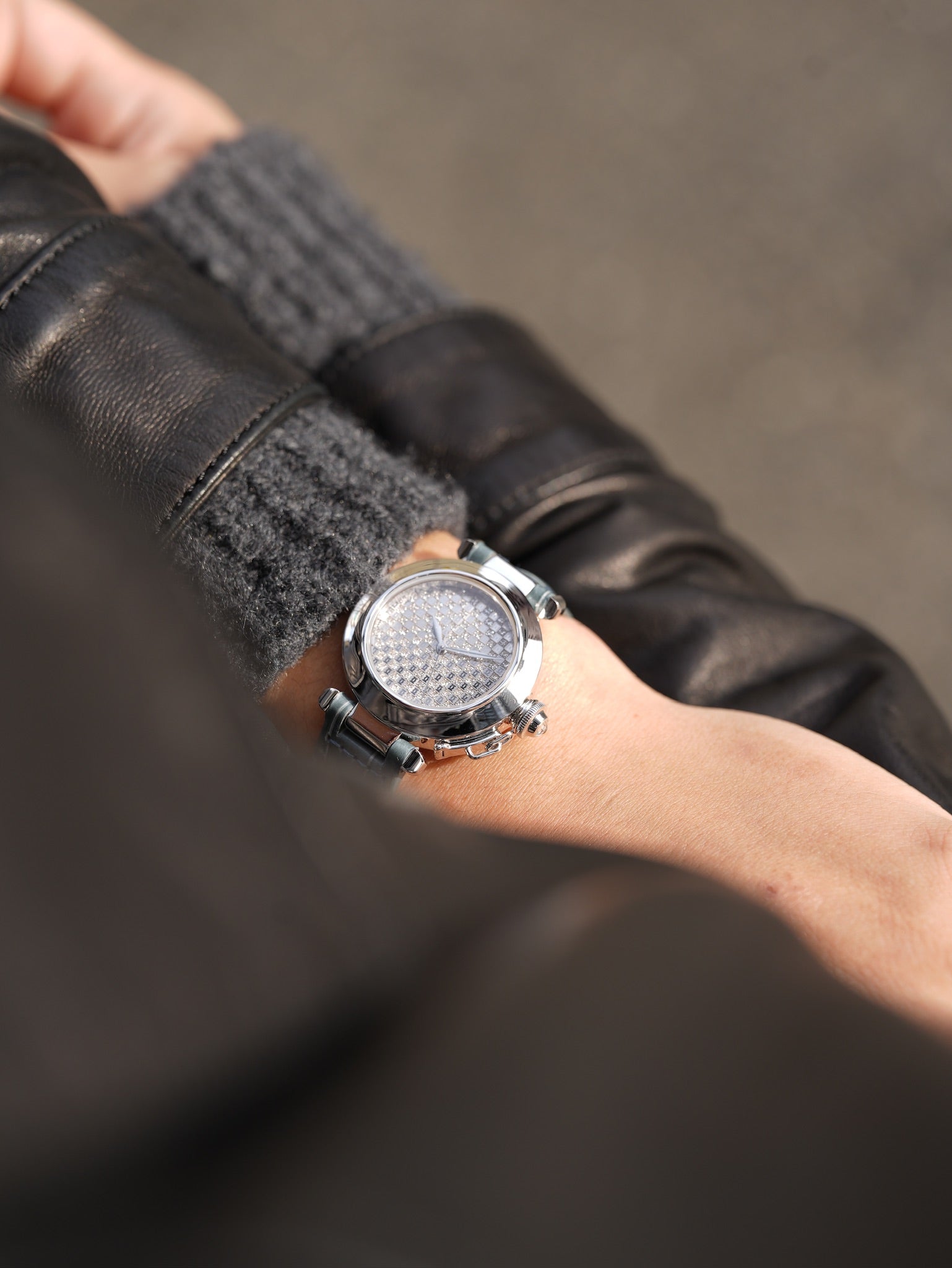 | 32mm Size 18K White Gold Diamond Dial and Crown Original Cartier Diamond Settings Set with a total of 101 Diamonds for a weight of 0.76 carats Water Resistant 3ATM - 30M - 100 FT Automatic Movment excellent condition cartier boutique serviced 2023 |