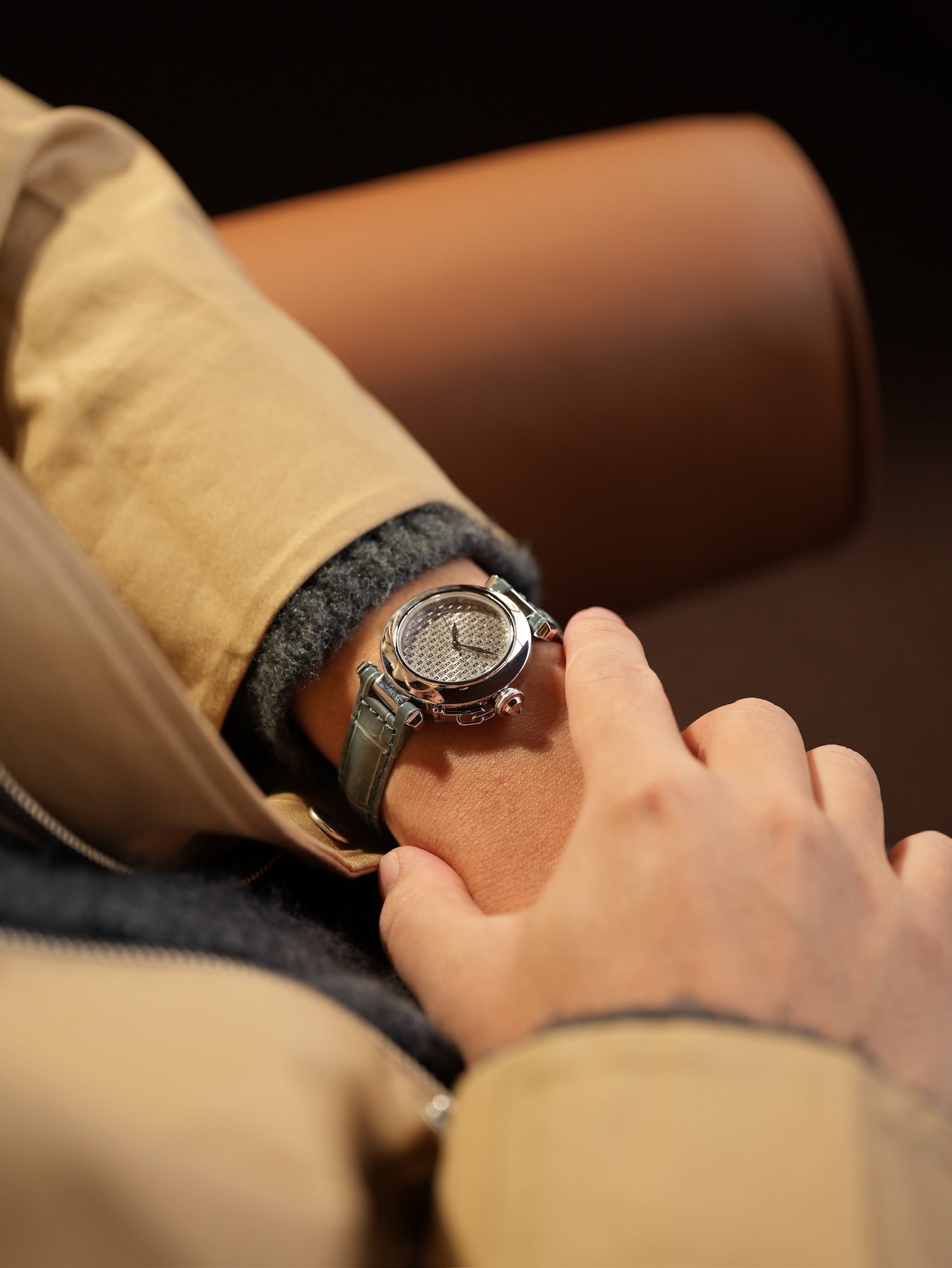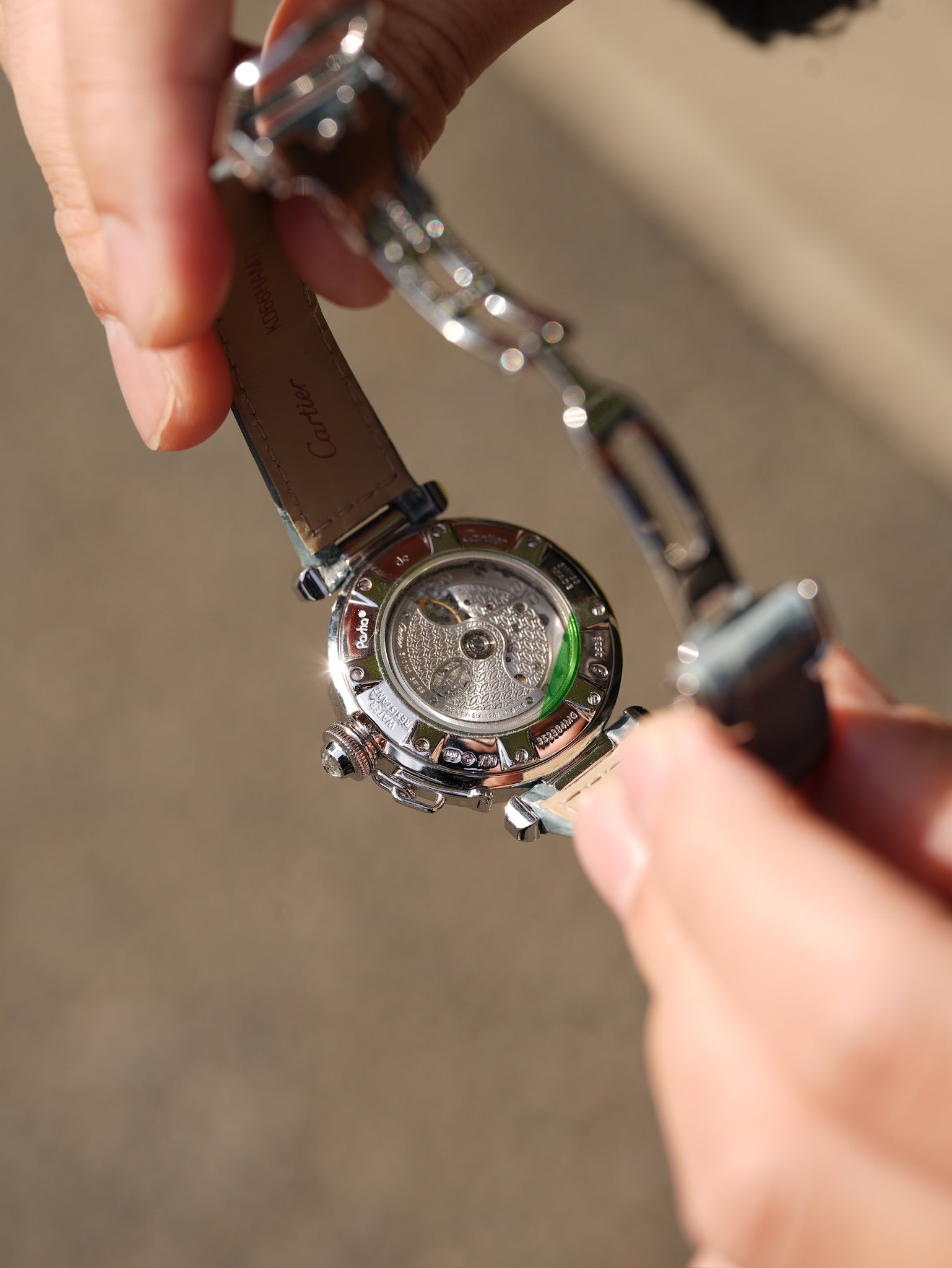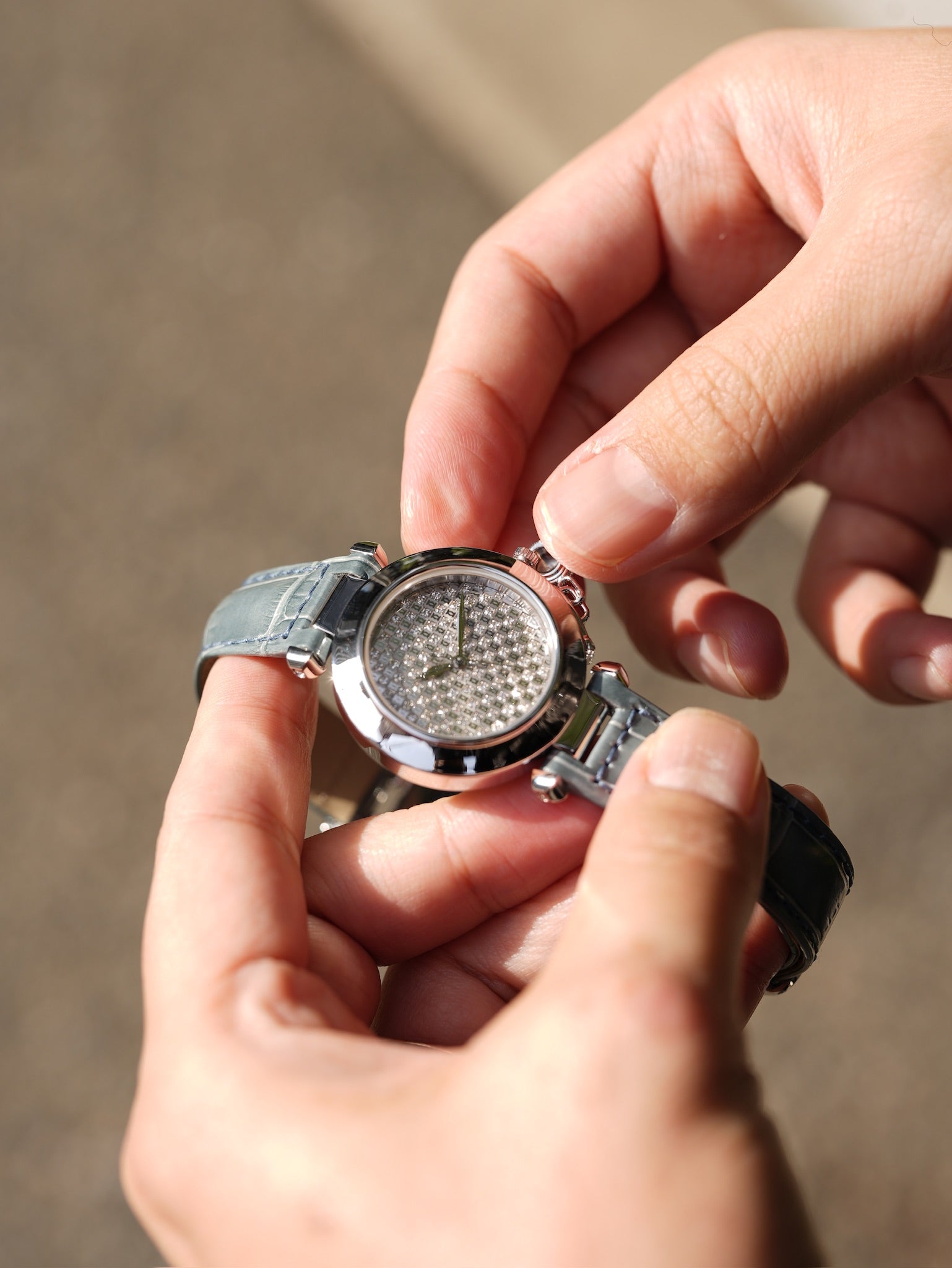 | 32mm Size 18K White Gold Diamond Dial and Crown Original Cartier Diamond Settings Set with a total of 101 Diamonds for a weight of 0.76 carats Water Resistant 3ATM - 30M - 100 FT Automatic Movment excellent condition cartier boutique serviced 2023 |