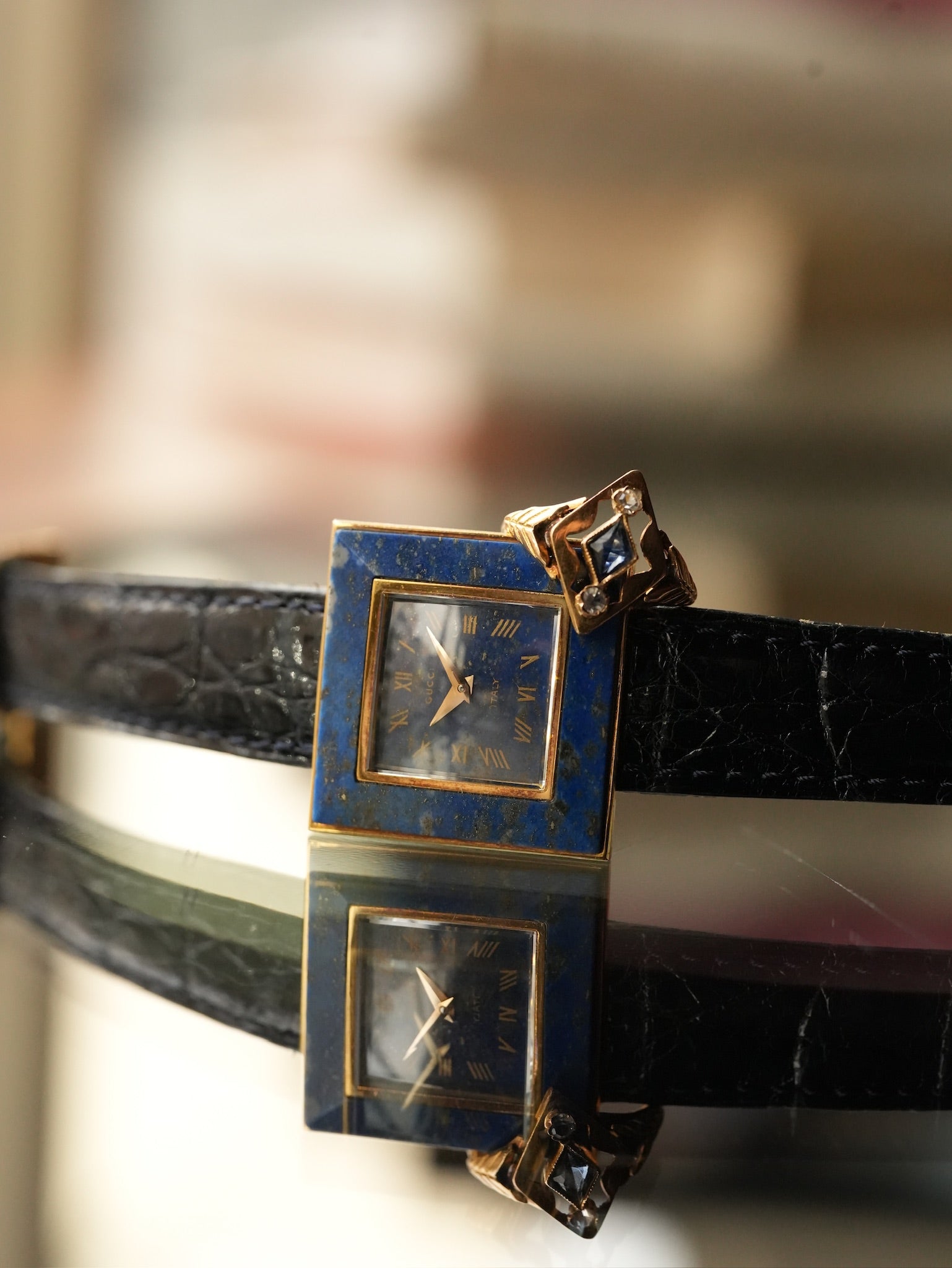 | 1980年代に製造されたこのグッチ ウォッチは、18Kゴールド無垢ケースとベゼルとダイヤルの両方に本物のラピスラズリをあしらった、非常に希少でラグジュアリーなモデルです。当時、グッチはスイスの時計製造のノウハウを生かしながらハイエンドのジュエリーウォッチに進出していましたが、このような貴重な素材を使用したモデルは極めて限られていました。 ベゼルと文字盤の両方に天然のラピスラズリを使用し、この時計を際立たせています。1980年代には、カルティエ、ピアジェ、ヴァン クリーフ&アーペルなどのブランドが宝石をデザインに取り入れていましたが、グッチでは特に珍しく、コレクターズピースとして大変貴重なものとなっています。ラピスラズリの深いブルーの色合いと金色のパイライトの斑点は、長い間、富と名声を象徴し、この時計に印象的な宝石のような存在感を与えています。 18K金無垢のケースは、その価値をさらに高めています。この時代のグッチウォッチのほとんどはゴールドメッキでしたが、このモデルはソリッドゴールド製で、優れた耐久性と投資の可能性を備えています。さらに、スイス製エタ手巻きムーブメントを搭載しており、クォーツウォッチが主流の時代には珍しい選択です。エタ・ムーブメントは、信頼性、機械的な美しさ、コレクター性を保証し、愛好家にとってさらに魅力的なモデルとなっている。 この時計は、1980年代のオート・オロロジーの頂点を極め、ラグジュアリーウォッチ市場で確固たる地位を築こうとするグッチの野心を体現しています。貴金属、宝石、スイス製機械式ムーブメントをこれほどまでに洗練された形で組み合わせたグッチのモデルはほとんどなく、非常に希少なタイムピースとなっています。 単なる時計の枠を超え、ジュエリー、アート、そしてスイスのクラフツマンシップが融合しています。ステータスと洗練の象徴であり、グッチの時計製造の歴史におけるユニークな一章であり、真のコレクターズ・マスターピースです。 |