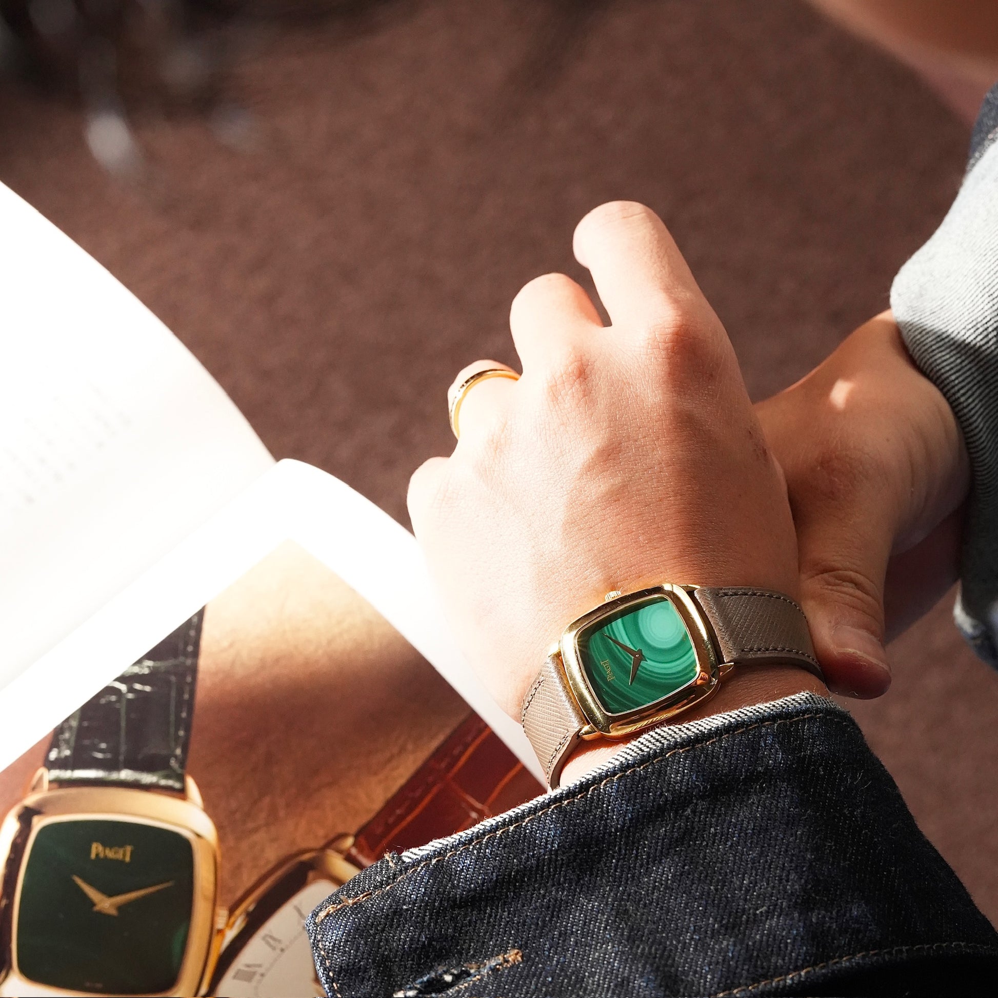 This vintage Piaget watch with a malachite natural stone dial is a masterpiece of true beauty and rarity. The deep green hue and unique patterns of the malachite resemble a work of art crafted by nature itself, with each dial offering a different expression. Encased in a gold frame, the dial radiates refined elegance, combining a classic aesthetic with a modern allure. From the moment you hold it, you can feel the exceptional craftsmanship that Piaget is renowned for. This watch is not just a timepiece; it's an accessory that accentuates the wearer's personality and sophistication. Additionally, malachite is known for symbolizing "prosperity" and "success," believed to bring a special power to those who wear it. This watch sells out almost immediately every time it's in stock, appealing not only to collectors but also to those with a taste for genuine luxury. By acquiring this one-of-a-kind Piaget, you're not just purchasing a watch, but embracing an extraordinary experience. Don't miss this rare opportunity to own a piece of time that stands apart from the rest. |