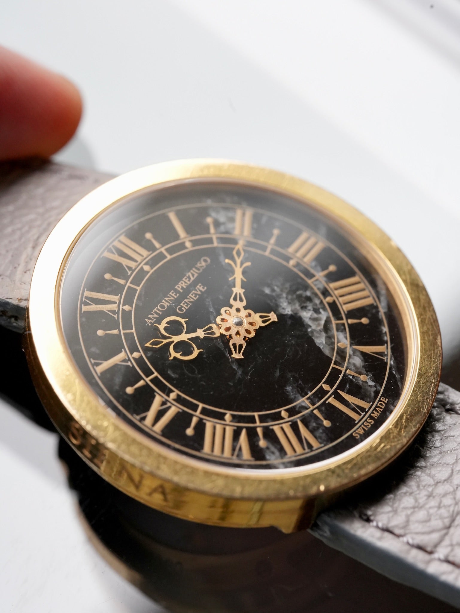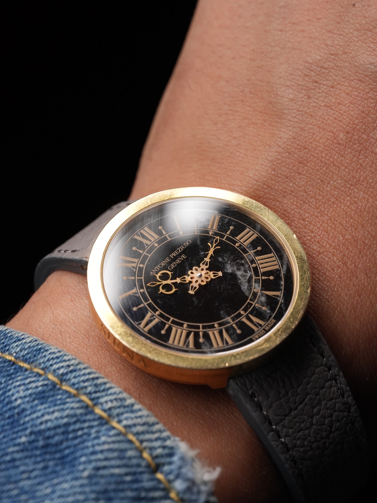 | This timepiece by Antoine Preziuso, an independent Swiss watchmaker, is a rare limited edition created in only 360 pieces worldwide. Known for his artistic approach and mastery of traditional watchmaking, Preziuso designed this watch to stand out as both a functional timekeeper and a wearable work of art. Its exclusivity and craftsmanship make it highly desirable among collectors. The most striking feature is its natural marble dial, a material rarely seen in watchmaking. Because marble is a natural stone, each dial has its own unique pattern, ensuring that no two watches are ever the same. The black surface with white streaks resembles abstract art or a cosmic landscape, giving the watch a dramatic and mysterious presence. While the patterns may resemble cracks, they are natural textures of the stone and not actual damage, adding to its individuality and charm. The 18K yellow gold case perfectly complements the dark marble dial, creating a rich, classic contrast. At 34mm, the size offers a perfect balance—substantial enough to have presence while remaining elegant and wearable for everyday or dress occasions. Its proportions feel timeless, sitting comfortably on the wrist without being too heavy or overpowering. Powered by an automatic movement, this watch combines artistic beauty with practical functionality. While it features a non-original buckle, the core of the watch remains authentic and true to its limited production nature. As a whole, this piece embodies what makes independent watchmaking so special: limited production, unique materials, and a personal artistic vision. With its one-of-a-kind marble dial, luxurious gold case, and global rarity, it represents more than just a watch—it is a statement of taste and individuality. For collectors seeking something truly distinctive, this Antoine Preziuso limited edition is a treasure that will continue to grow in both emotional and historical value. |