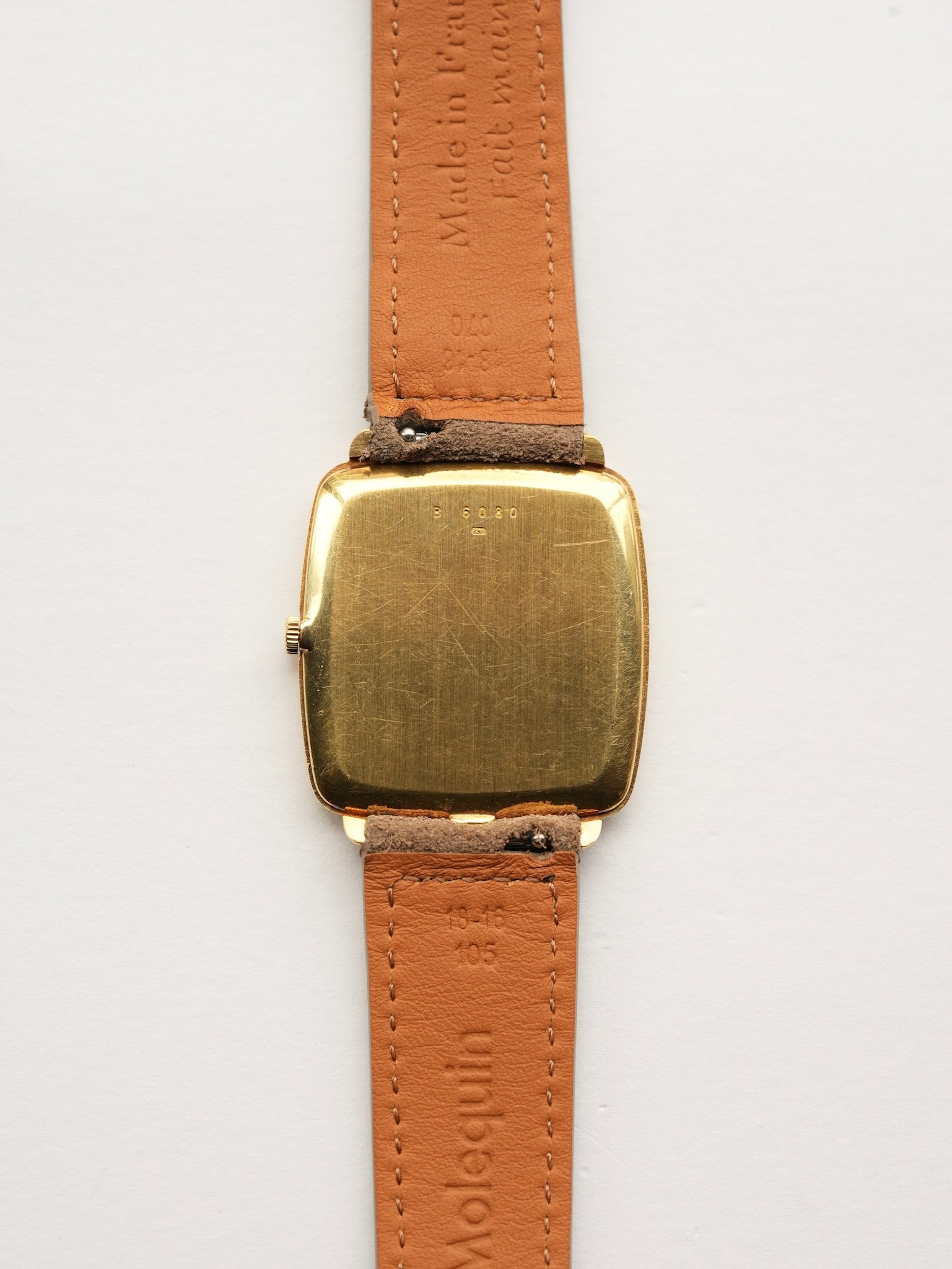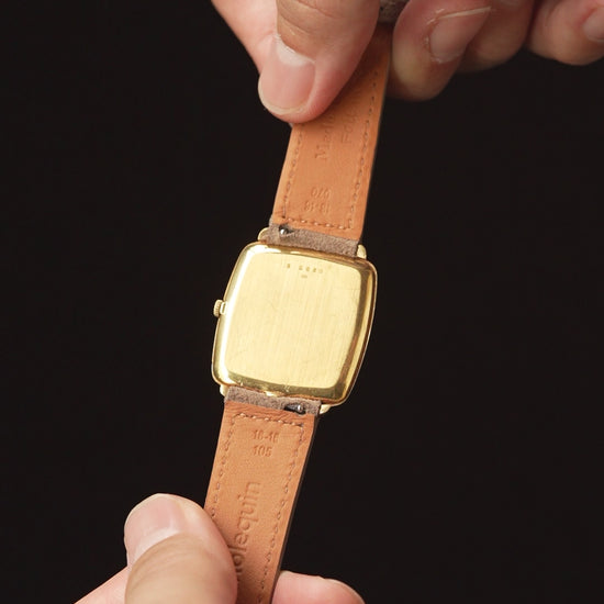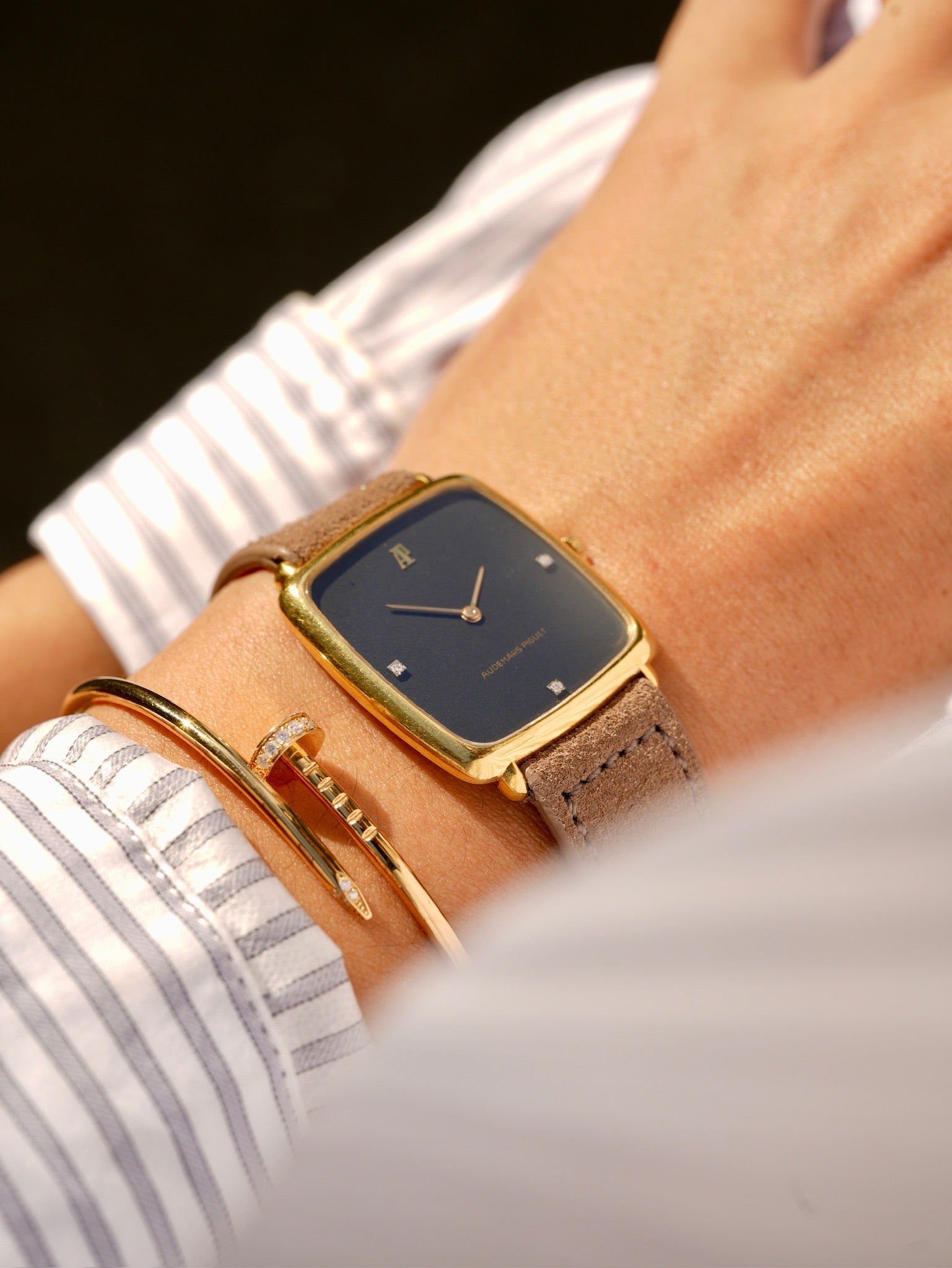 | This Audemars Piguet cushion case watch is not merely a timepiece—it is a poem quietly written in gold. Its 18K body, hand-wound heartbeat, and 30×35mm proportions are the marks of an era when elegance was whispered, never declared. The cushion shape, poised between round and square, bends softly like a murmur, resting against the wrist with intimate familiarity. It does not demand to be seen; its beauty lives in restraint, in the tender dialogue between line and curve, warmth and shadow. The vintage black dial absorbs light like the night itself, revealing a quiet luster that deepens with every glance. The four diamond markers are not decorations, but pauses within a poem of silence. At twelve, the AP emblem gleams like a discreet signature—modest, yet eternal. Within, the ultra-thin hand-wound movement breathes in rhythm with its wearer, each turn of the crown a small ritual of awareness rather than control. Paired with a beige Molequin suede strap, the vintage soul of this watch is reborn with modern tranquility. Gold and taupe, black and light—contrasts fade into harmony. It is time distilled to its purest form, luxury refined into silence, and art resting upon the pulse. 【Detail】 70's 18K 30×35 Manual winding With box Original buckle |