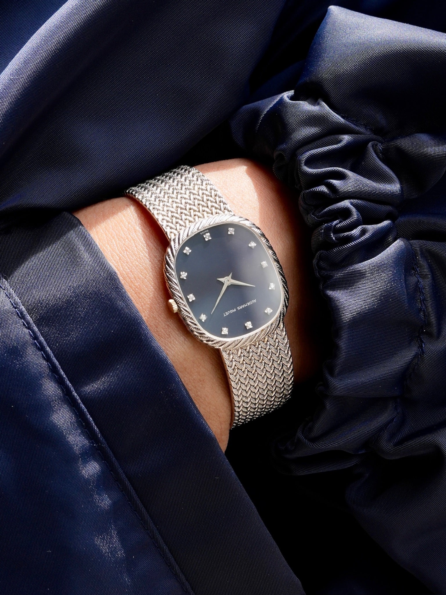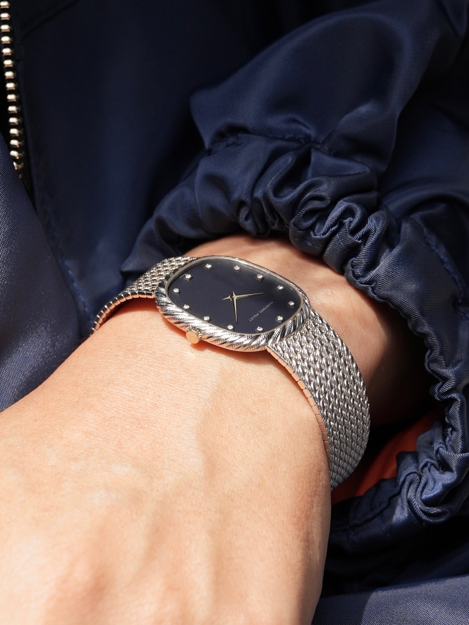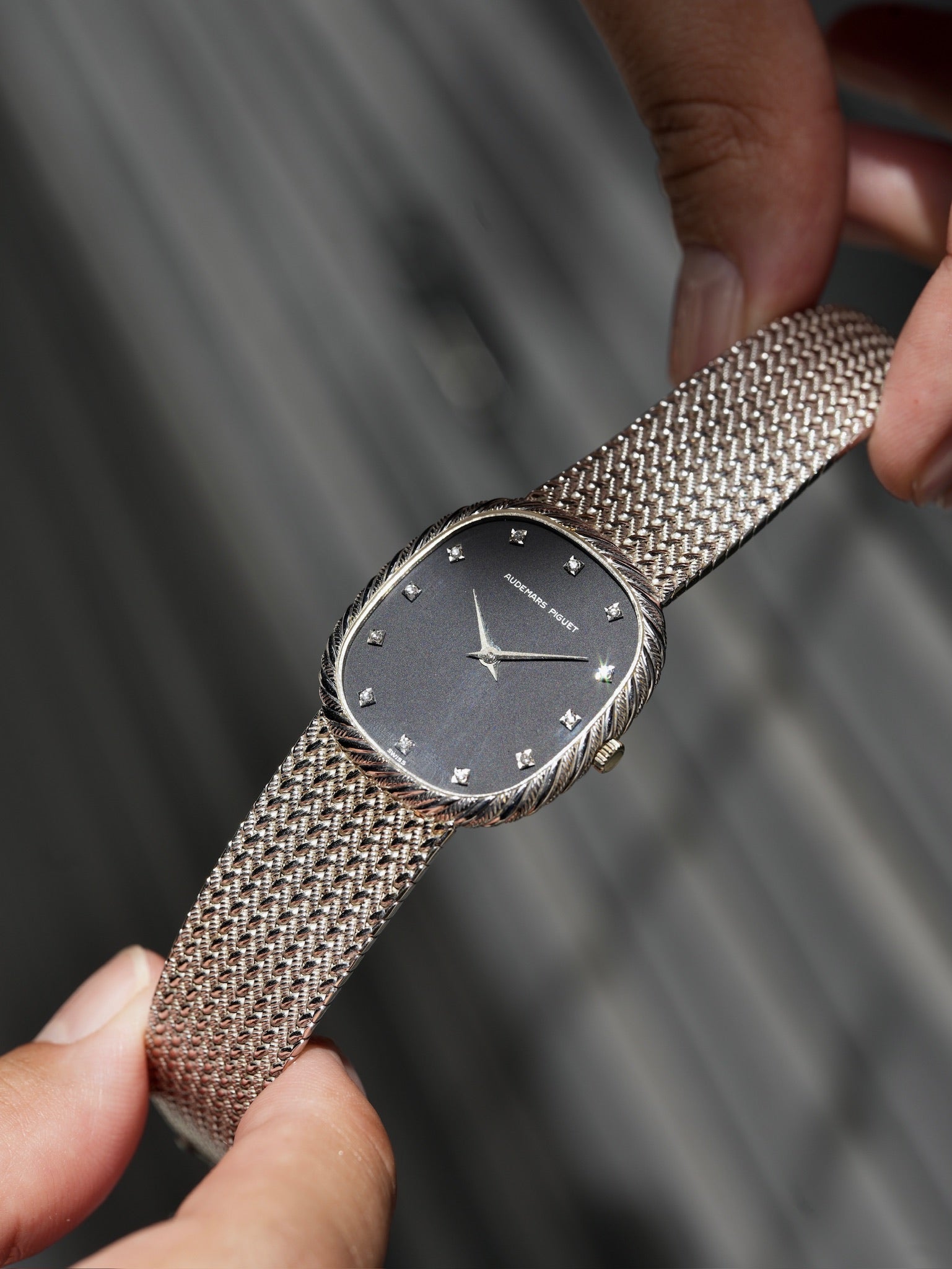 | The Audemars Piguet C16132 Ellipse embodies the essence of quiet luxury and vintage refinement. Crafted entirely from 18K white gold, its 23×29mm case offers a perfect balance of subtlety and presence. The softly curved elliptical shape flows naturally with the wrist, creating a form that is neither round nor square, but distinctly its own. This seamless integration of case and bracelet gives the watch a jewelry-like quality while retaining the precision of fine watchmaking. Its woven mesh bracelet continues the legacy of Audemars Piguet’s iconic “Cobra” designs. Each link is meticulously finished, reflecting light with delicate complexity. While the Cobra is celebrated for its bold, dramatic style, this model offers a more understated and refined interpretation, making it versatile enough for everyday wear. It graces the wrist like a piece of art, subtle yet undeniably luxurious. The dial is a rich vintage black, displaying depth and character that only decades of natural aging can create. Unlike modern flat black surfaces, it shows soft, nuanced tones that shift beautifully under changing light. At each hour, diamond indices add just the right amount of sparkle, enhancing the design without overpowering it. The contrast between the dark dial and the brilliance of the diamonds captures a restrained form of elegance—a true expression of quiet sophistication. Inside beats a hand-wound mechanical movement, connecting the wearer to traditional Swiss craftsmanship. The act of winding becomes a daily ritual, a moment of connection to the intricate mechanics and the passage of time itself. It is a reminder of the artistry and heritage that define Audemars Piguet. This C16132 is more than a watch—it is a fusion of history and artistry. From the deep vintage black dial to the finely woven bracelet and the subtle glow of white gold, every element works in harmony. Luxurious yet understated, it represents a timeless aesthetic meant to be cherished, worn, and passed down through generations. 【Detail】 "Ellipses" 70's 18WG 23×29 Manual winding 17.8cm wrist Excellent condition Watch only |