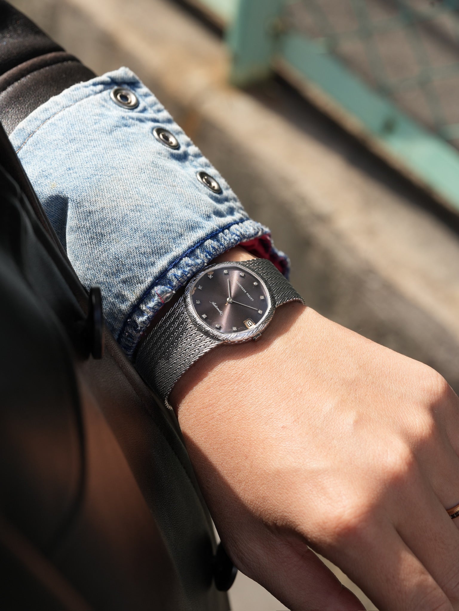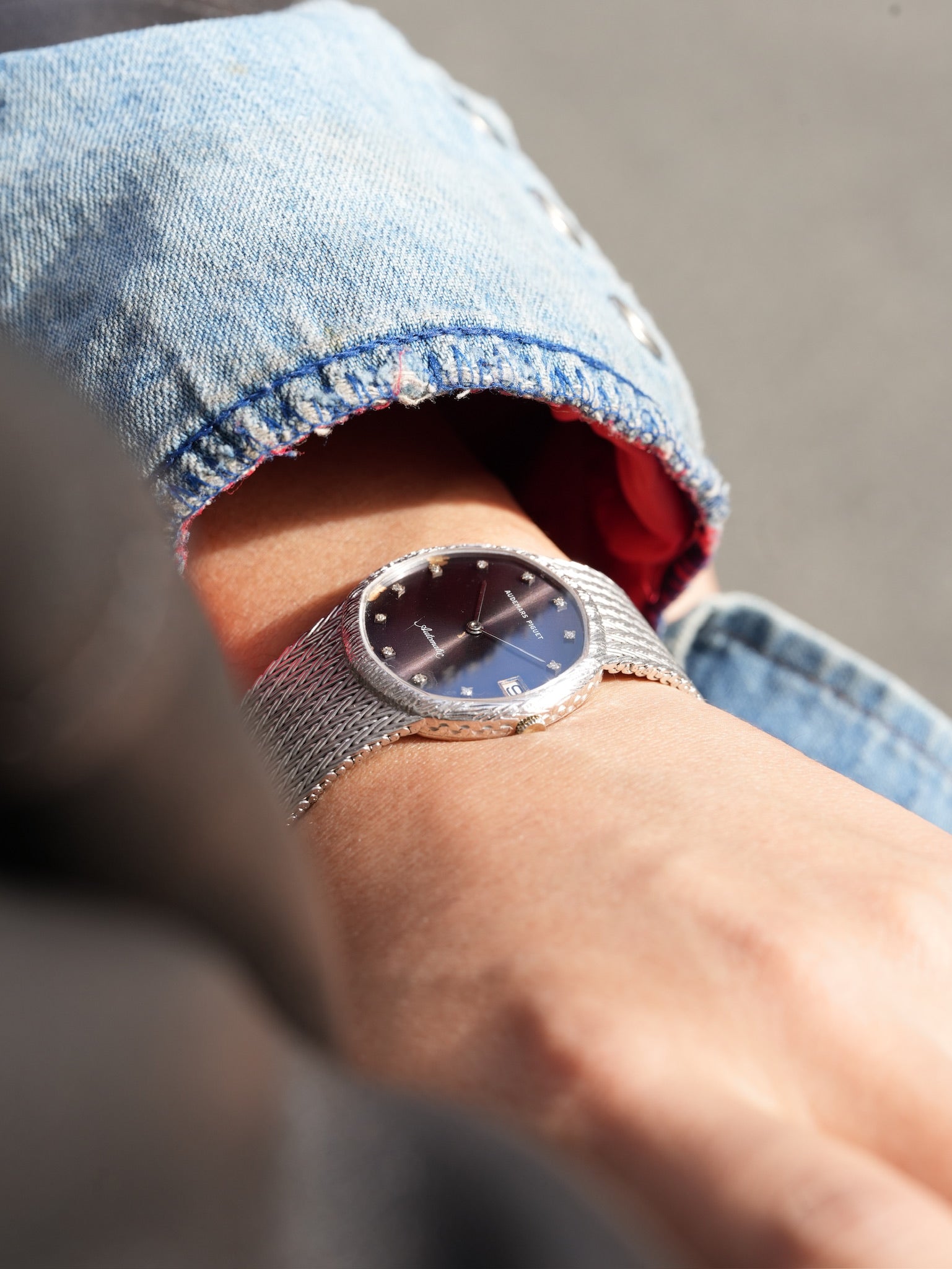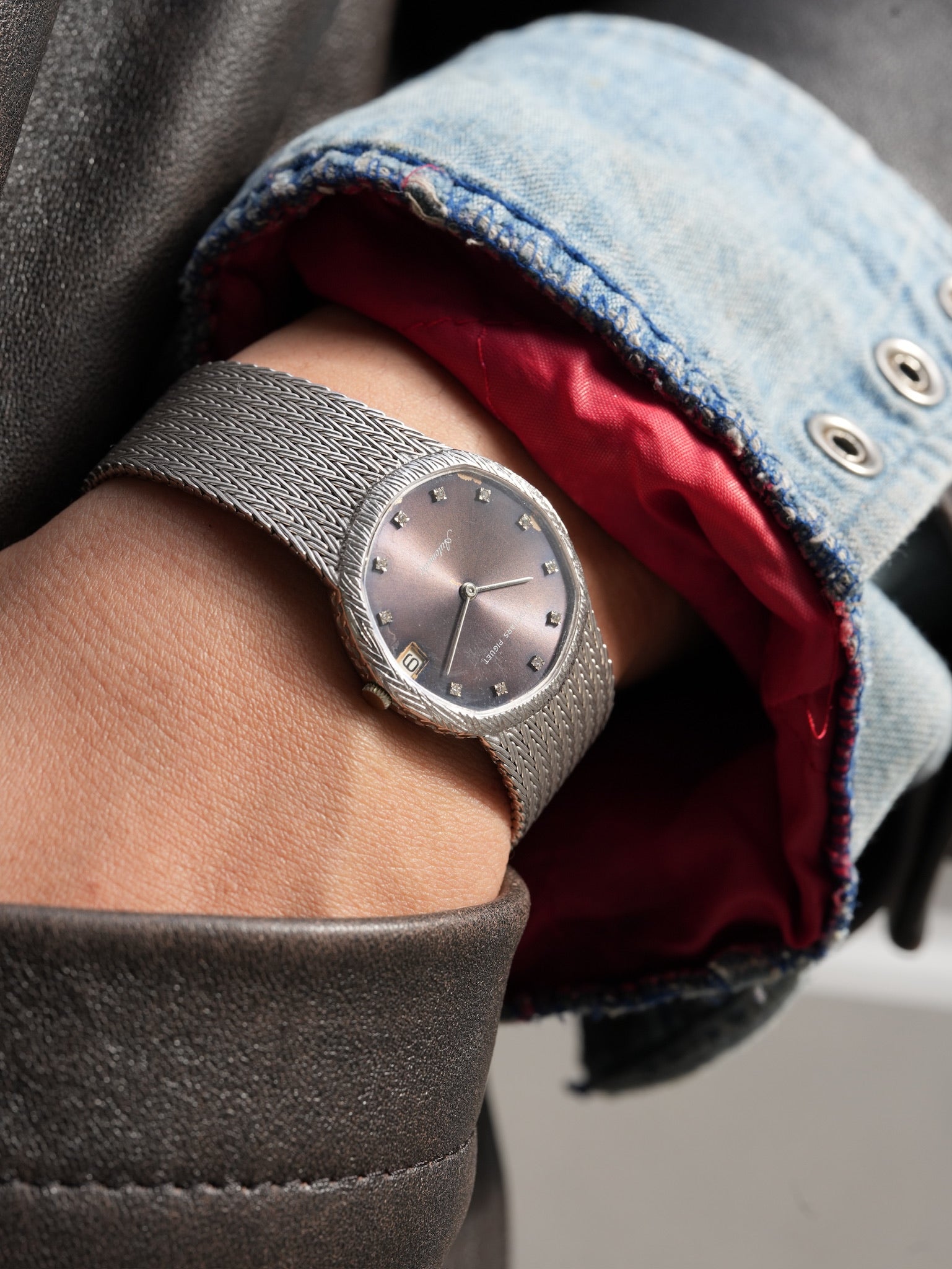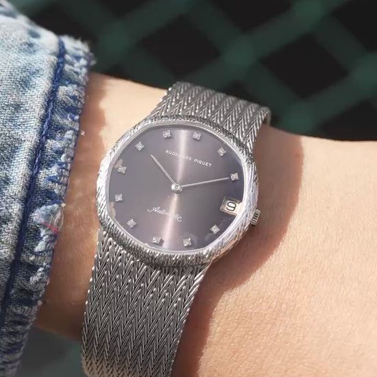 | Once a deep and dignified blue, the dial has surrendered to time in the most graceful way, letting its cool tones fade into a smoky purple glow that feels almost celestial, as if the watch has carried decades of twilight on its surface. This quiet transformation, where blue dissolves into violet and violet melts into a warm, dusky sheen, is the kind of aging that cannot be engineered or imitated; it is the slow poetry of light, chemistry, and chance weaving themselves into a single unrepeatable expression. Encased in white gold that reflects light with a softness unique to this metal, the dial’s new hue seems to float above the watch rather than sit beneath the crystal, shifting from charcoal plum to muted amethyst depending on the angle of the sun. The engraved texture of the bezel catches fragments of light like tiny strokes of silver, framing the dial with a gentle radiance that amplifies the richness of the transformation and gives the watch an almost ethereal stillness. The diamond hour markers—small, precise, and impossibly serene—hover against the purple field with a clarity that feels pure and measured, their cool fire contrasting beautifully with the warmth that time has painted across the dial. And then there is the bracelet, a meticulously woven sheet of white-gold threads, fluid like fabric yet architectural in its structure, moving with a grace that only vintage Audemars Piguet could achieve, wrapping the wrist with quiet confidence. It feels like a piece crafted by hands that understood both jewelry and time itself, a rare harmony whispered through every link. Together, these elements create a watch that feels less like an object and more like a memory preserved in precious metal—a piece that embraces its transformation instead of resisting it, carrying the mood of dusk and the soft glow of fading horizons, the kind of beauty that only emerges when time decides to leave its signature. 【Detail】 70's 18WG Patina dial 32mm Wrist 16.5〜17.5cm 89.2g AT (cal. 2121) Watch only |