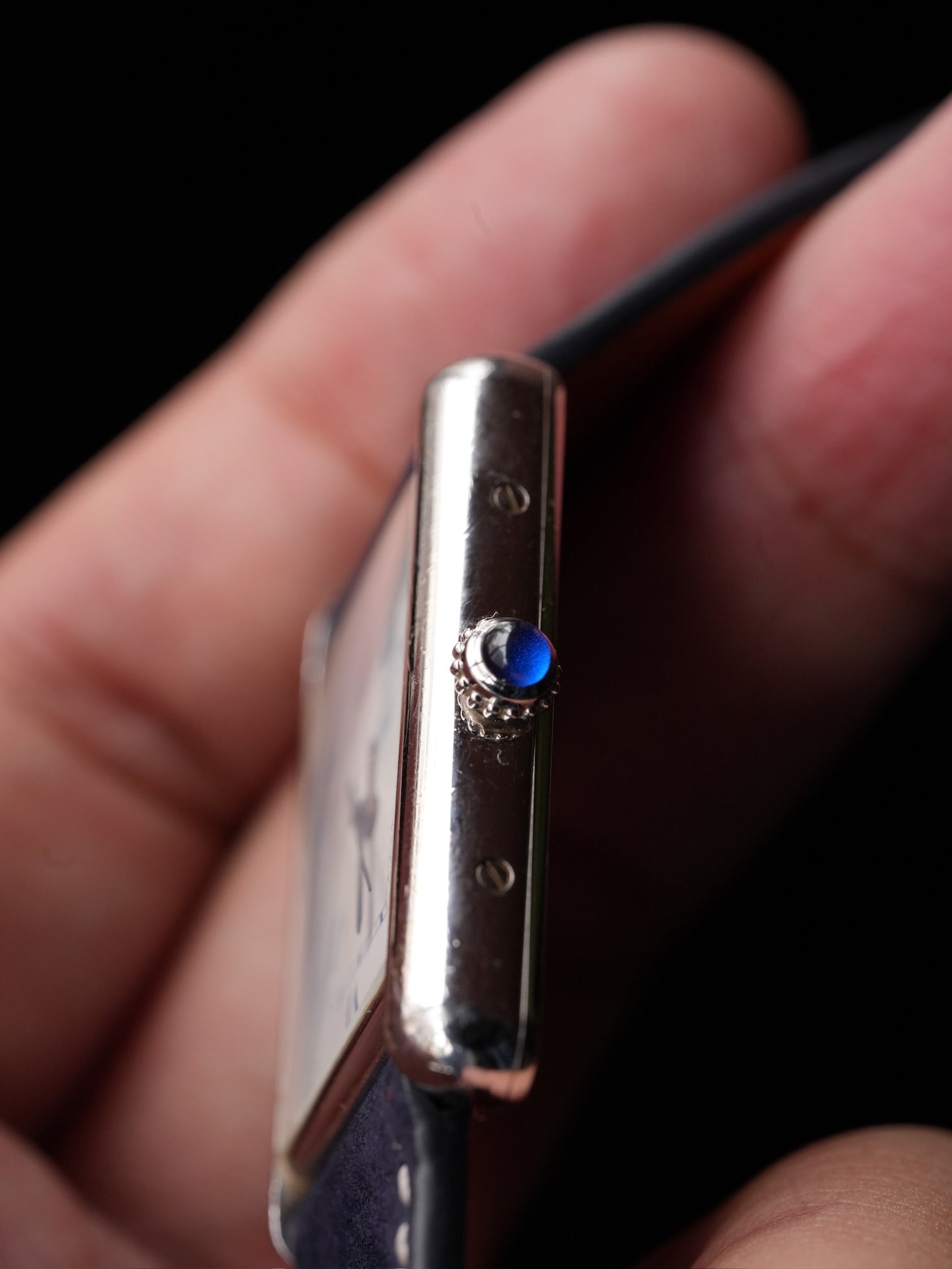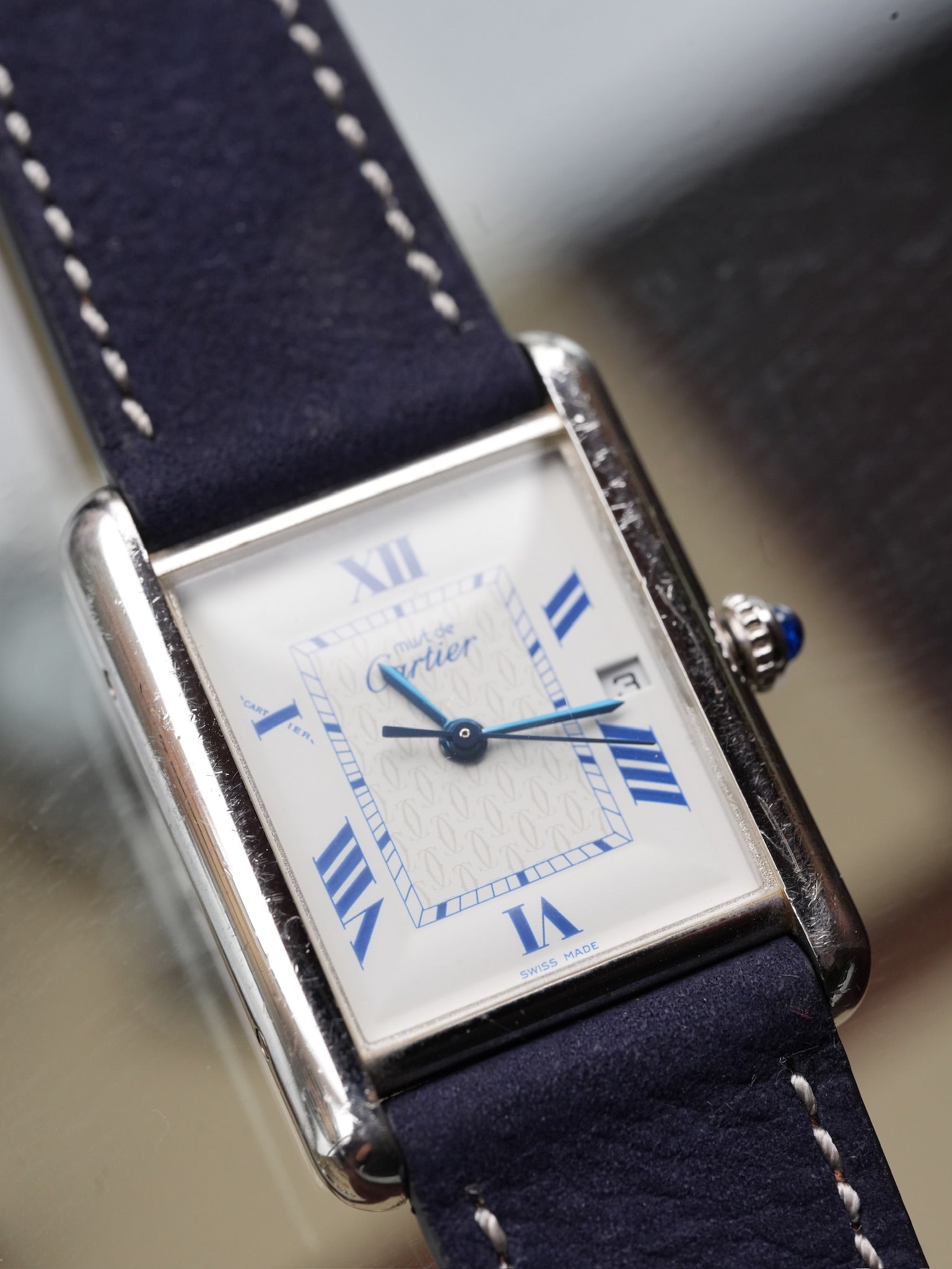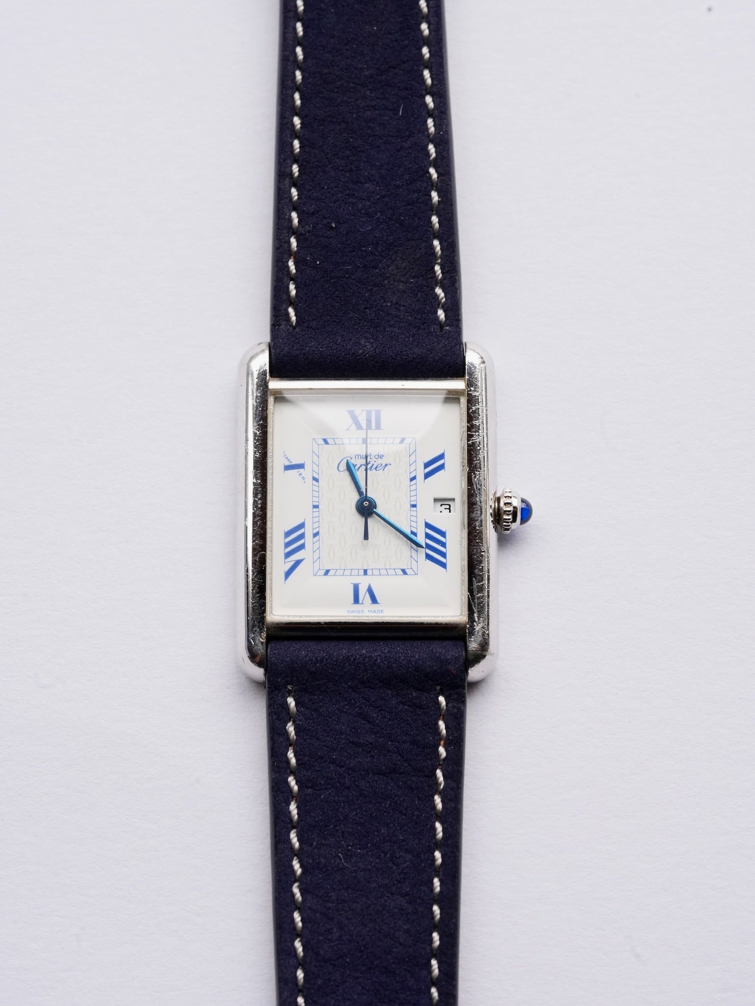 | Cartier Must de Tank GM (XL) Date • Reference No. W1014154 / 2414 • Production Period: Circa 1990 – 2004 • Dial: White with exploding Roman numerals, “CC” signature • Serial No. 147***** • Case Size: 25.4mm × 33.6mm (men’s) • Wrist Size: — • Material: Sterling Silver (SV925) • Bracelet: Cartier original stainless steel buckle with a new aftermarket strap • Movement: Quartz, Caliber 687 |