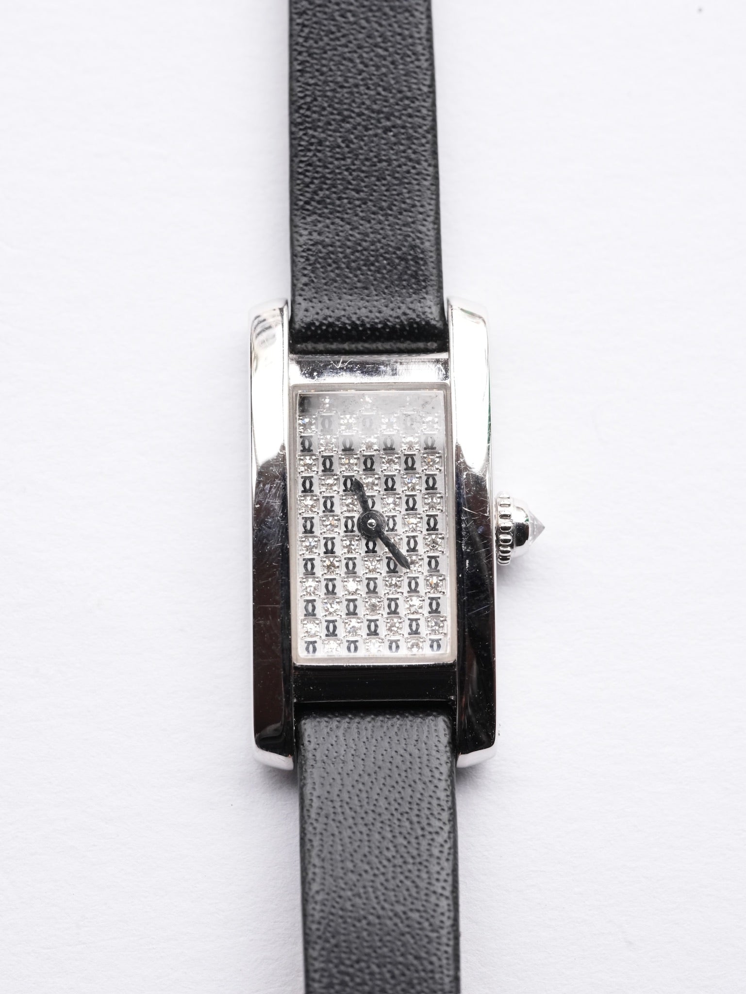 | The Cartier Tank Allongée Ref. 2554 is one of the rarest modern Cartier watches, produced only once in 2004. Its name, “Allongée,” meaning “elongated” in French, perfectly reflects its slim, vertically stretched case design. Among the Tank family, it is known for its exceptionally slender and refined proportions, creating an elegant silhouette that flows seamlessly along the wrist. It was conceived as both a timepiece and a piece of fine jewelry, ideal for those who appreciate understated sophistication. The most striking feature of this model is its full diamond-set dial, with meticulously placed stones forming a refined geometric pattern. There are no numerals or hour markers, allowing the diamonds themselves to serve as the design. Depending on the light, the surface comes alive with a dynamic sparkle, giving it both opulence and subtlety. Crafted in 18K white gold, the case offers a soft yet luxurious glow that perfectly complements the brilliance of the diamonds. It houses a quartz movement, enabling a slim, graceful profile while providing reliability and ease of daily wear. Because this reference was created as a one-time production, its availability on the market is extremely limited. The 2554 represents Cartier’s dedication to elegance and artistry during the era of Collection Privée Cartier Paris, making it a highly coveted piece for collectors and a true symbol of timeless luxury. |