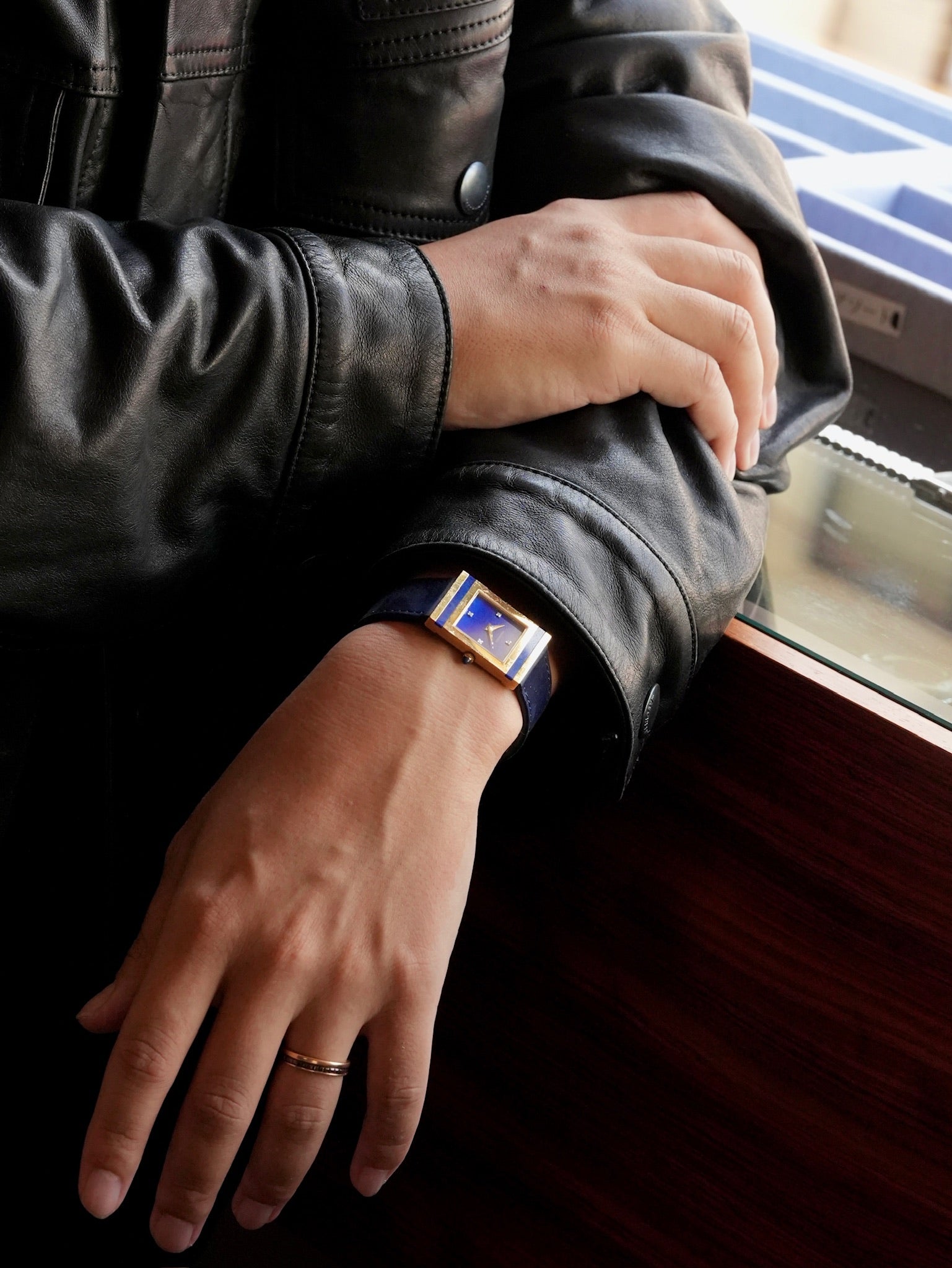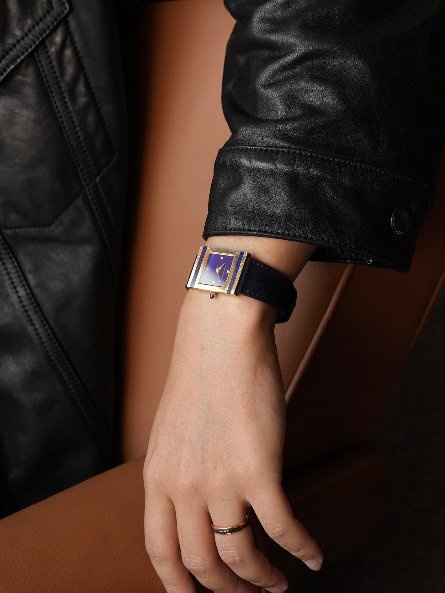 | This exceptional Harry Winston timepiece from the 1970s embodies the perfect balance between high jewelry artistry and serious watchmaking. Its most striking feature is the generous use of lapis lazuli, seen on both the top and bottom of the case as well as on the crown. The deep royal blue lapis, naturally sprinkled with golden pyrite, evokes the beauty of a starry night sky. Paired with warm 18k yellow gold, it creates a truly luxurious and sophisticated appearance, a hallmark of 1970s high-end design. At 24×32mm, the case was considered large for its era. While most dress watches of the time measured around 20×25mm, this bold size offers a modern presence while remaining elegant and versatile. It wears perfectly on a slender wrist yet has enough substance to be worn by men or women alike, making it ideal as a unisex piece with timeless proportions. Inside beats a hand-wound movement by Frédéric Piguet, a movement maker renowned for supplying calibers to prestigious maisons such as Patek Philippe, Vacheron Constantin, and Breguet. Ultra-thin and finely finished, this movement represents the highest level of mechanical excellence and shows that Harry Winston was deeply committed to true watchmaking, not just decorative artistry. The lapis dial is accented by four subtle diamond indices, adding a refined sparkle without overpowering the natural beauty of the stone. Each dial is unique due to the organic patterns of lapis lazuli, making this watch literally one of a kind. Notably, this example remains unpolished, with only minor hairline marks. The original sharp edges and factory contours are fully preserved, a detail highly prized among serious collectors. Combined with its rarity—very few of these vintage Harry Winston watches survive today—this makes it a true collector’s piece. A harmonious blend of jewelry and horology, it is both a wearable work of art and a testament to timeless luxury. |