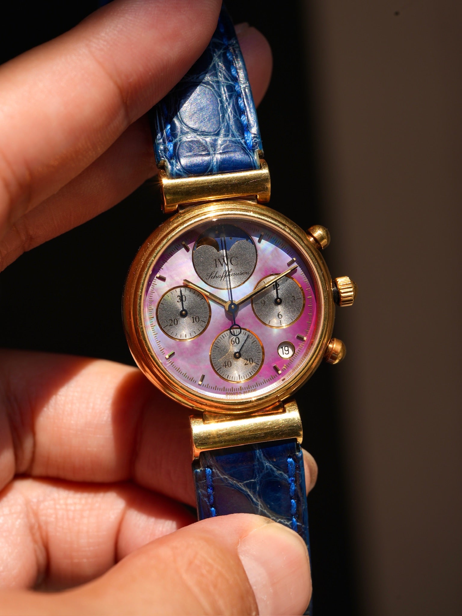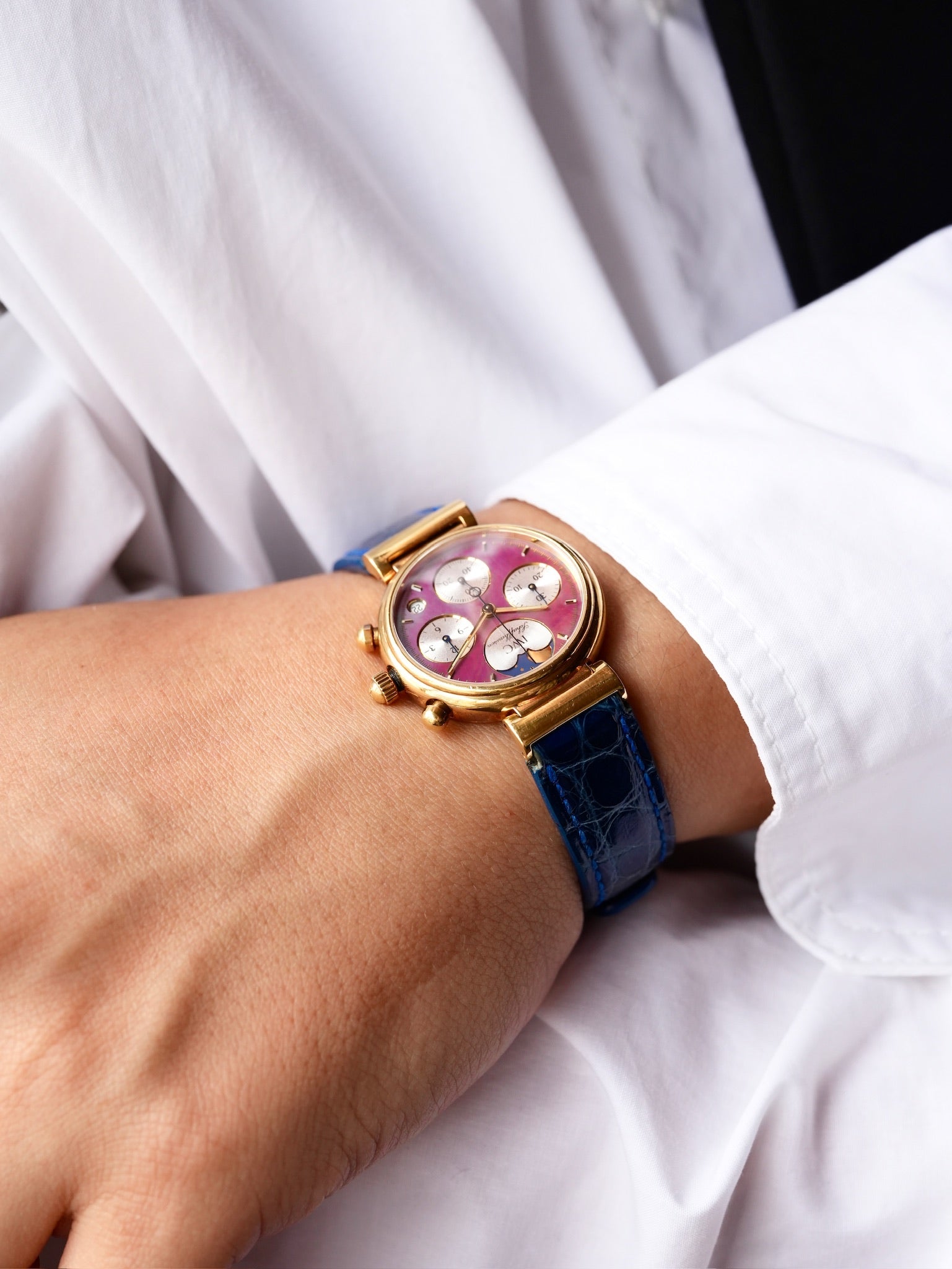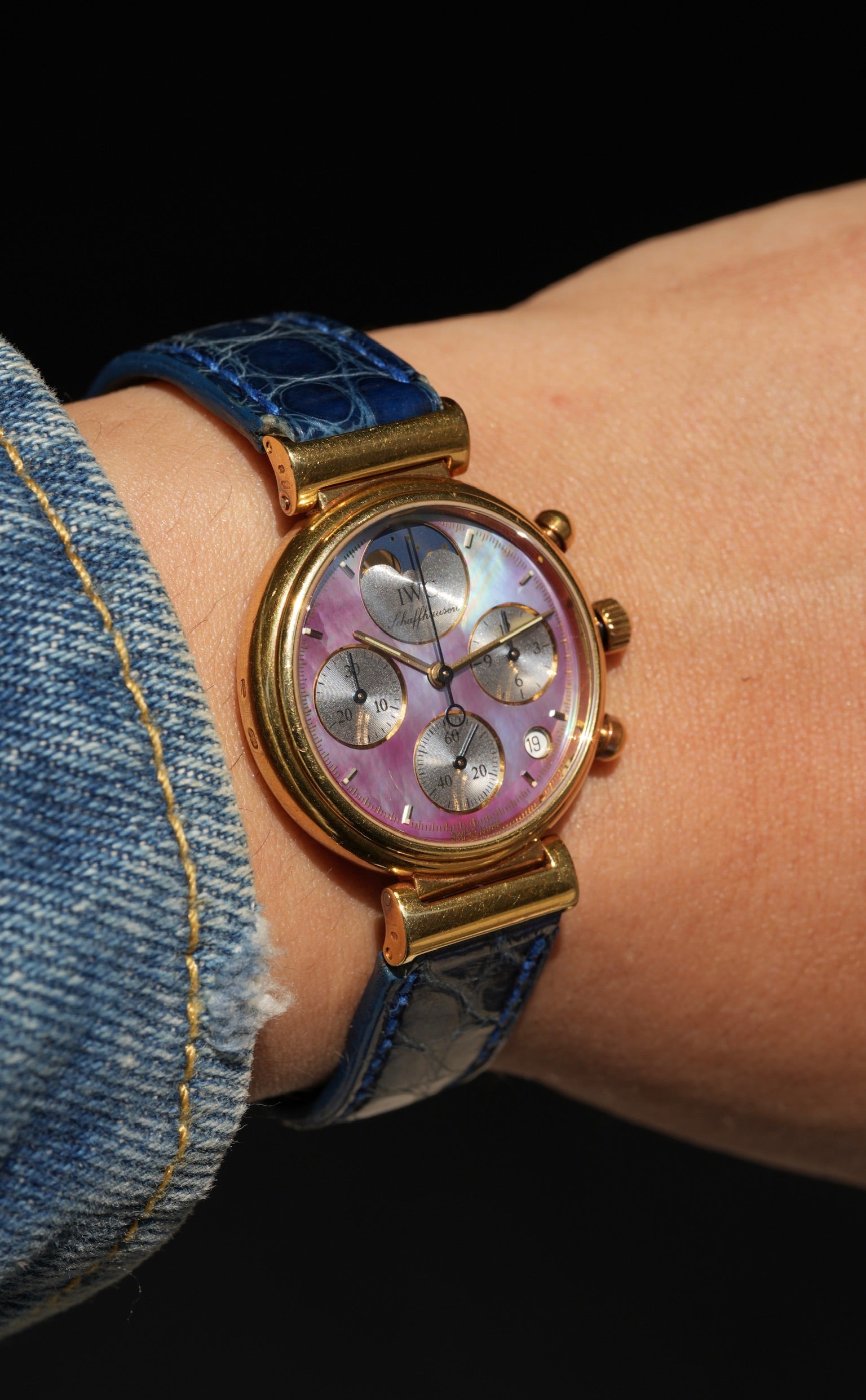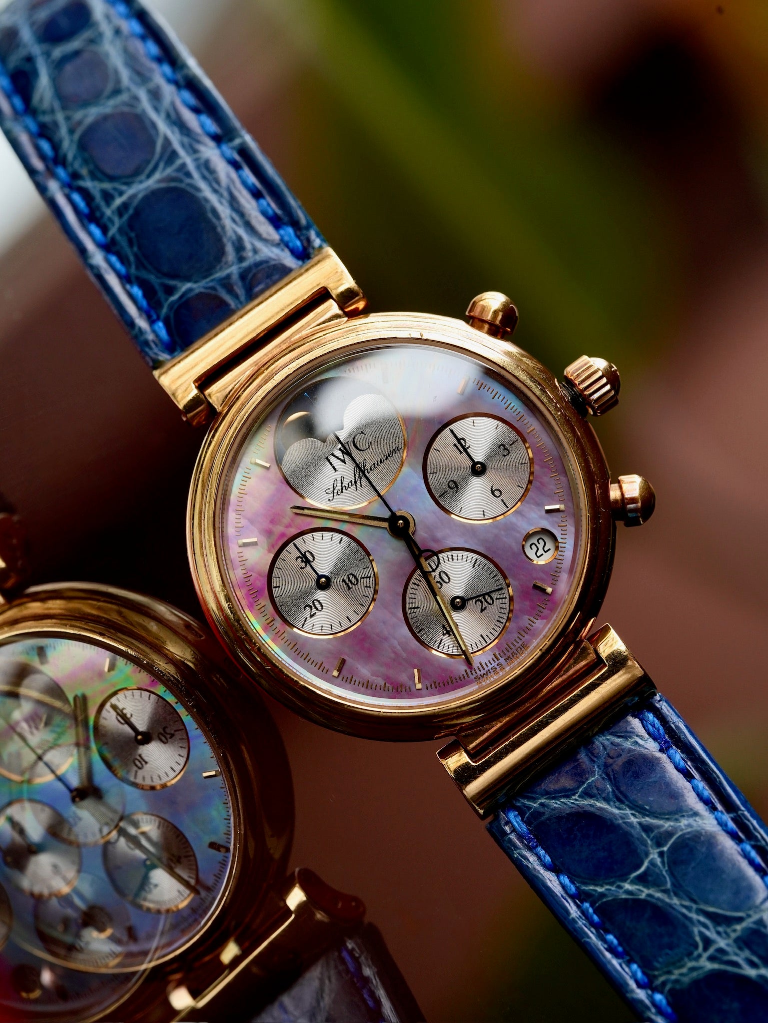 | In the realm of refined horology, where elegance meets precision, the IWC Little Da Vinci stands as a rare and captivating creation. Crafted in the 1990s, this 29mm masterpiece defies convention, uniting the grace of a jewelry watch with the spirit of a true chronograph. Its compact case, sculpted in warm 18K yellow gold, rests gently upon the wrist, while the iconic cylindrical lugs, a signature of IWC, extend its silhouette to 36mm lug-to-lug, giving the watch a presence far beyond its modest diameter. It is delicate, yet never diminutive — a watch that feels like art in motion. The dial is a world unto itself. Fashioned from black mother-of-pearl, it reveals hidden depths of color beneath the surface, shifting from violet and emerald to hints of midnight blue as light dances across it. At the center, three silvered subdials hover like celestial bodies, their matte finish creating a serene balance against the ethereal backdrop. It is a canvas of contrasts: mystery and clarity, softness and precision, opulence and restraint. The discreet date aperture at 4 o’clock adds subtle practicality without disrupting the harmony of the design. Inside beats a finely executed Swiss quartz chronograph movement, a marvel of reliability and finesse. This choice allows the case to remain slim and graceful, ensuring comfort for daily wear, while delivering the functionality of a professional timing instrument. With its 29mm case, one might expect a dainty accessory, yet the interplay of proportion, gold architecture, and elongated lugs ensures a bold visual impact, a quiet luxury that commands admiration without ever shouting. The Little Da Vinci is more than a timekeeper; it is a bridge between worlds — between past and present, between jewelry and machinery, between fleeting moments and timeless beauty. In an era where such creations are no longer made, this piece endures as a testament to IWC’s vision, a wearable work of art that celebrates both the poetry of time and the soul of fine craftsmanship. 【Detail】 Ref.3736 90's 18K QZ 29mm×36mm Blk MOP dial With paper Original buckle and leather Excellent condition |