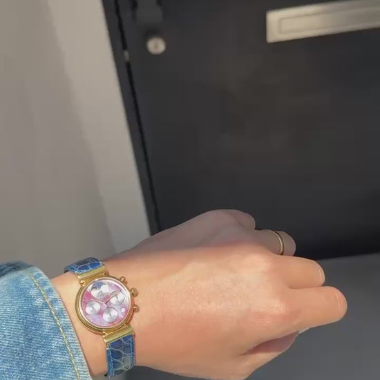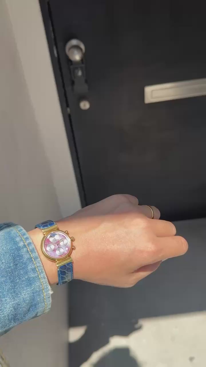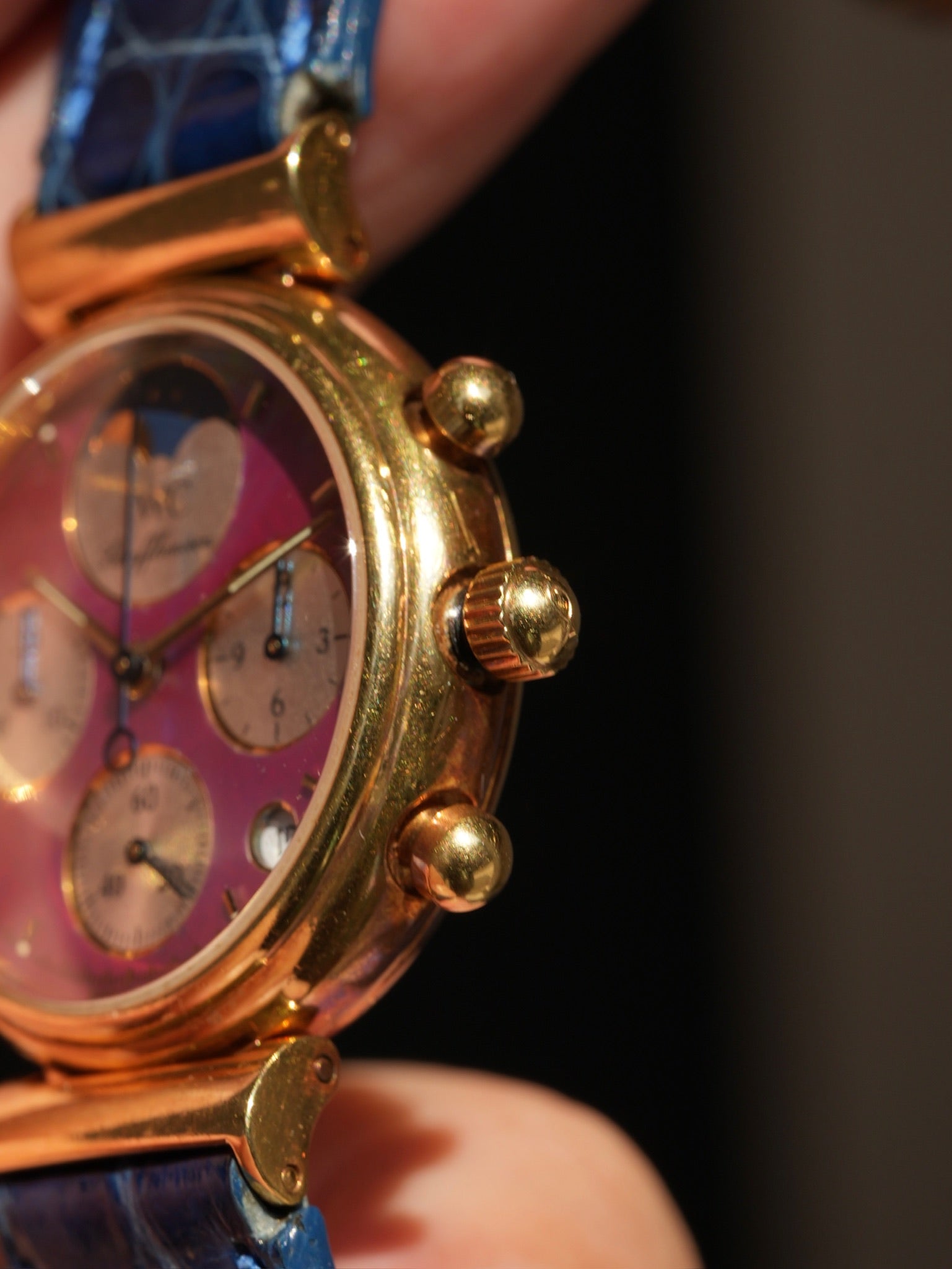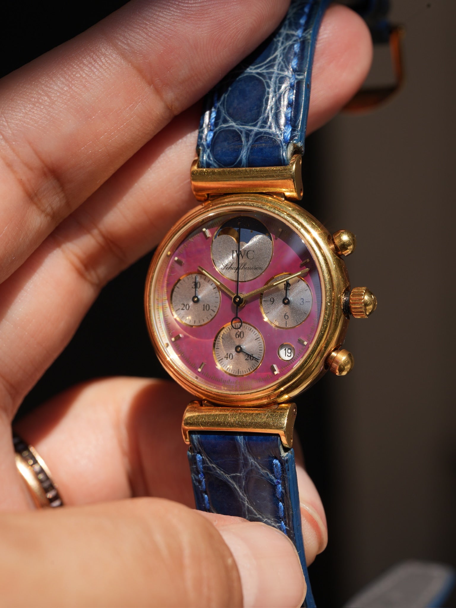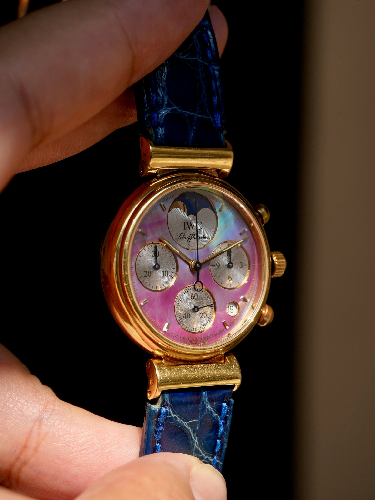 | In the realm of refined horology, where elegance meets precision, the IWC Little Da Vinci stands as a rare and captivating creation. Crafted in the 1990s, this 29mm masterpiece defies convention, uniting the grace of a jewelry watch with the spirit of a true chronograph. Its compact case, sculpted in warm 18K yellow gold, rests gently upon the wrist, while the iconic cylindrical lugs, a signature of IWC, extend its silhouette to 36mm lug-to-lug, giving the watch a presence far beyond its modest diameter. It is delicate, yet never diminutive — a watch that feels like art in motion. The dial is a world unto itself. Fashioned from black mother-of-pearl, it reveals hidden depths of color beneath the surface, shifting from violet and emerald to hints of midnight blue as light dances across it. At the center, three silvered subdials hover like celestial bodies, their matte finish creating a serene balance against the ethereal backdrop. It is a canvas of contrasts: mystery and clarity, softness and precision, opulence and restraint. The discreet date aperture at 4 o’clock adds subtle practicality without disrupting the harmony of the design. Inside beats a finely executed Swiss quartz chronograph movement, a marvel of reliability and finesse. This choice allows the case to remain slim and graceful, ensuring comfort for daily wear, while delivering the functionality of a professional timing instrument. With its 29mm case, one might expect a dainty accessory, yet the interplay of proportion, gold architecture, and elongated lugs ensures a bold visual impact, a quiet luxury that commands admiration without ever shouting. The Little Da Vinci is more than a timekeeper; it is a bridge between worlds — between past and present, between jewelry and machinery, between fleeting moments and timeless beauty. In an era where such creations are no longer made, this piece endures as a testament to IWC’s vision, a wearable work of art that celebrates both the poetry of time and the soul of fine craftsmanship. 【Detail】 Ref.3736 90's 18K QZ 29mm×36mm Blk MOP dial With paper Original buckle and leather Excellent condition |