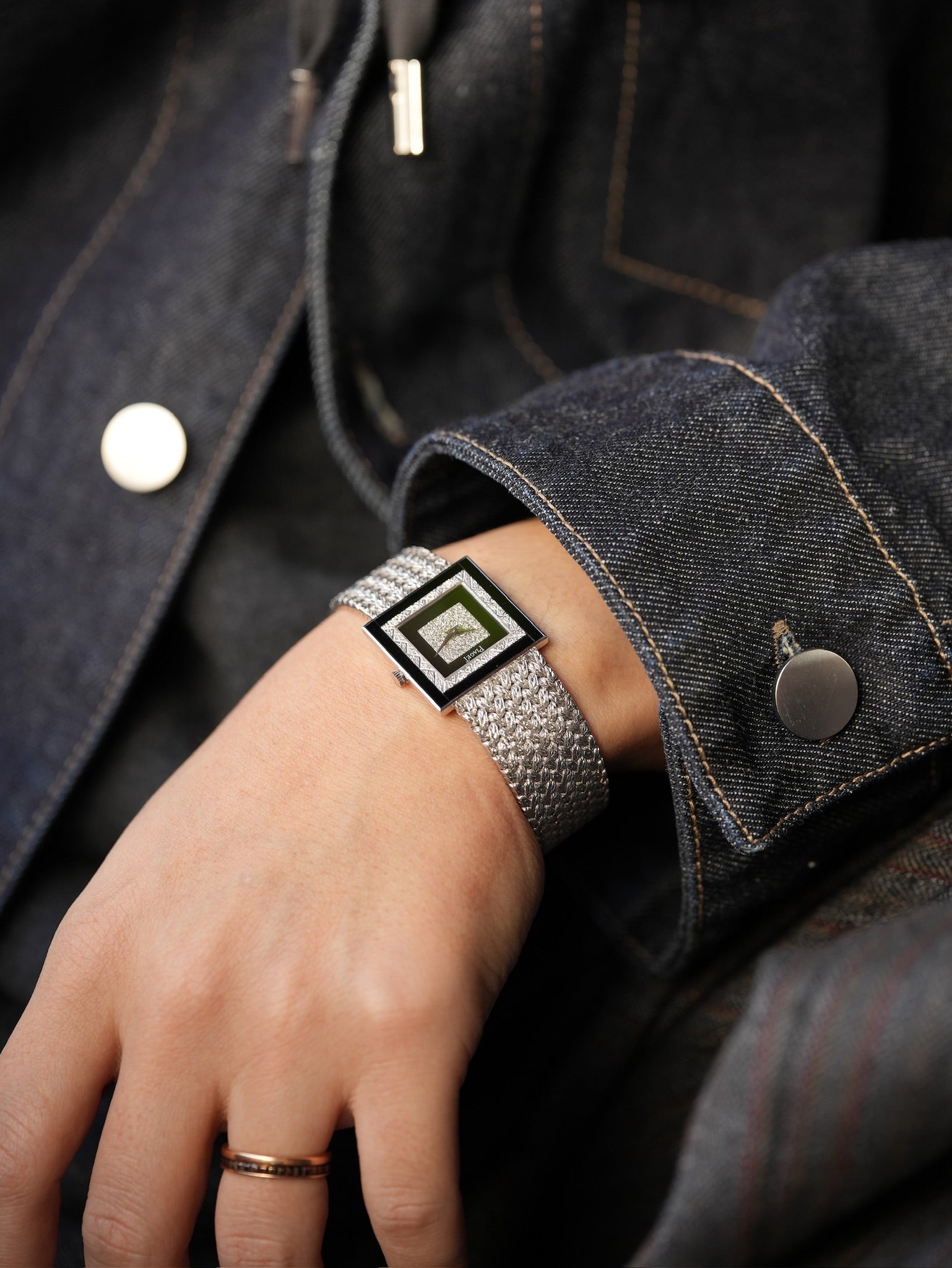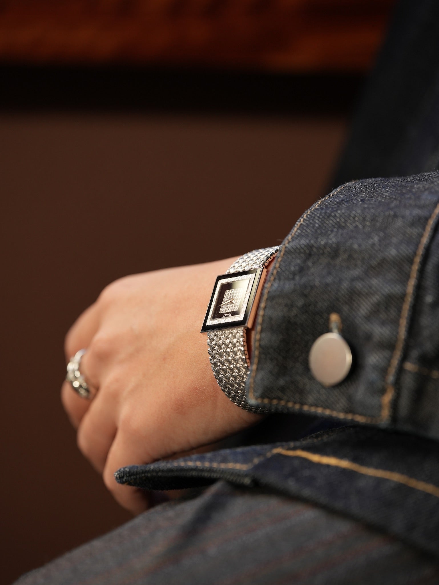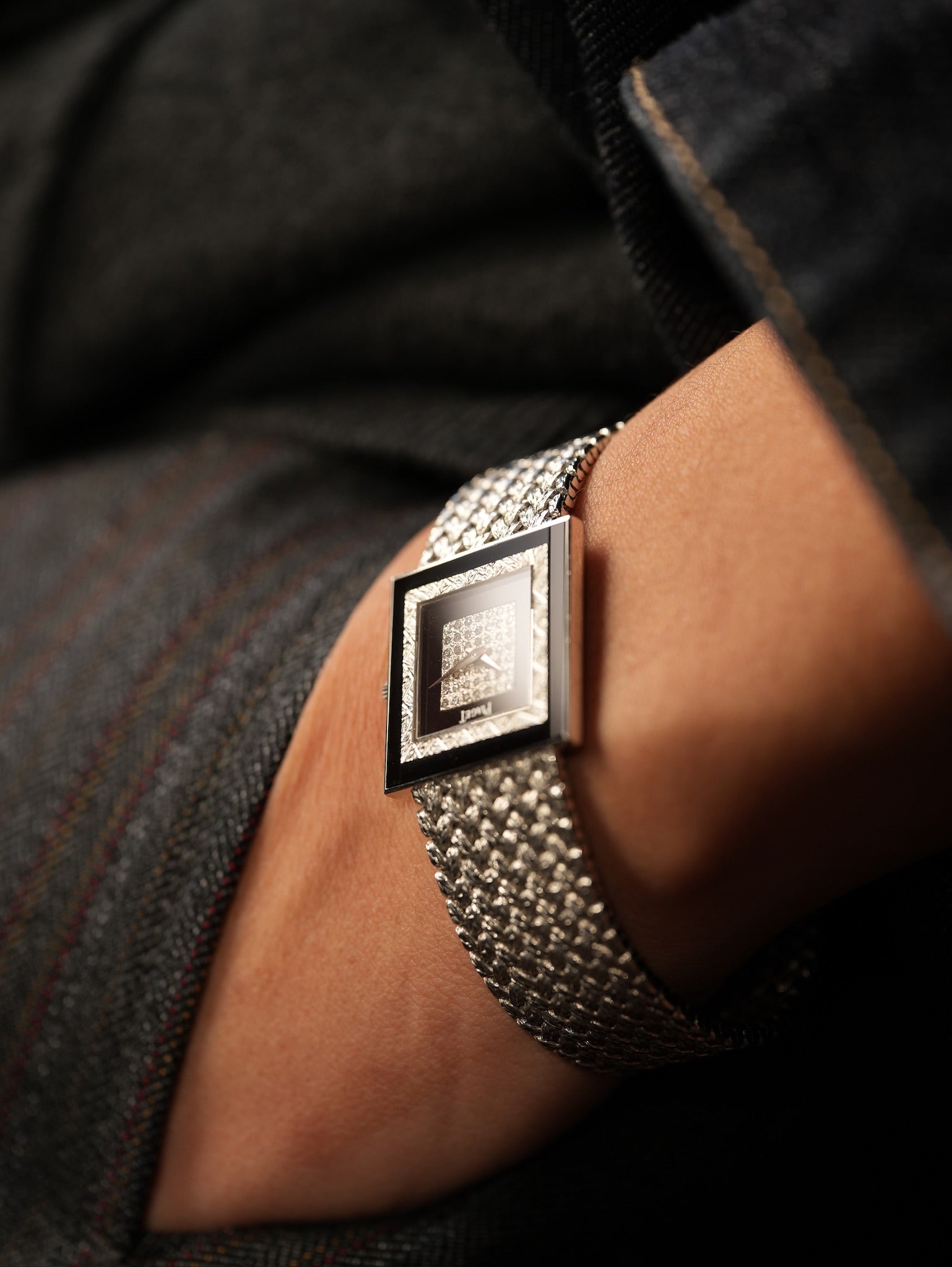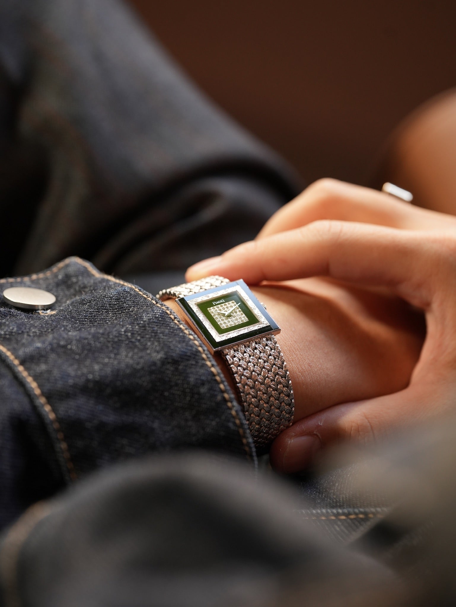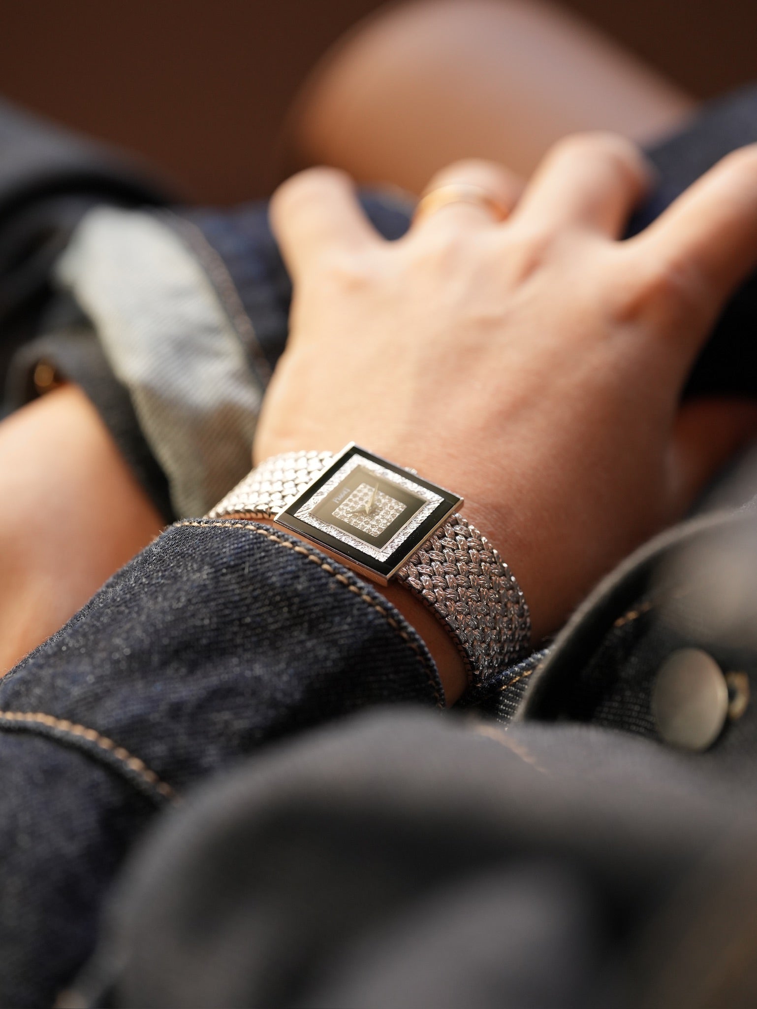 The bracelet is another highlight, crafted with an intricate woven gold design that mimics fine fabric. Unlike traditional link bracelets, this structure offers both visual beauty and exceptional comfort, wrapping around the wrist with a supple, jewelry-like feel. This level of craftsmanship requires extraordinary skill, making it a hallmark of Piaget’s artistry.