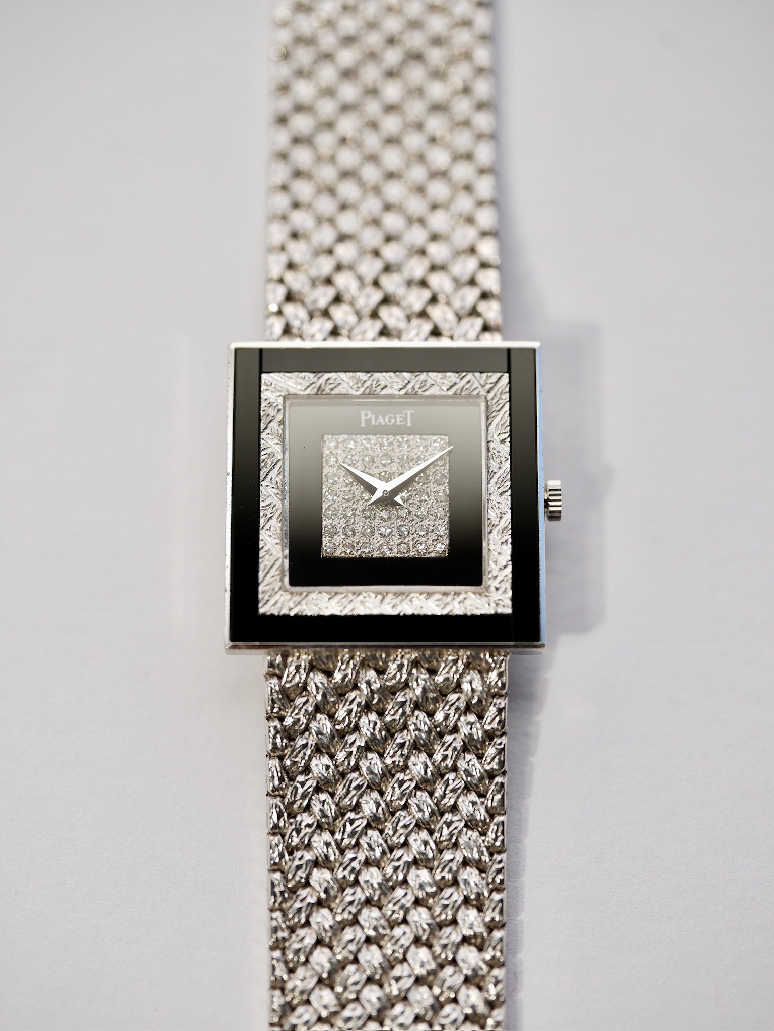The Piaget 9200, introduced in the 1980s, is a masterpiece that blends haute joaillerie and fine watchmaking. One of its most striking features is the onyx dial, which exudes a deep, jet-black elegance. The addition of diamonds enhances its luxurious appeal, while the hand-engraved details on the dial showcase Piaget’s expertise in artisanal craftsmanship. The watch’s nearly square case features refined lines that emphasize its sophisticated aesthetic.