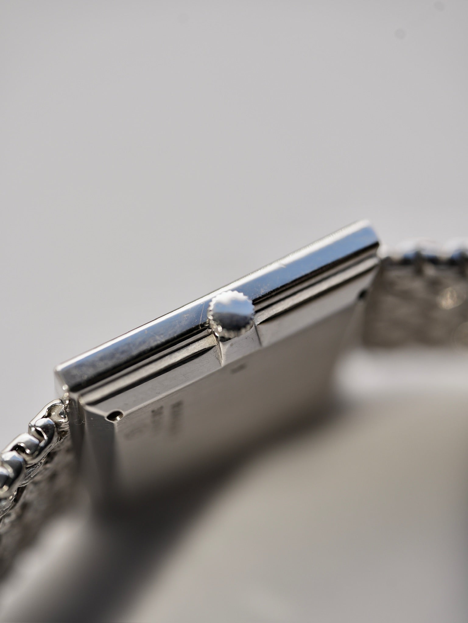 Piaget 9200は、1980年代に登場した、高級宝飾と精緻な時計製造技術が融合した傑作です。最も際立つ特徴は、深い漆黒のエレガンスを放つオニキスダイヤルで、ダイヤモンドのアクセントと手彫りのディテールが、Piagetならではの職人技を物語っています。ほぼ正方形に近いケースは、洗練されたラインでその高雅な美学を強調しています。