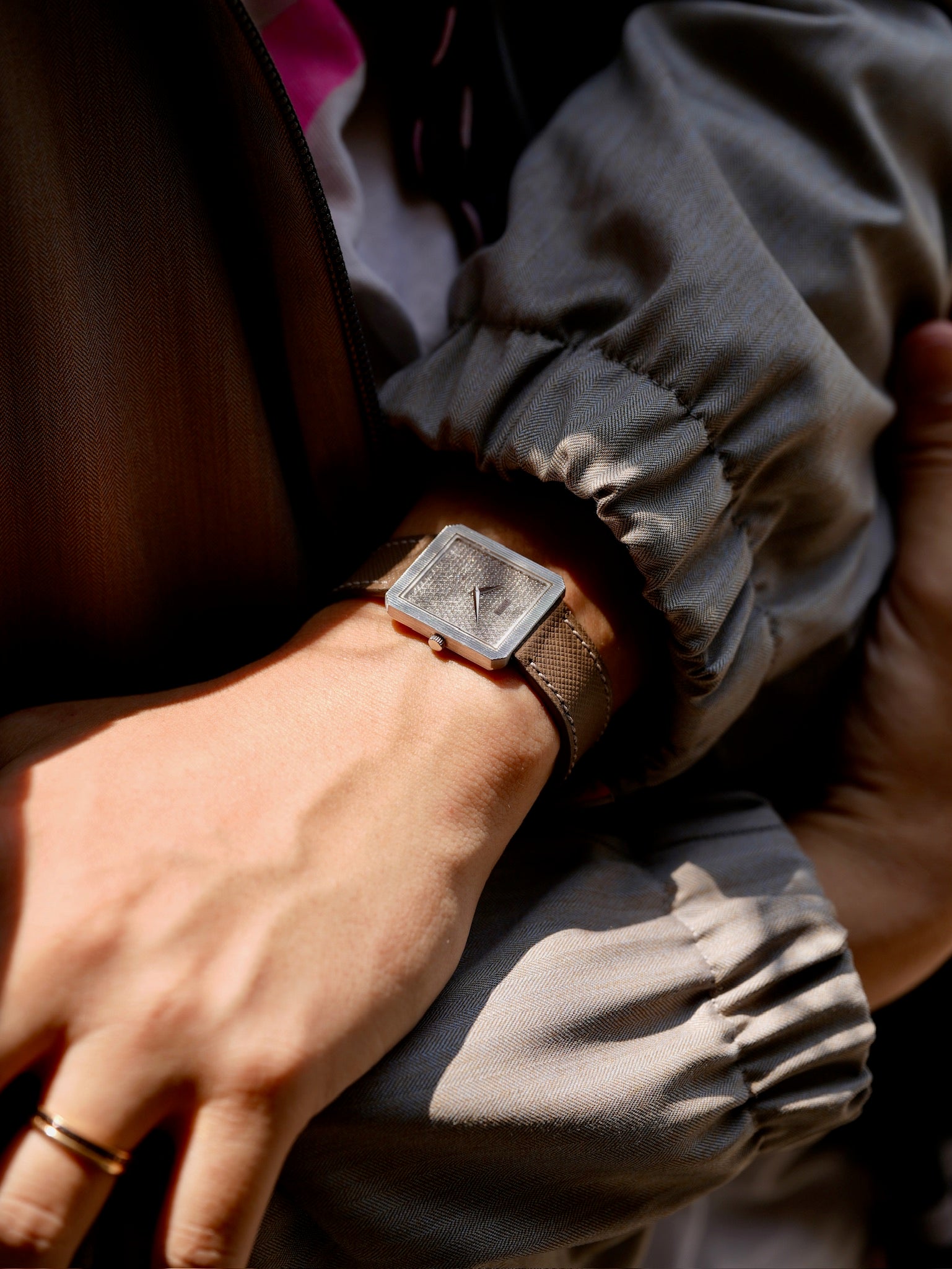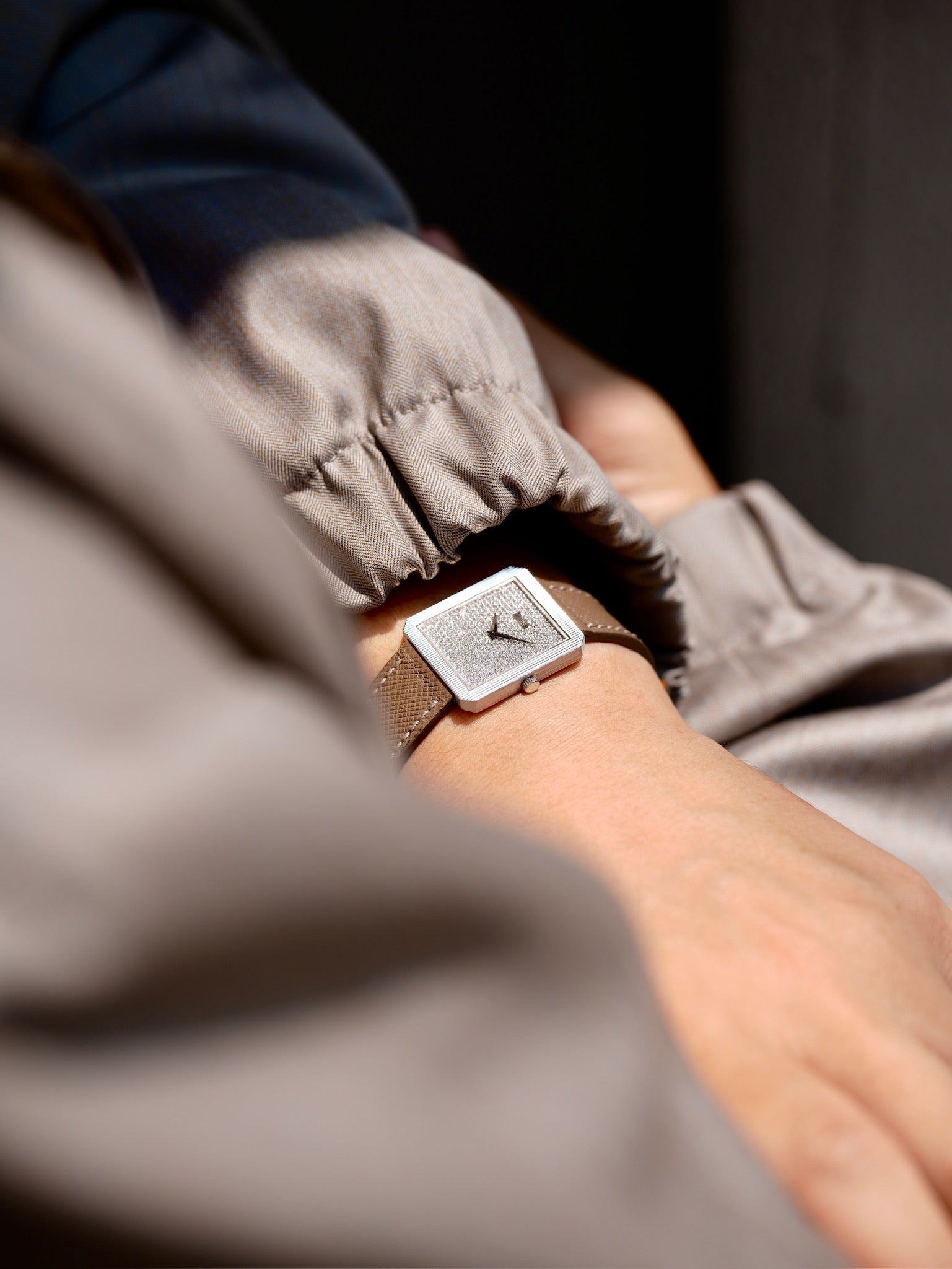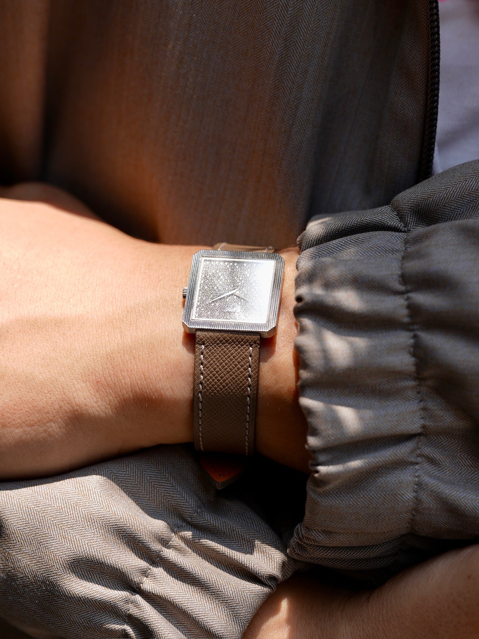 But paired with a matte taupe Saffiano leather strap, the entire piece transforms: