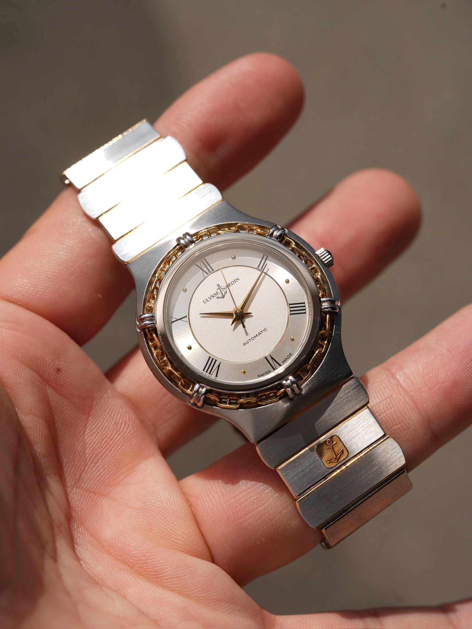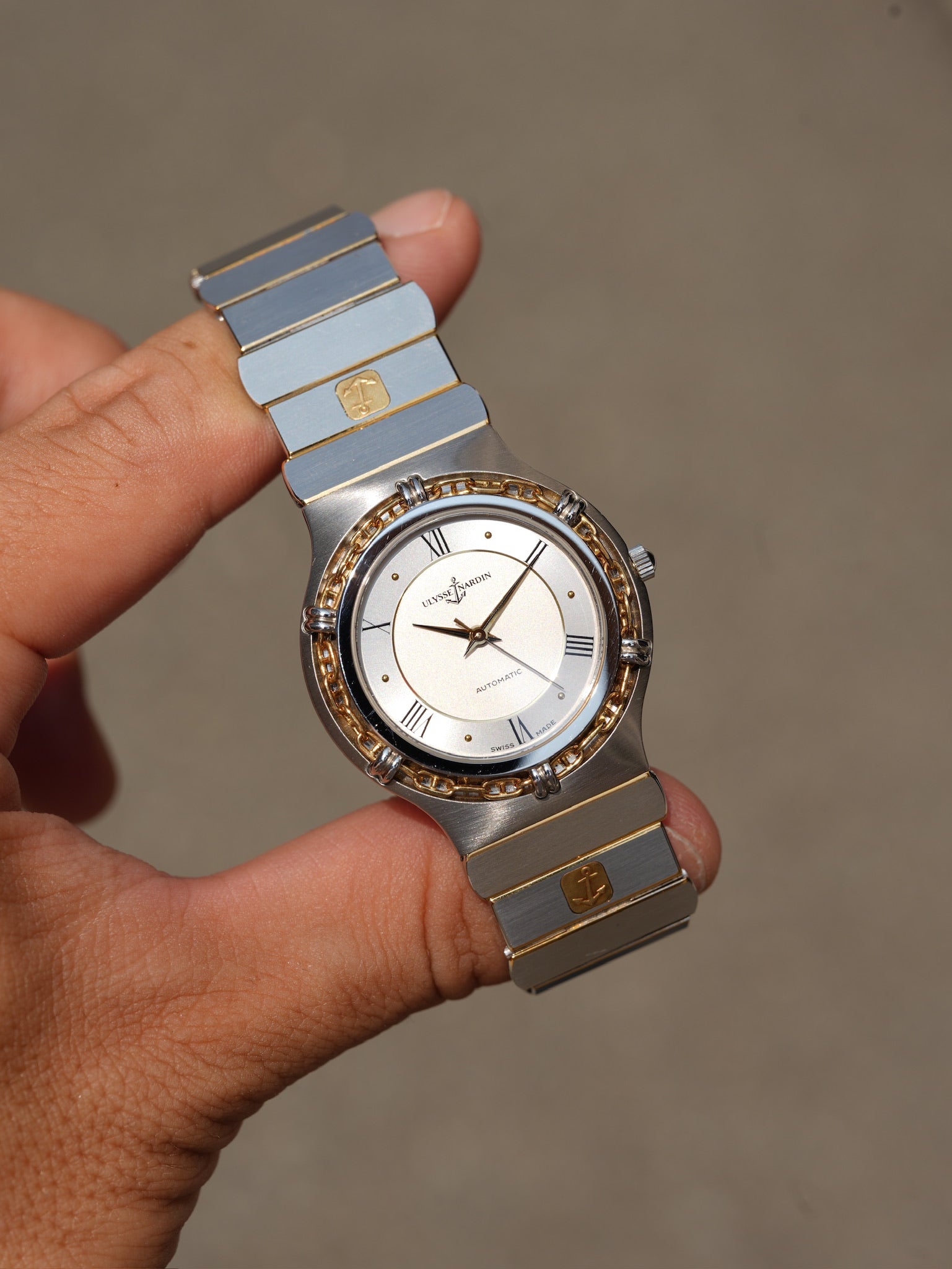 | Brand: Ulysse Nardin Model No.: 134-21 Gender: Men’s Color: Silver / Gold Series: La Chaîne Season: All seasons Material: Stainless Steel / Yellow Gold Size: • Case diameter: approx. 33.5 mm • Wrist size: approx. 17 cm Specifications: • Movement: Automatic |