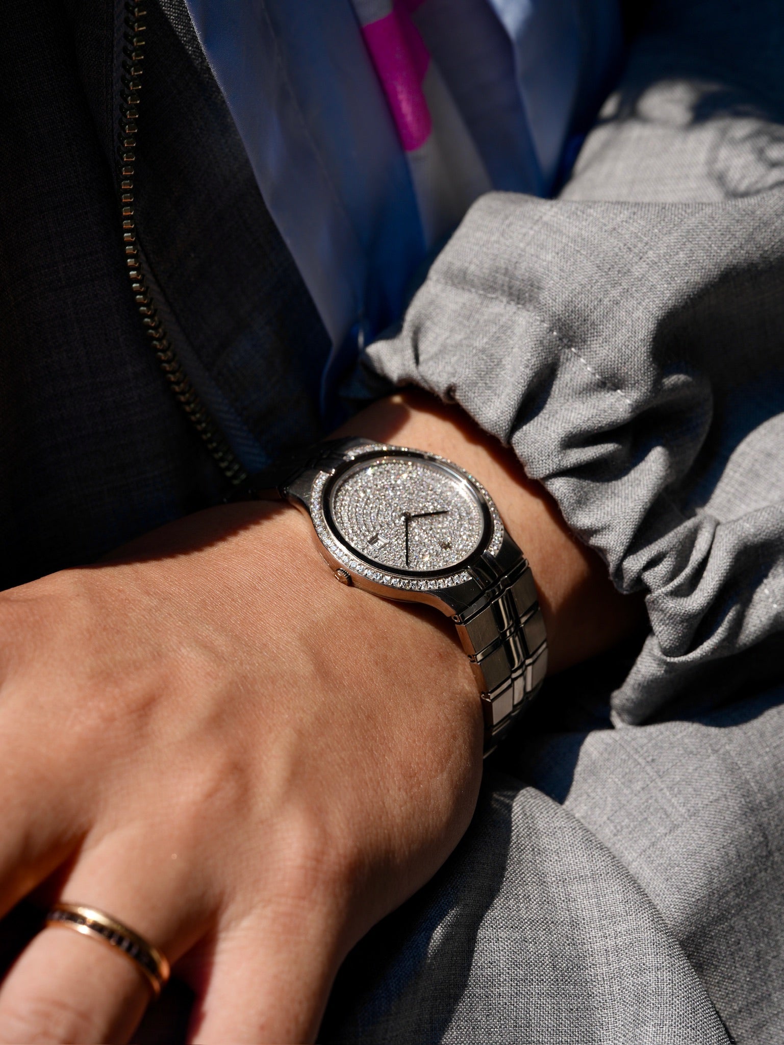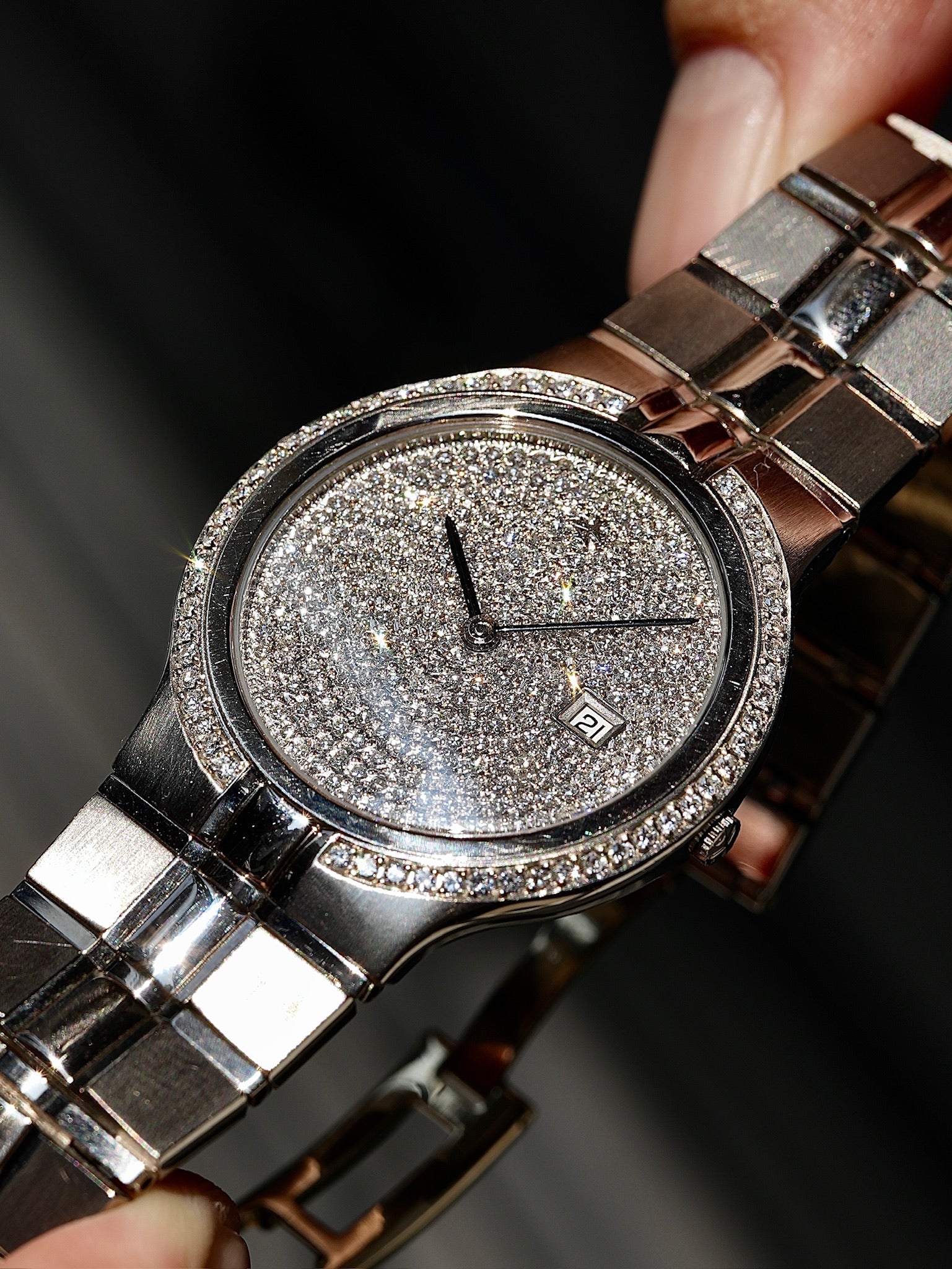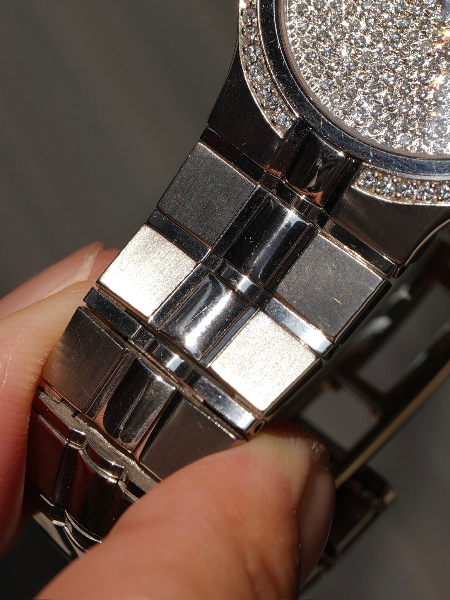| This Vacheron Constantin Phidias Factory Diamond watch is a rare 1990s creation, combining the maison’s watchmaking tradition with the brilliance of jewelry art. Measuring 35mm, crafted in 18K white gold, and powered by an automatic movement, it offers both mechanical substance and luxury. The fully diamond-paved dial, composed of carefully matched brilliant-cut stones, radiates exceptional sparkle. The bezel is also diamond-set, while the cool glow of white gold enhances the brilliance. Unlike many jewelry watches that serve only as ornaments, this Phidias preserves true horological legitimacy with a mechanical heart. The integrated case and bracelet design flows with elegance and comfort. At 35mm, it was bold for its time, yet today it feels ideally suited as a unisex piece. It has presence without excess, striking a refined balance between glamour and sophistication. Within Vacheron Constantin’s history, the Phidias marks a transitional moment. Created during the rise of luxury sports watches, it stood between classical models like the Patrimony and what would later evolve into the Overseas. Its softer curves gave it a distinct identity, and the diamond-set versions were produced only for select clients. Their rarity makes them highly desirable today. The watch also reflects Vacheron’s affinity with elegance and jewelry. The diamonds are not applied for mere extravagance but are integrated into the design, keeping the piece tasteful and timeless. It embodies duality: jewel and watch, luxury statement and horological creation. For collectors, the appeal lies in rarity, material value, and its role in the maison’s story. Since modern Vacheron models rarely echo this style, the Phidias Factory Diamond stands as a true relic of its era—an emblem of 1990s glamour, elevated by enduring refinement. Ultimately, the Vacheron Constantin Phidias 35mm Automatic in 18K White Gold with Factory Diamond Dial and Bezel is not only a timepiece but also a statement of rarity, elegance, and heritage. Bold yet refined, radiant yet discreet, it remains as captivating today as when it left Geneva’s workshops. 【Detail】 90's 18WG Factory diamonds 35mm AT 17cm wrist |