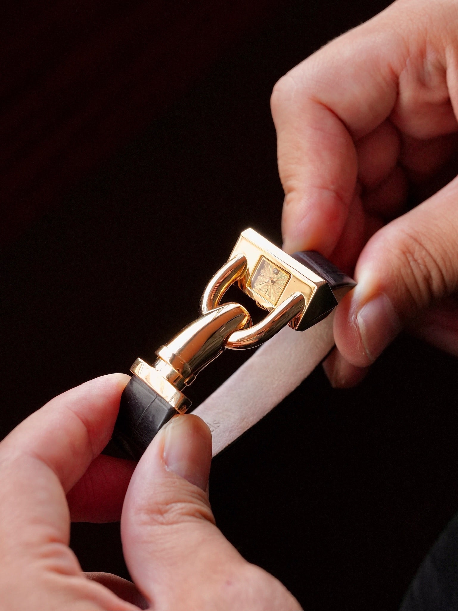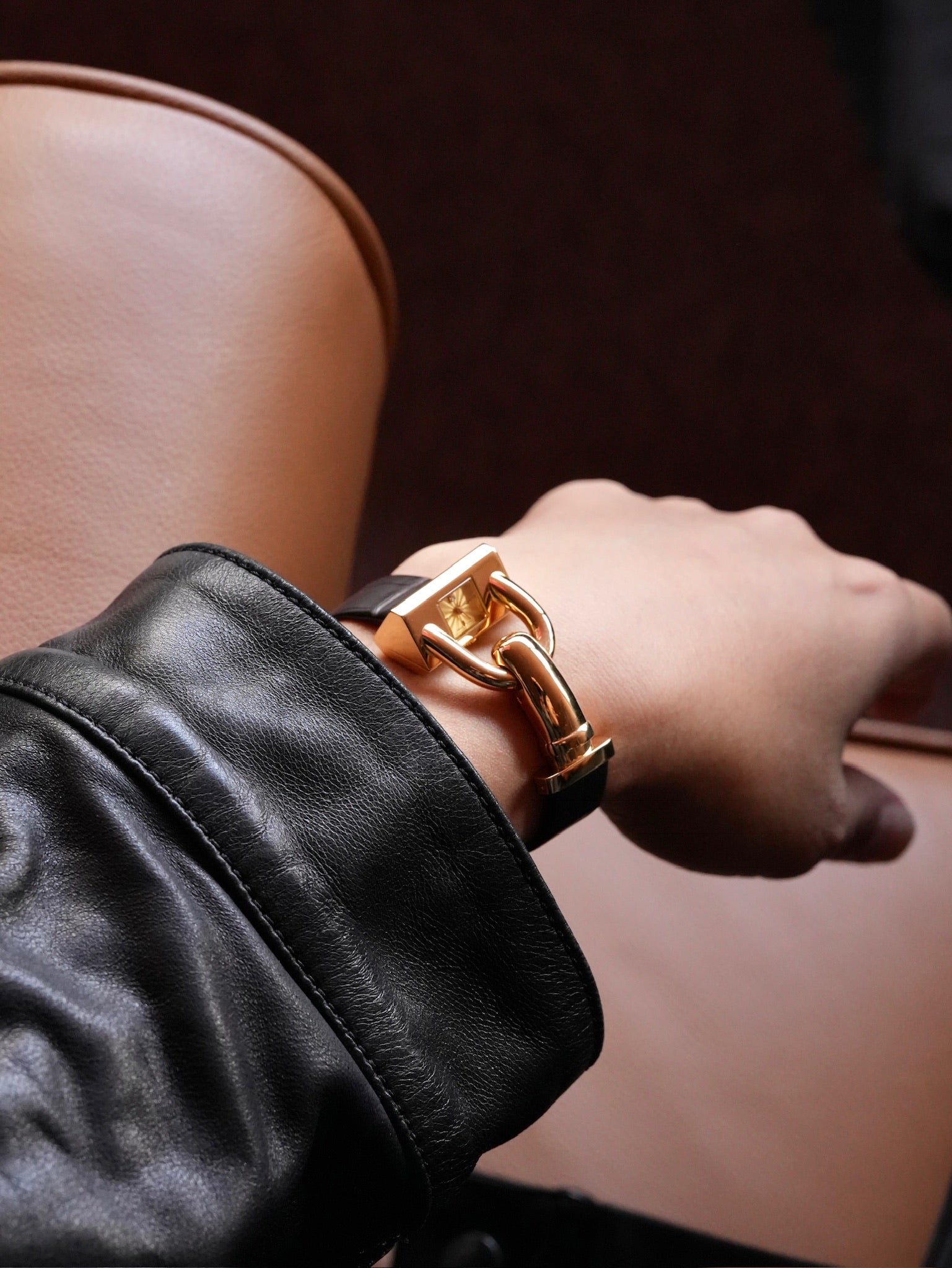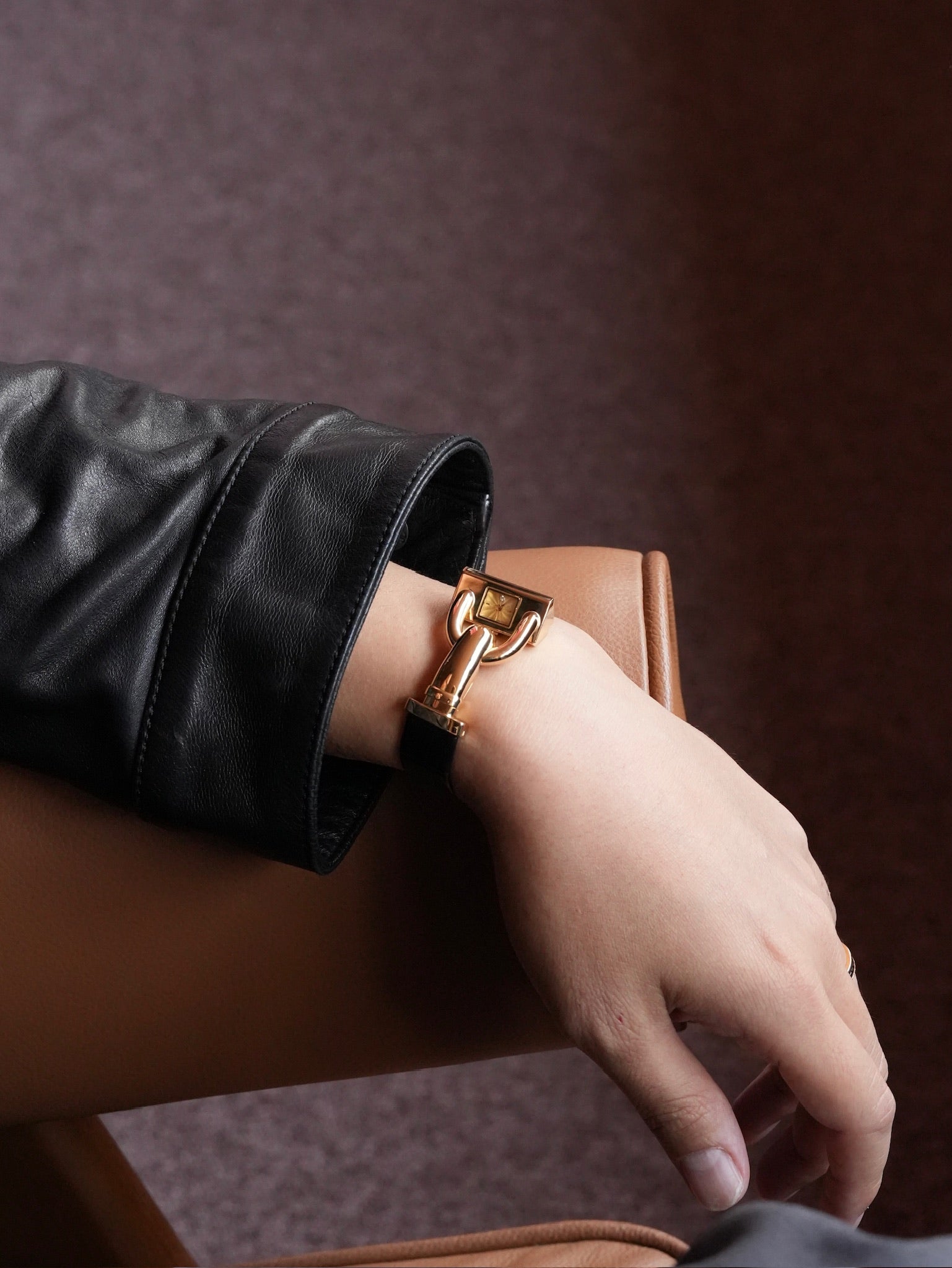 | Van Cleef & Arpels – Cadenas Some watches tell time. Others tell a story. The Cadenas by Van Cleef & Arpels does both—and elevates it with a sculptural form unlike anything else in horology. Originally introduced in 1935, the Cadenas was reissued in the 1990s as a tribute to Van Cleef’s design legacy. Though no longer in production today, this discontinued model continues to captivate collectors and aesthetes alike. With its angled dial and padlock-inspired silhouette, the Cadenas defies conventional watchmaking. It was never meant to be ordinary. Every curve, slope, and surface is deliberate—an architectural composition that reflects light with depth and dimensionality. Its presence on the wrist feels more like wearable sculpture than traditional timepiece. Its beauty lies in restraint. Instead of heavy gem-setting, it features a single brilliant-cut diamond at 12 o’clock—just one, placed with intention. This minimalist accent adds subtle sparkle while preserving a clean, gender-neutral elegance that suits both men and women. Though designed as a women’s watch, the Cadenas effortlessly crosses boundaries. Swap in a custom strap—black leather, textured suede, or a neutral tone—and it becomes a bold, genderless accessory. It’s not just adaptable. It’s transformative. Powered by a quartz movement, it offers daily ease and precision. No winding. No maintenance fuss. Just reliable timekeeping, wrapped in timeless artistry. Its solid 18K gold case adds satisfying weight and warmth, enhancing not just the visual impression but the tactile experience. This is a watch you feel as much as see—substantial, quiet, and undeniably refined. There are no copies. No alternatives. The Cadenas is singular in vision, form, and execution. Discreet yet bold. Playful yet intellectual. Practical yet poetic. A discontinued icon that still feels like the future. 【Detail】 00's 18PG QZ 16cm wrist (changeble belt) Excellent condition Unisex |