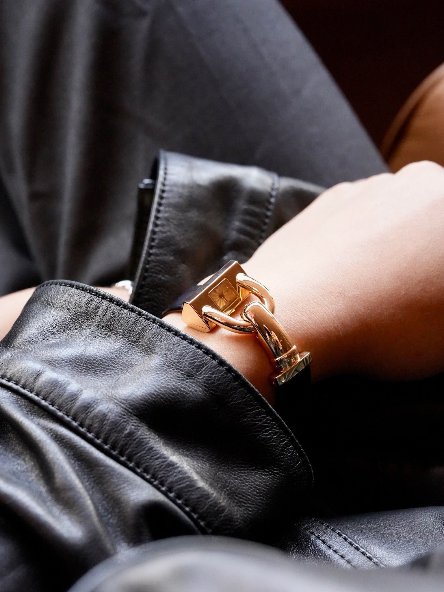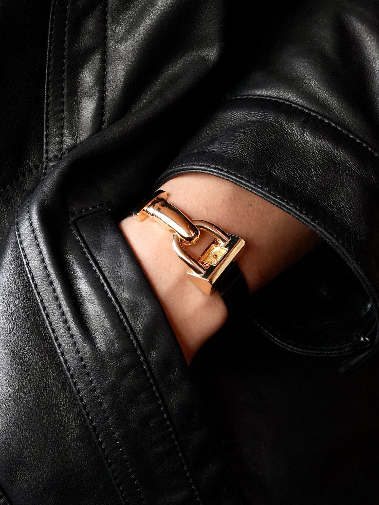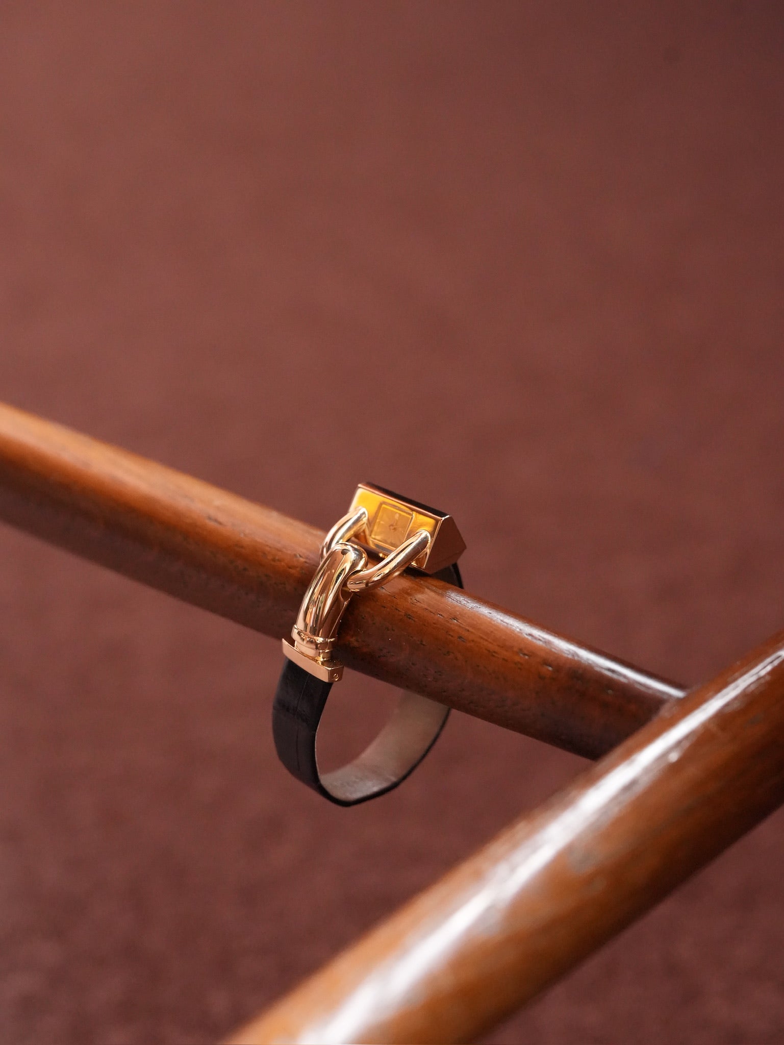 | Van Cleef & Arpels – Cadenas Some watches tell time. Others tell a story. The Cadenas by Van Cleef & Arpels does both—and elevates it with a sculptural form unlike anything else in horology. Originally introduced in 1935, the Cadenas was reissued in the 1990s as a tribute to Van Cleef’s design legacy. Though no longer in production today, this discontinued model continues to captivate collectors and aesthetes alike. With its angled dial and padlock-inspired silhouette, the Cadenas defies conventional watchmaking. It was never meant to be ordinary. Every curve, slope, and surface is deliberate—an architectural composition that reflects light with depth and dimensionality. Its presence on the wrist feels more like wearable sculpture than traditional timepiece. Its beauty lies in restraint. Instead of heavy gem-setting, it features a single brilliant-cut diamond at 12 o’clock—just one, placed with intention. This minimalist accent adds subtle sparkle while preserving a clean, gender-neutral elegance that suits both men and women. Though designed as a women’s watch, the Cadenas effortlessly crosses boundaries. Swap in a custom strap—black leather, textured suede, or a neutral tone—and it becomes a bold, genderless accessory. It’s not just adaptable. It’s transformative. Powered by a quartz movement, it offers daily ease and precision. No winding. No maintenance fuss. Just reliable timekeeping, wrapped in timeless artistry. Its solid 18K gold case adds satisfying weight and warmth, enhancing not just the visual impression but the tactile experience. This is a watch you feel as much as see—substantial, quiet, and undeniably refined. There are no copies. No alternatives. The Cadenas is singular in vision, form, and execution. Discreet yet bold. Playful yet intellectual. Practical yet poetic. A discontinued icon that still feels like the future. 【Detail】 00's 18PG QZ 16cm wrist (changeble belt) Excellent condition Unisex |